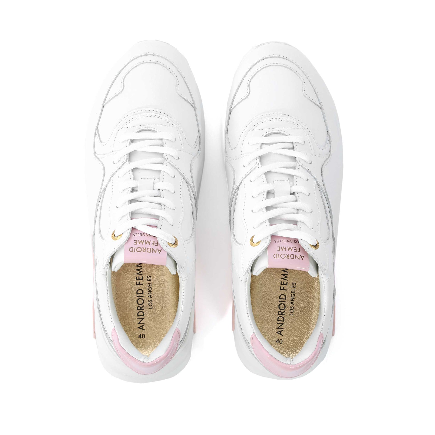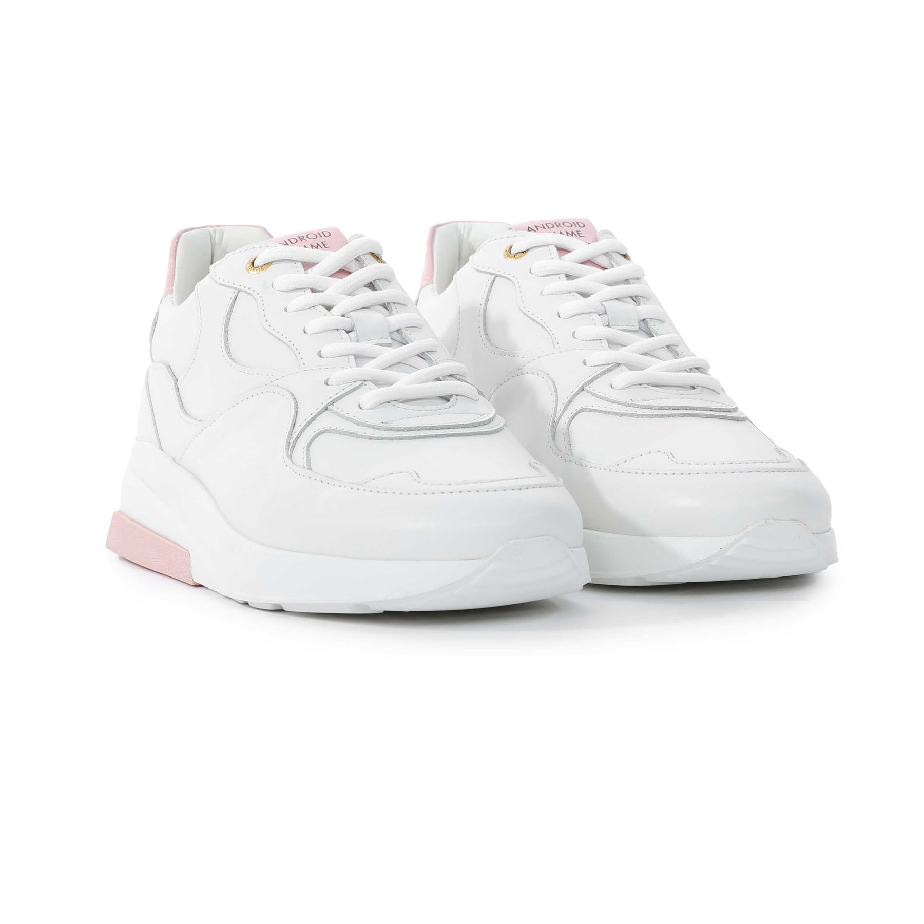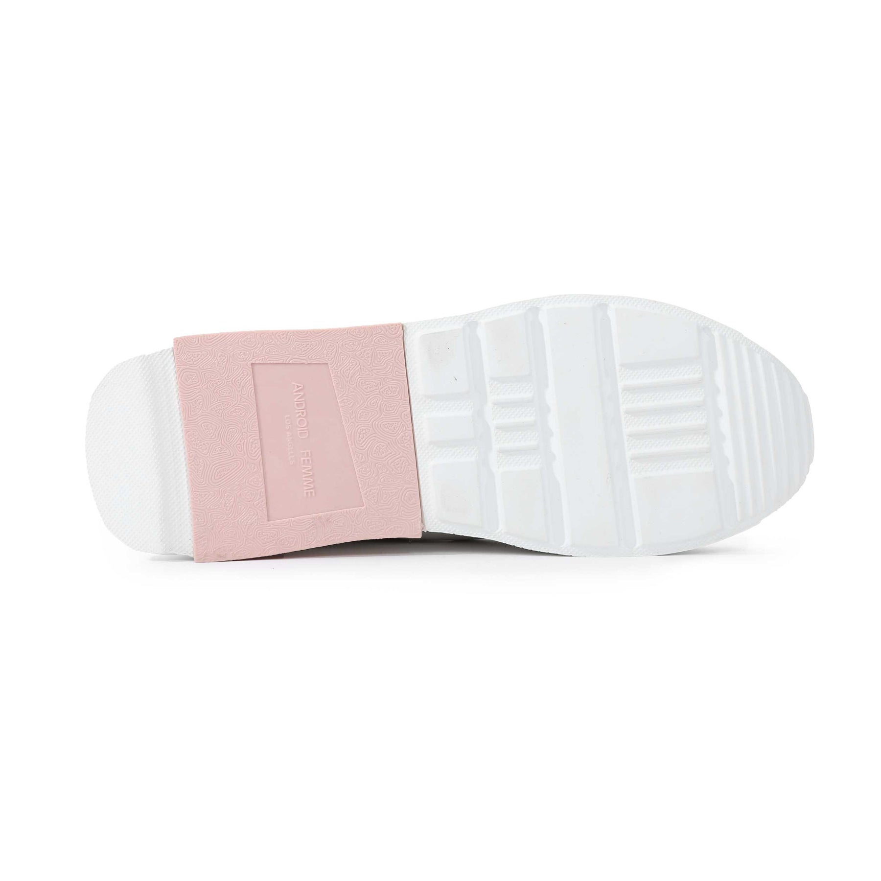 Android Homme Malibu Trainer in White & Pink. Luxury trainers by Android Homme. This Android Homme trainer arrives with a thick sole and a sporty look. Pink detailing to the trainer. Finished off with 7 hole eyelets and Android Homme logo on the tongue and side panel of the trainer.