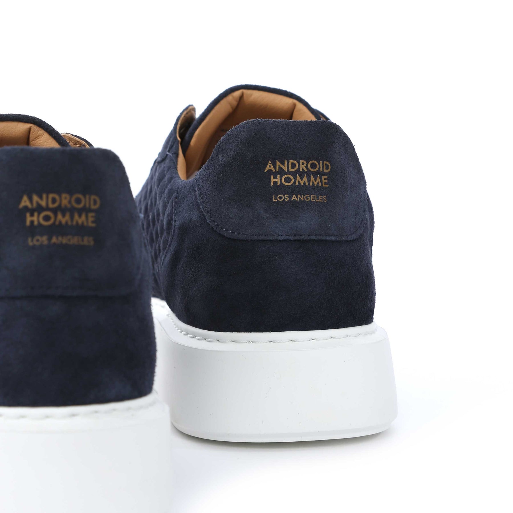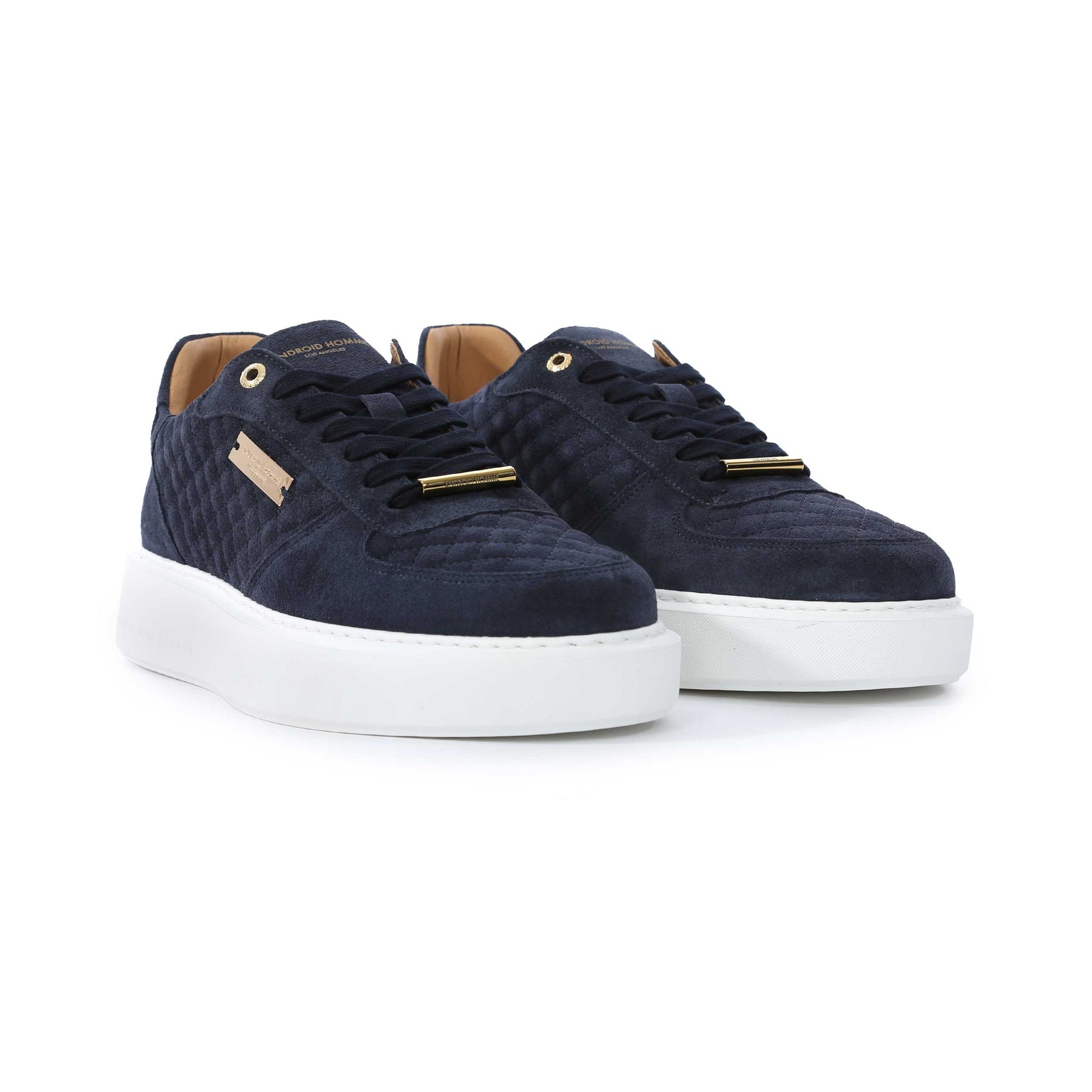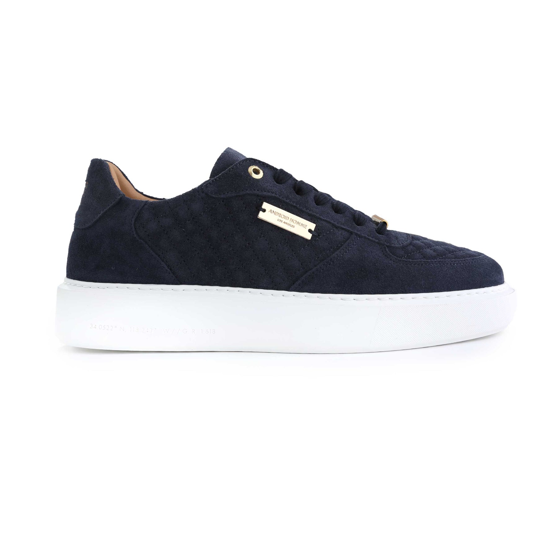 Android Homme Manhattan Quilted Suede Trainer in Navy. Luxury trainers by Android Homme. This Android Homme trainer arrives with suede upper panels. Quilted design panels to the trainer. A simplistic yet elegant trainer with a contrasting colour sole. Finished off with 7 hole eyelets and D-rings. Android Homme logo tab to the tongue and logo badge to the side panel.