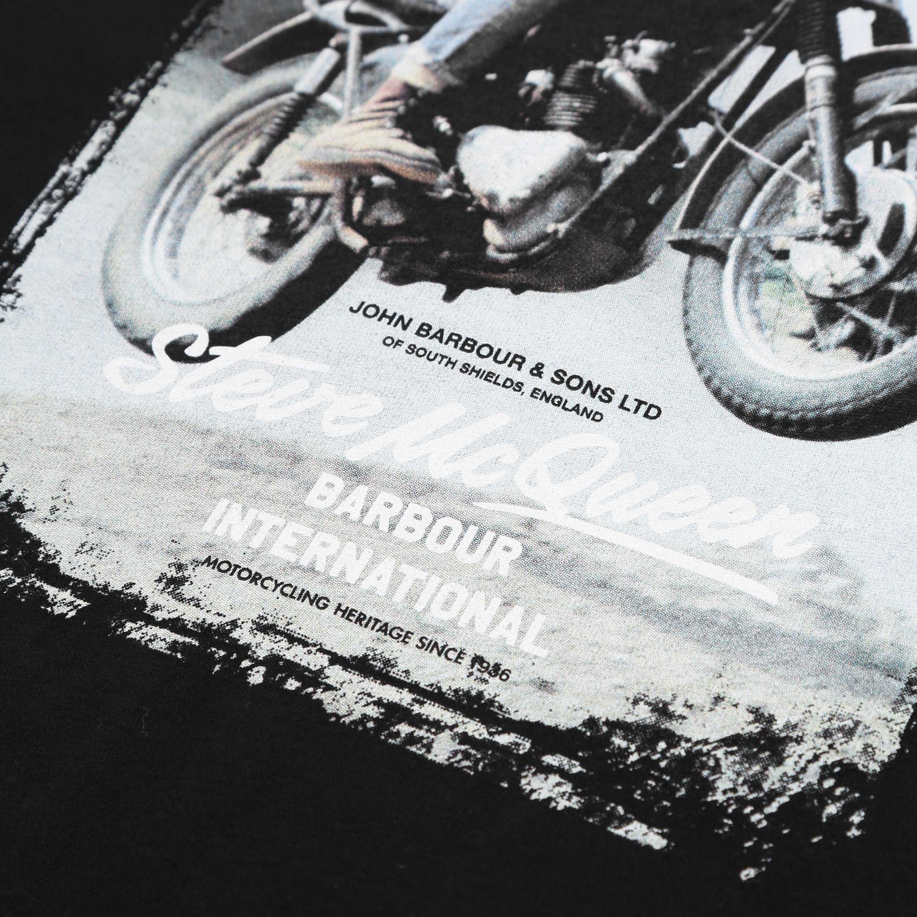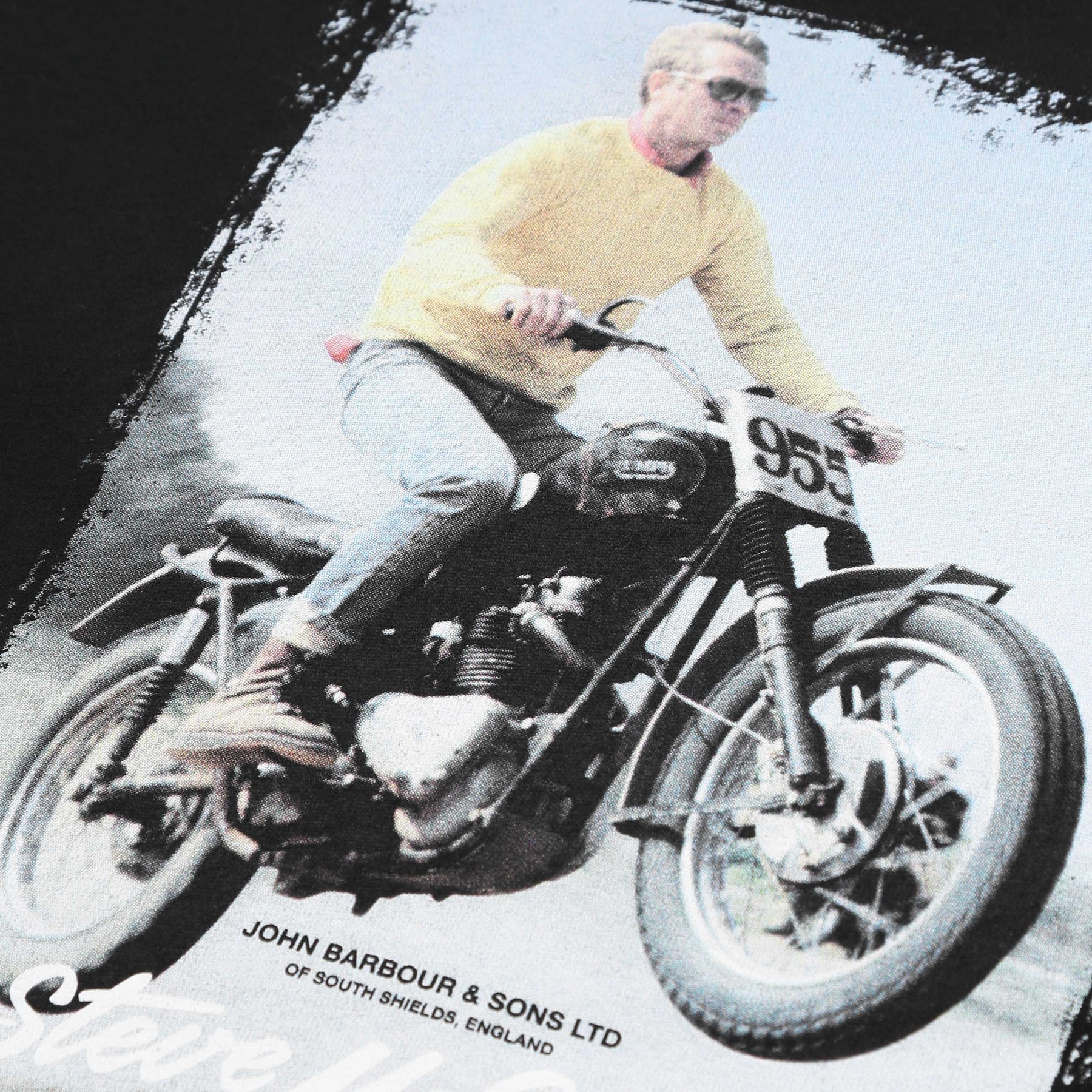 Barbour Coster SMQ Graphic T Shirt in Black. Crew neck t shirt by Barbour. This short-sleeve Coster Graphic T-Shirt features a Steve McQueen graphic from the ISDT. Crafted from 100% cotton, it offers premium comfort and breathability, making it a perfect choice for everyday wear.