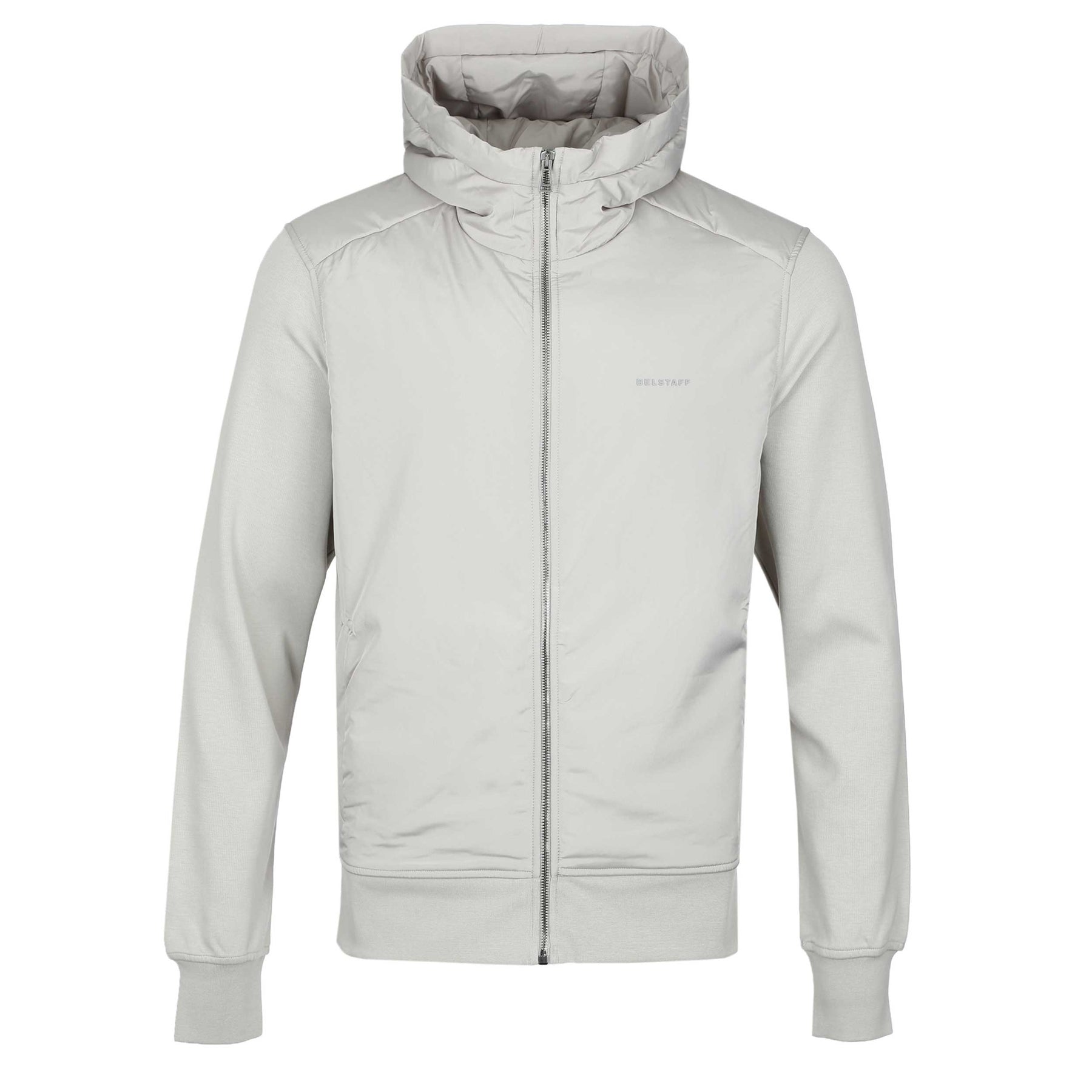 Belstaff Alloy Zip Thru Hoody Sweat Top in Cement Grey. A zip up cardigan by Belstaff. A versatile piece featuring a nylon front panel and hood. Cotton sleeves and back panel. Full zip fastening front with a hood. Silicone Belstaff logo to the chest. Press stud fastening pockets to the waist,