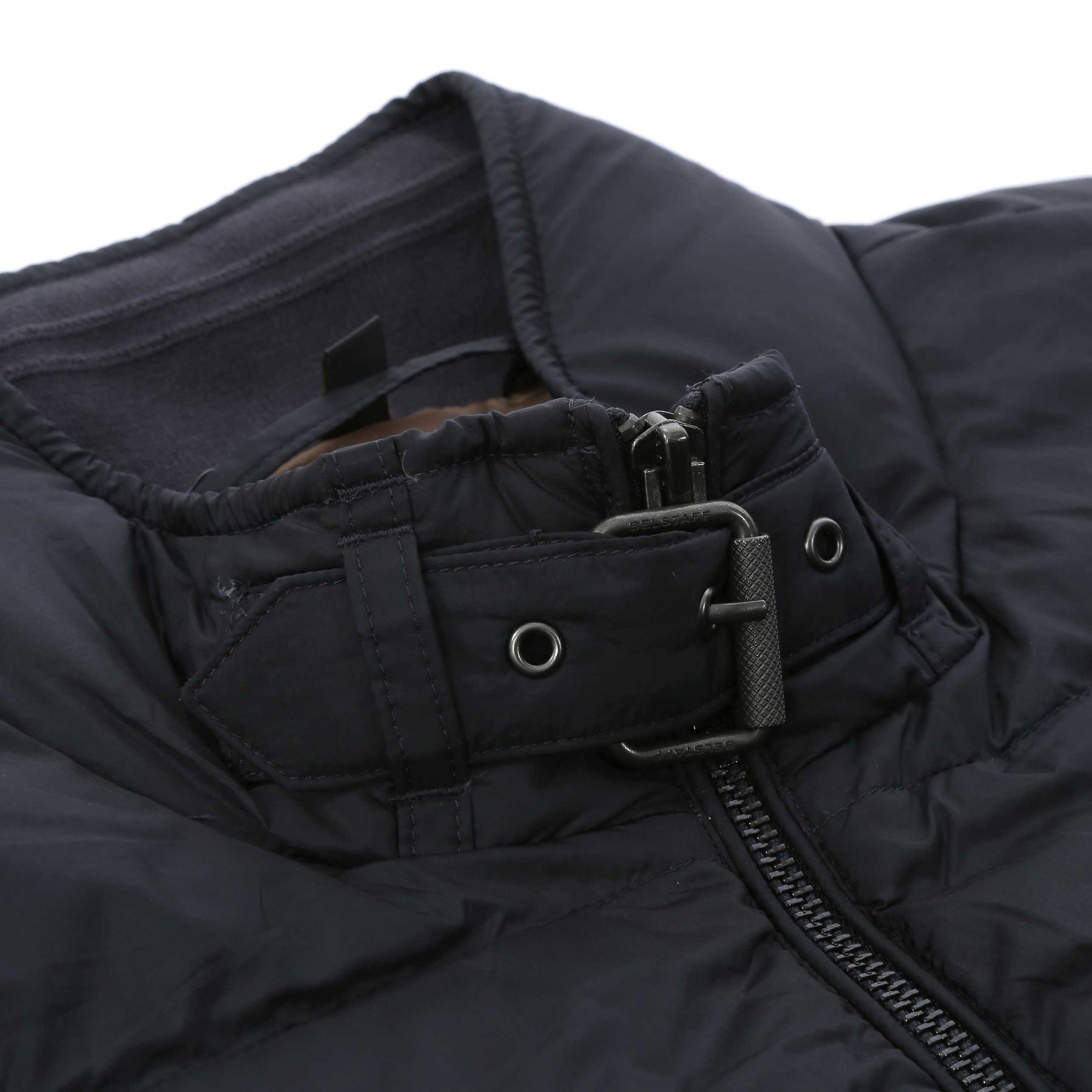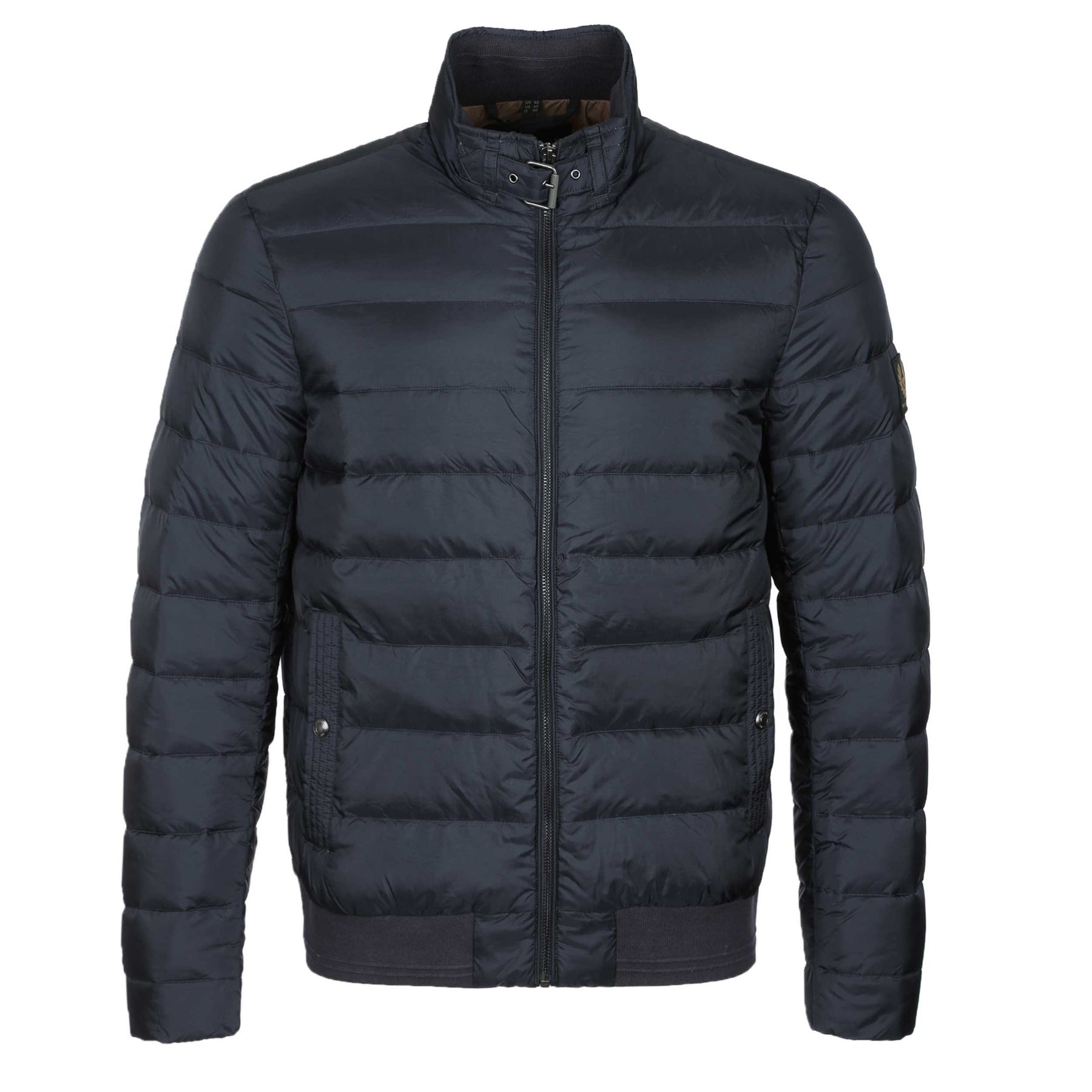 Belstaff Circuit Jacket in Dark Ink. A lightweight puffer jacket by Belstaff. Featuring a full zip fastening, adjustable collar with buckle and 2 front pockets. Finished with the Belstaff logo on the left arm. Perfect to layer with a Belstaff t-shirt.