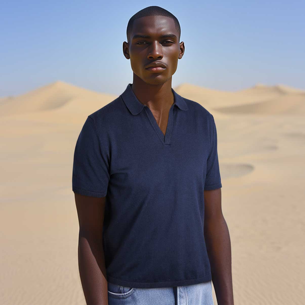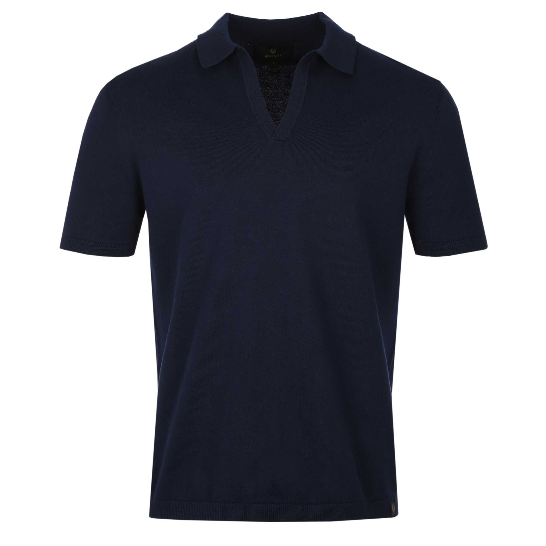 Belstaff Coast Knitted Polo Shirt in Dark Ink. Knitted polo shirt by Belstaff. This Belstaff polo arrives with a skipper collar. Plain design with a Belstaff logo tab to the waistband. Ribbed Collar and waistband. Perfect for everyday wear.