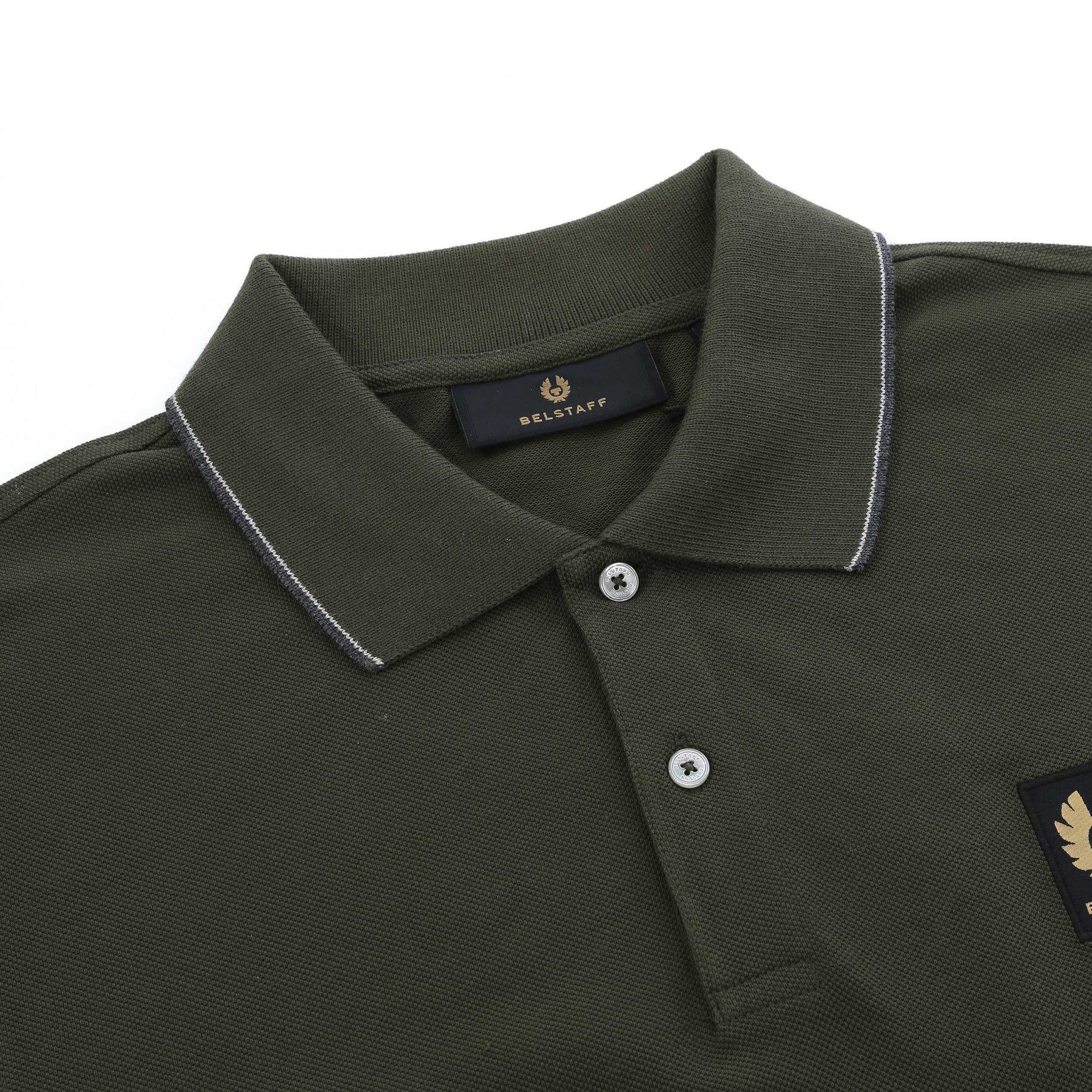 Belstaff Double Tipped Polo Shirt in Tile Green. A classic polo shirt by Belstaff. Featuring a 2 button fastening placket with the signature Belstaff patch logo on the chest. Contrasting dual colour trim to the collar and cuffs. Perfect for everyday wear.