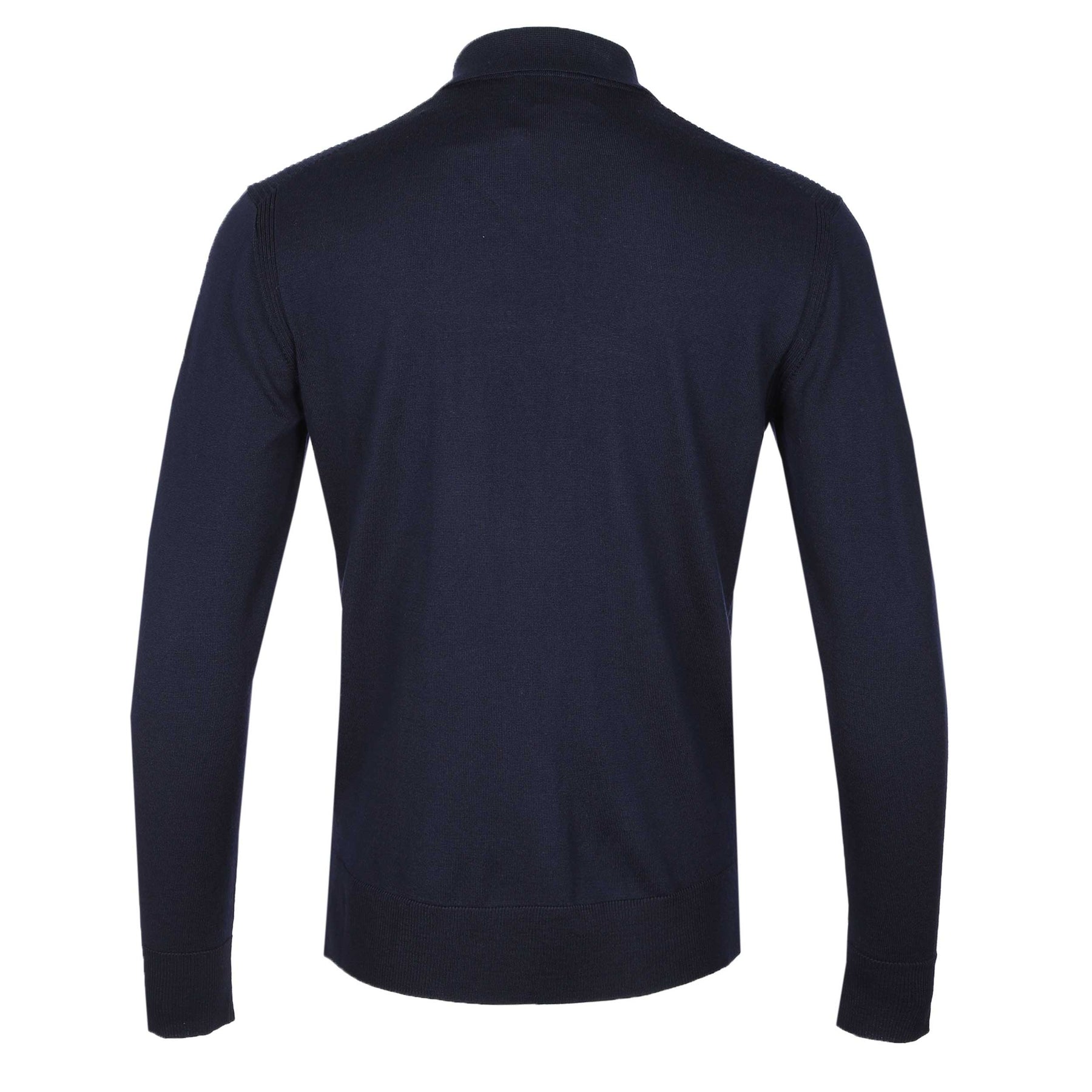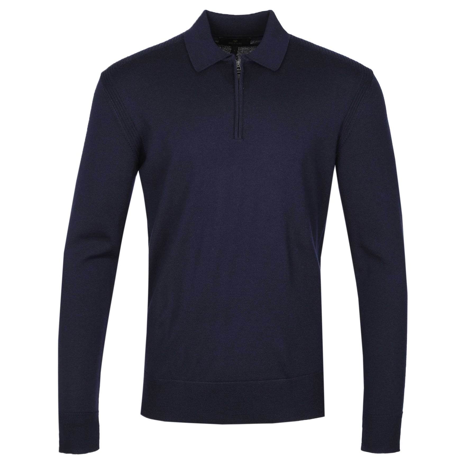 Belstaff Kyle Polo Knitwear in Dark Ink. A half zip polo by Belstaff crafted from an extra fine merino wool. Featuring long sleeves, a classic collar and zip placket. Rib shoulder detailing with ribbed cuffs and waistband. Belstaff logo badge to the sleeve.