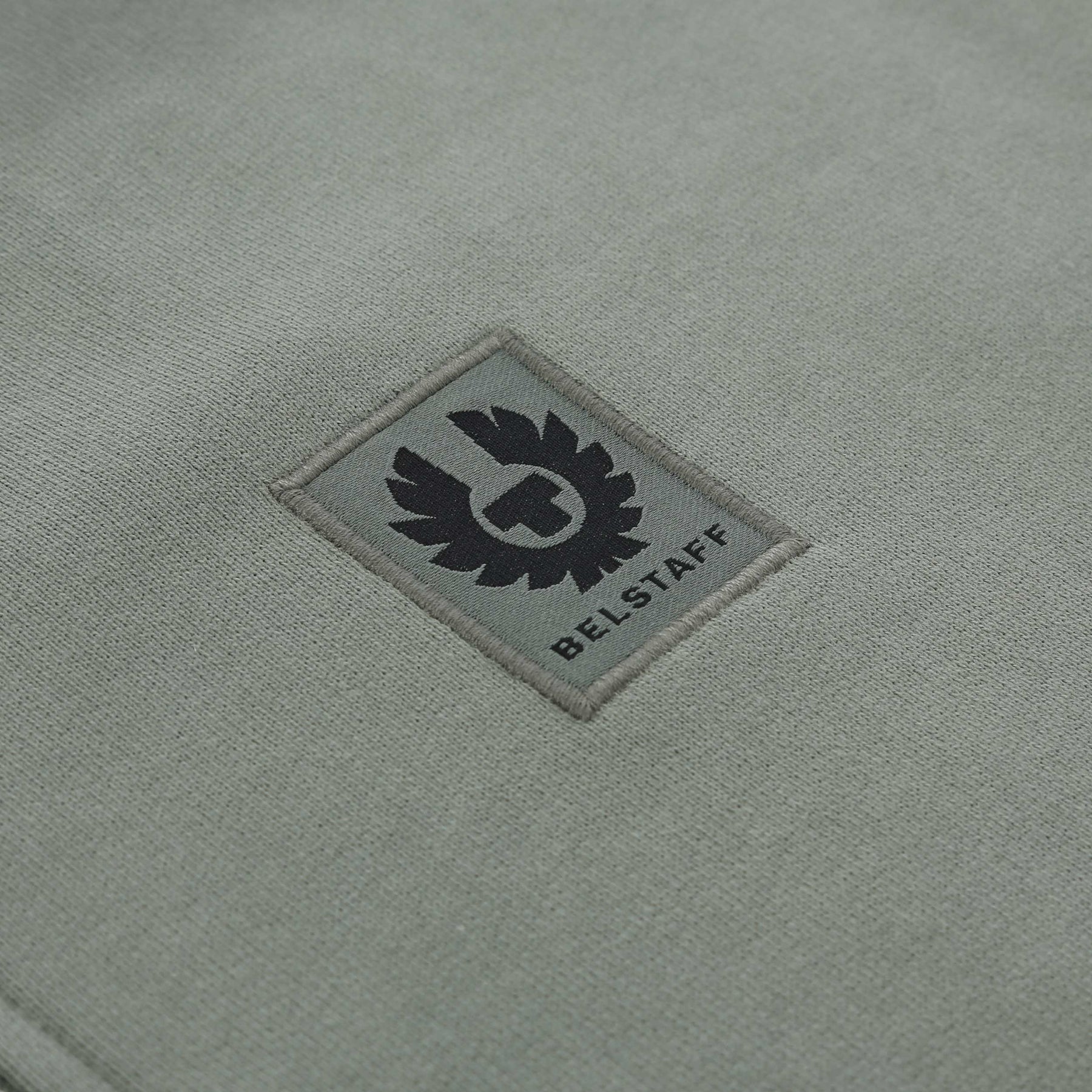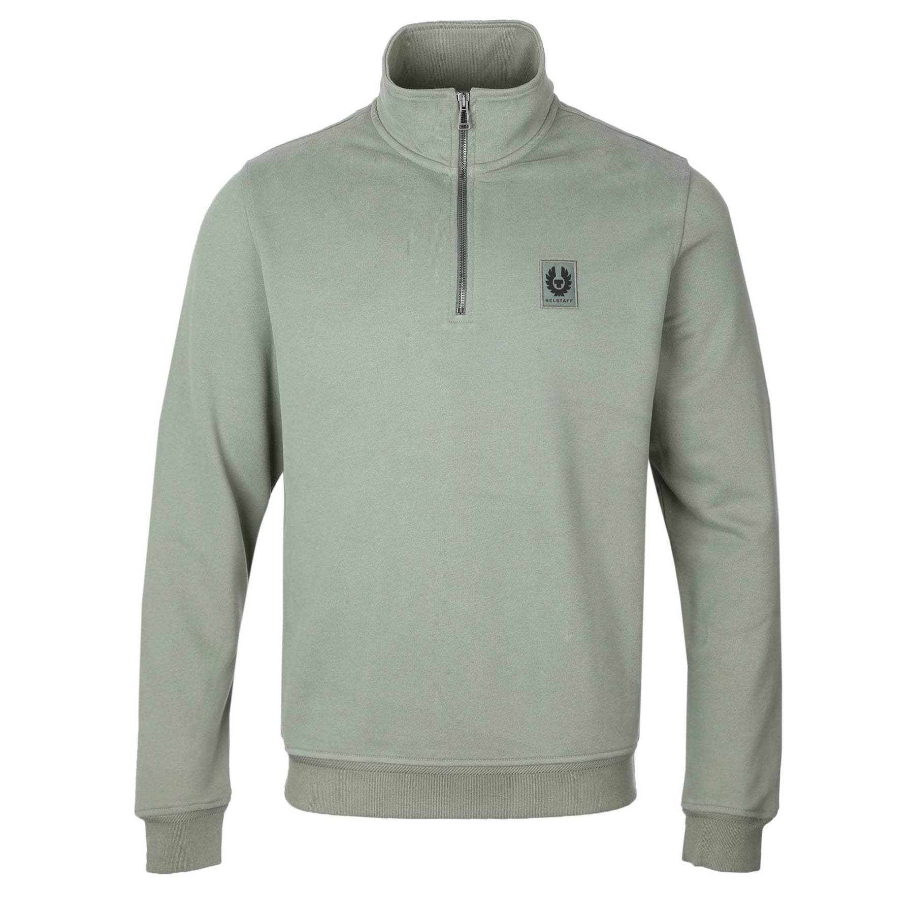 Belstaff Quarter Zip Sweat Top in Sage Green. A quarter zip sweat top featuring a funnel neck collar which can be worn flat or zipped up. Ribbed cuffs and waistband. Finished with the signature Belstaff logo badge on the chest. Team up with sweat pants or jeans.