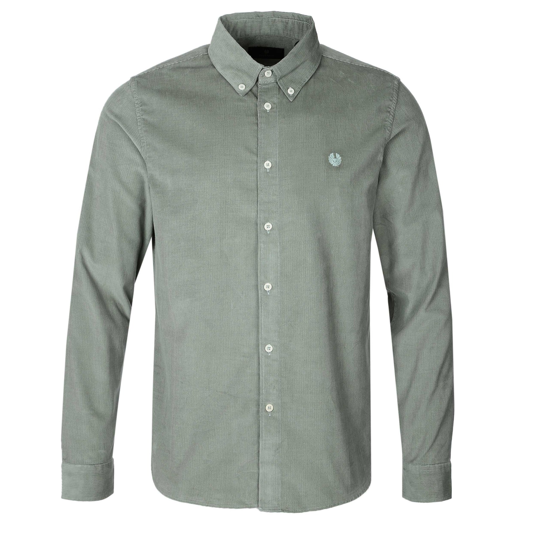 Belstaff Street Shirt in Sage Green. A regular fit shirt by Belstaff. Crafted from a fine corduroy, this shirt features a full button fastening placket. This corduroy shirt has a button down collar. Finished with an embroidered Belstaff phoenix logo to the chest. Perfect shirt to layer up with a Belstaff t-shirt.