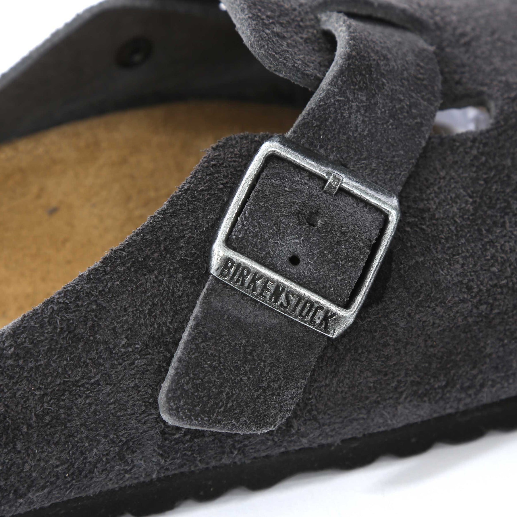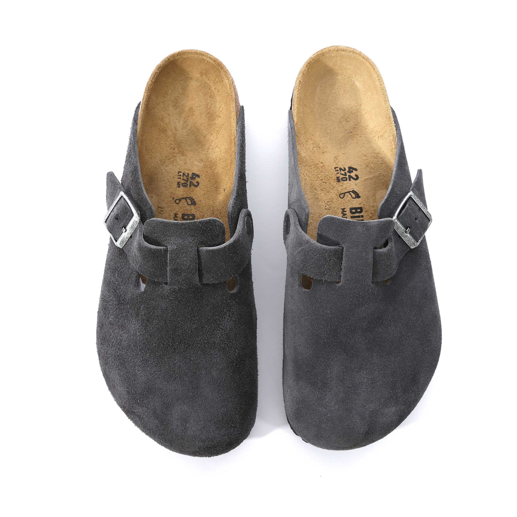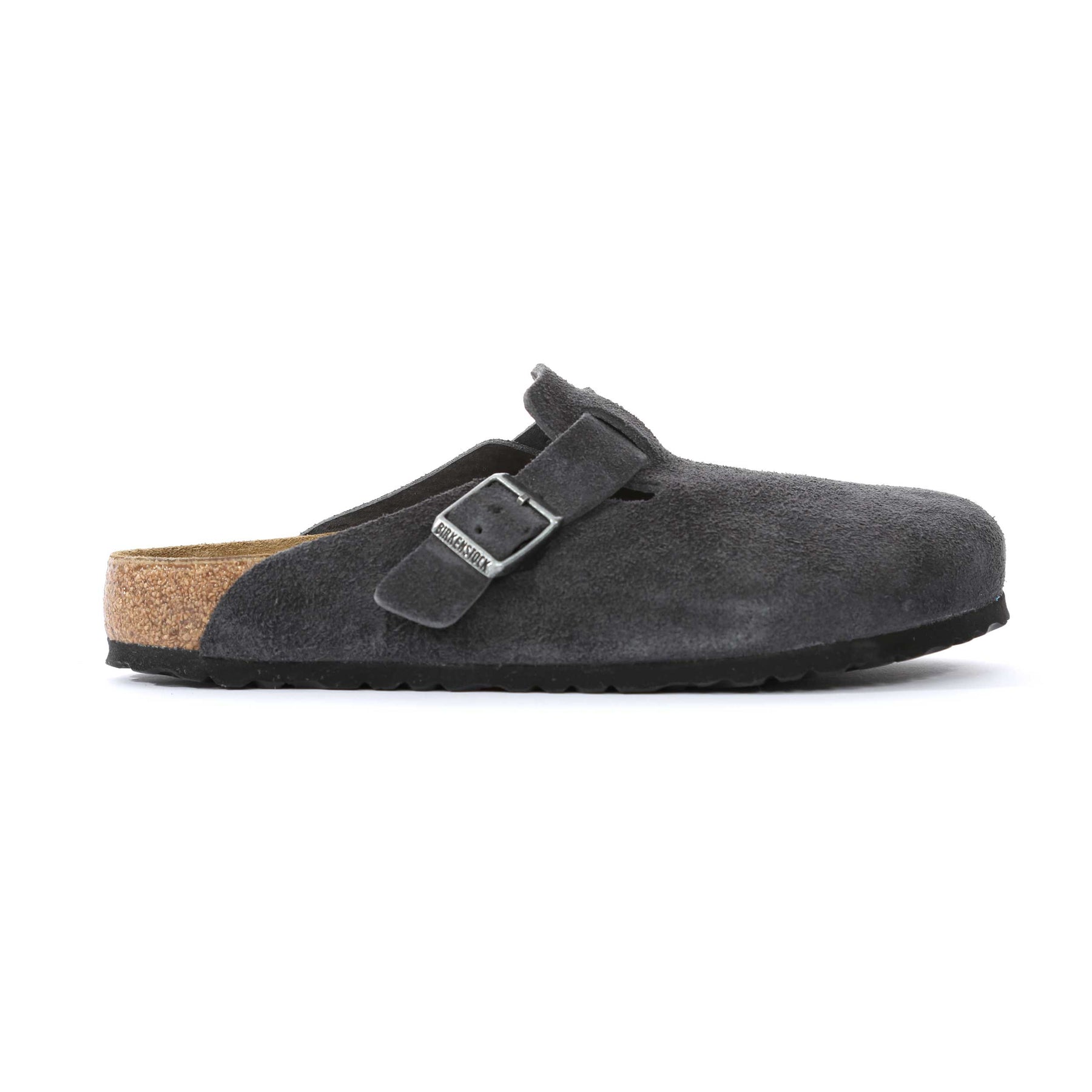 Birkenstock Boston Clogs in Charcoal. The Boston Clogs is a true footwear icon, renowned for its timeless design and exceptional comfort. Versatile enough to be worn throughout the year, this classic clog combines distinctive style with the legendary comfort that Birkenstock is known for. Crafted from suede leather, the upper features a natural open-selvage finish that gives each pair a unique, rugged character while enhancing durability. Inside, the signature anatomically shaped cork-latex footbed adapts to the shape of your foot over time, delivering personalised support and all-day comfort.