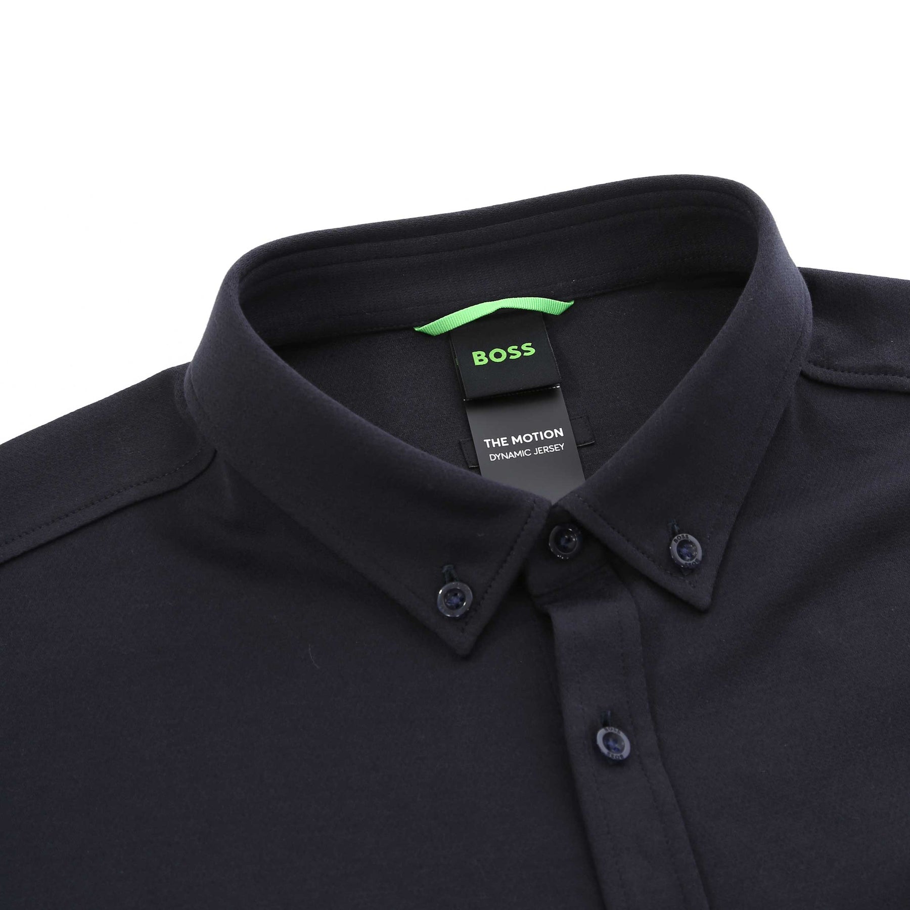 BOSS B Motion L Shirt in Dark Blue. A long sleeve Hugo Boss shirt in a regular fit. Featuring button down collar and a contrasting colour embroidered BOSS logo to the chest. Adjustable button fastening cuffs. The shirt is constructed with a 4 way stretch, moisture-wicking cotton, keep you feeling cool and fresh all day.