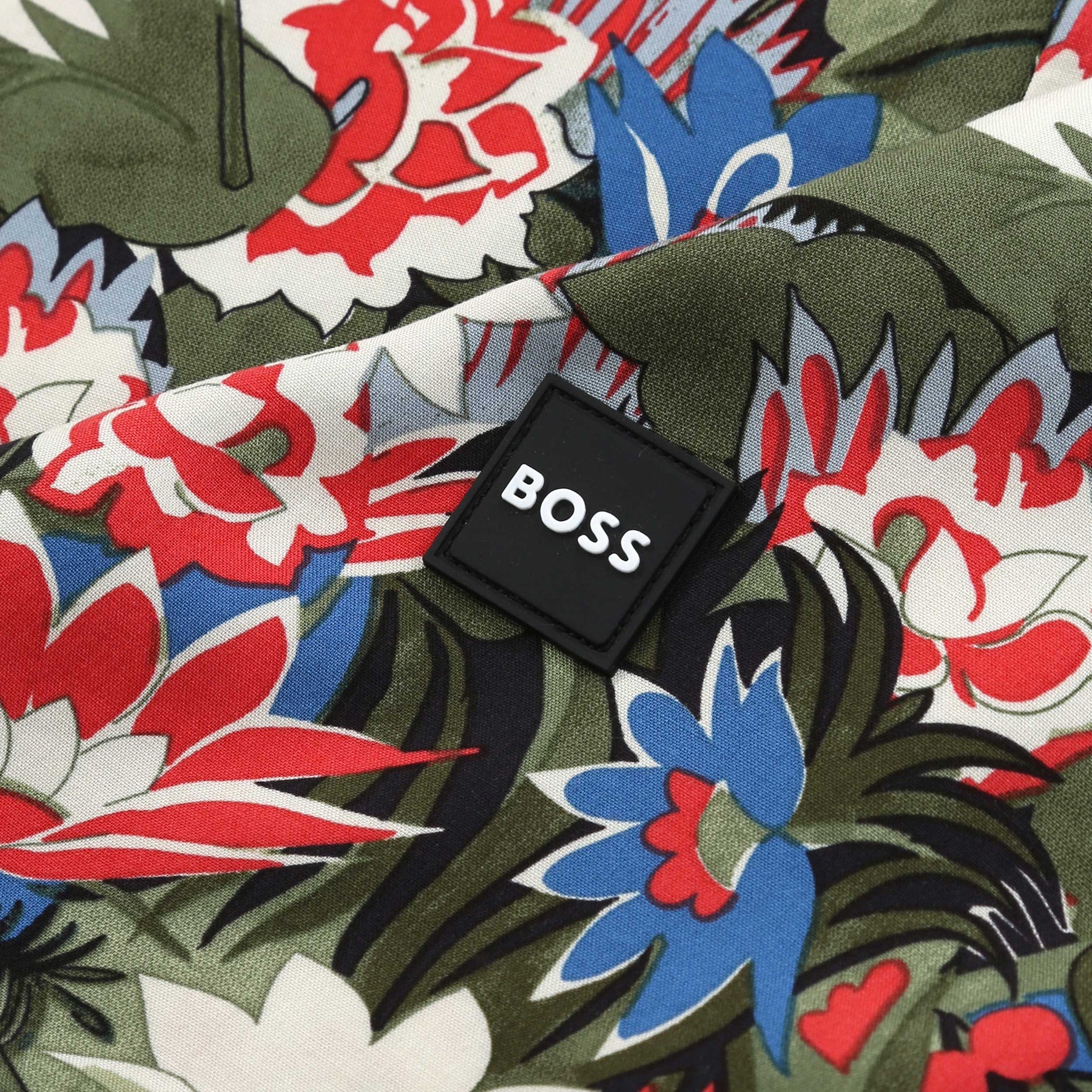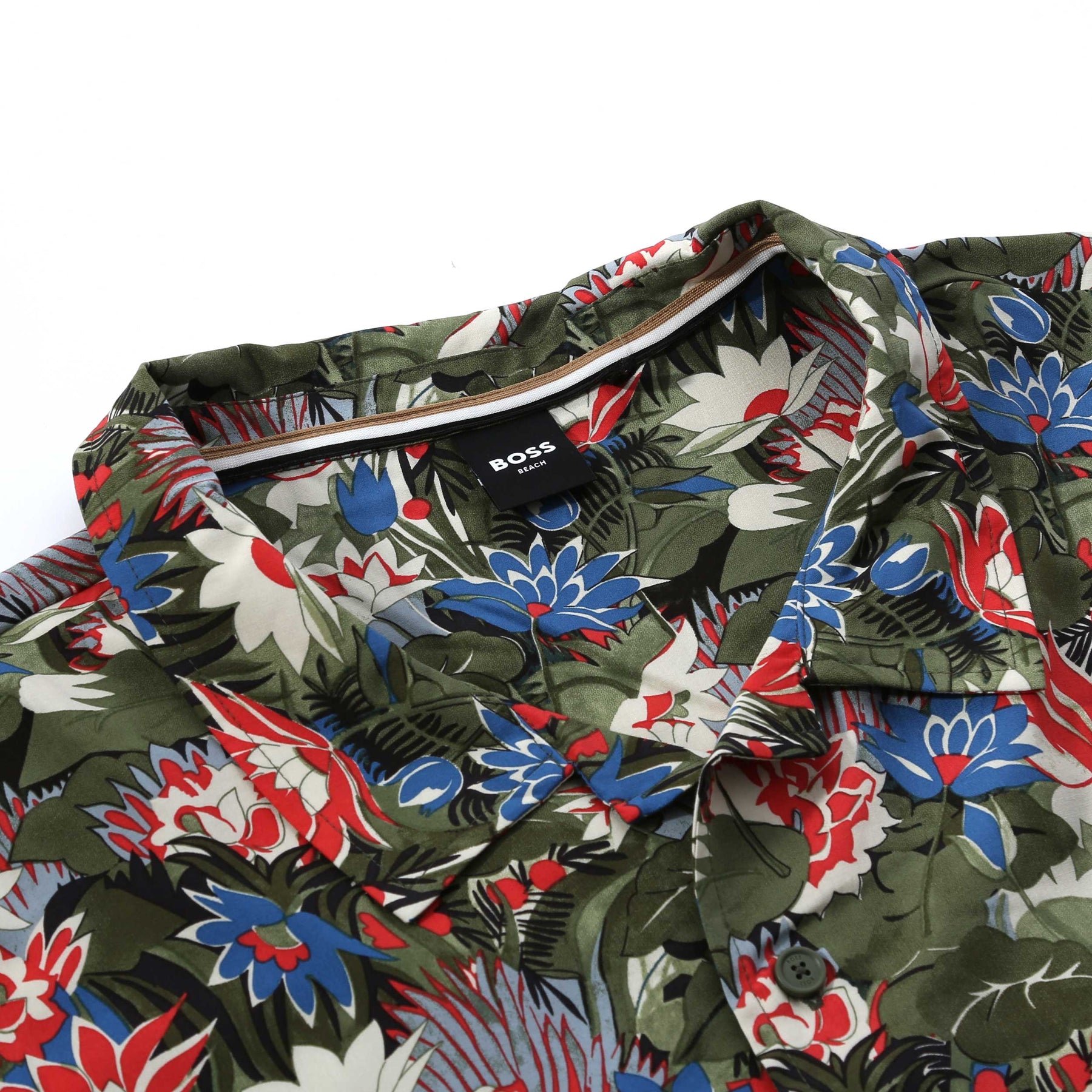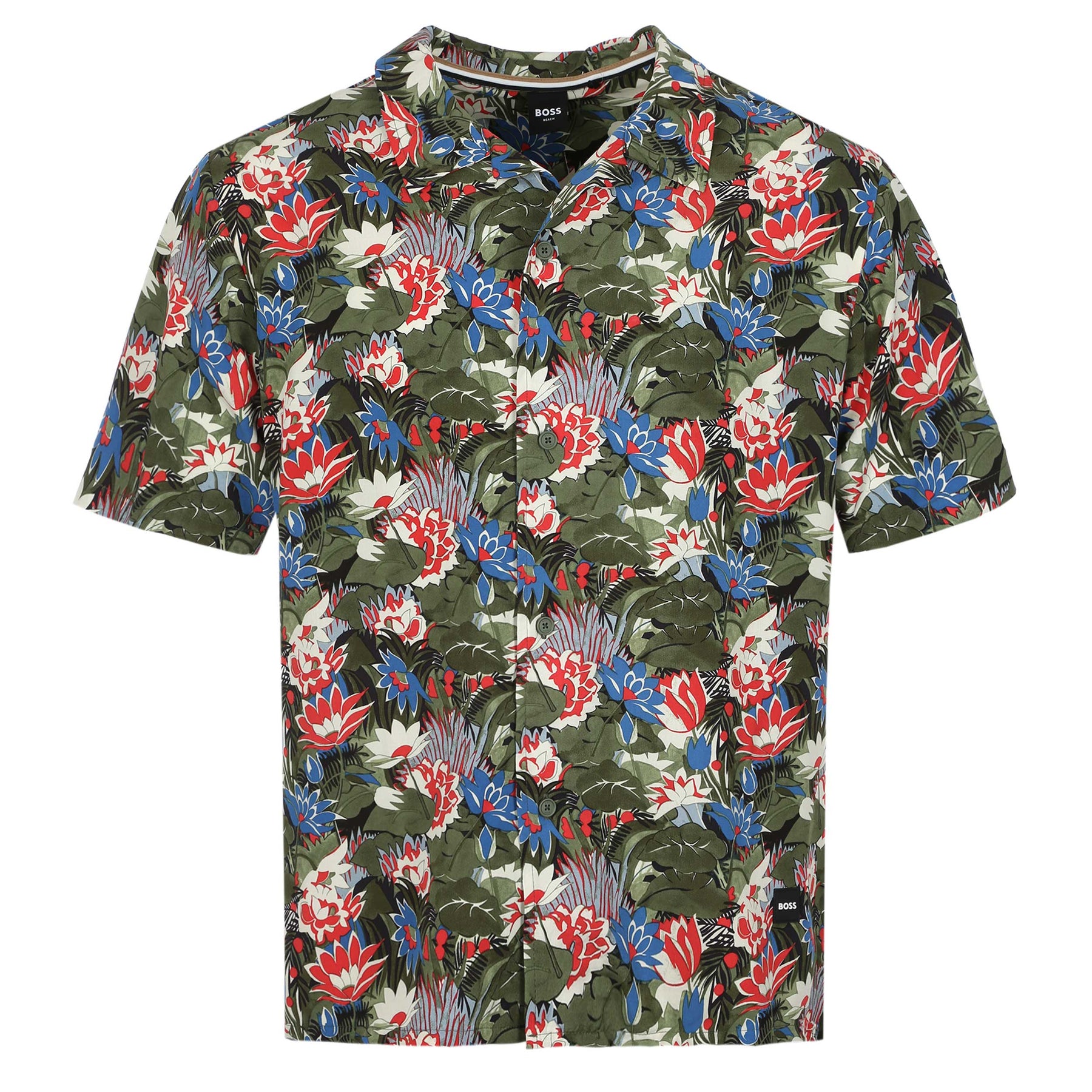 BOSS Beach Shirt in Open Green. Short sleeve shirt by BOSS. A regular fit shirt with a full button placket. This shirt arrives with an all over multi-coloured tropical floral print. Cuban style collar. Metal BOSS logo tab to the waist. Tri-colour woven logo tab to the sleeve. Perfect short sleeve shirt form those summer days.