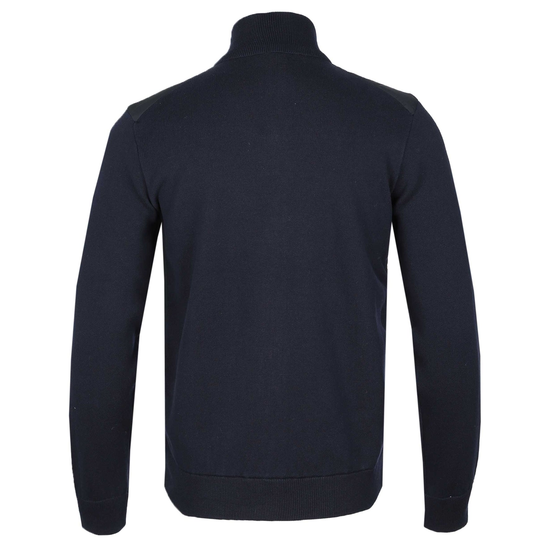 BOSS C Ibaio Hybrid Jacket in Dark Blue. A classic jacket by BOSS. This jacket is a regular fit and has full zip fastening. Padded contrasting polyester front panel design. Tonal knitted sleeves and back panel. Two press stud fastening pockets. Detailed with a BOSS logo badge to the lefrt sleeve.