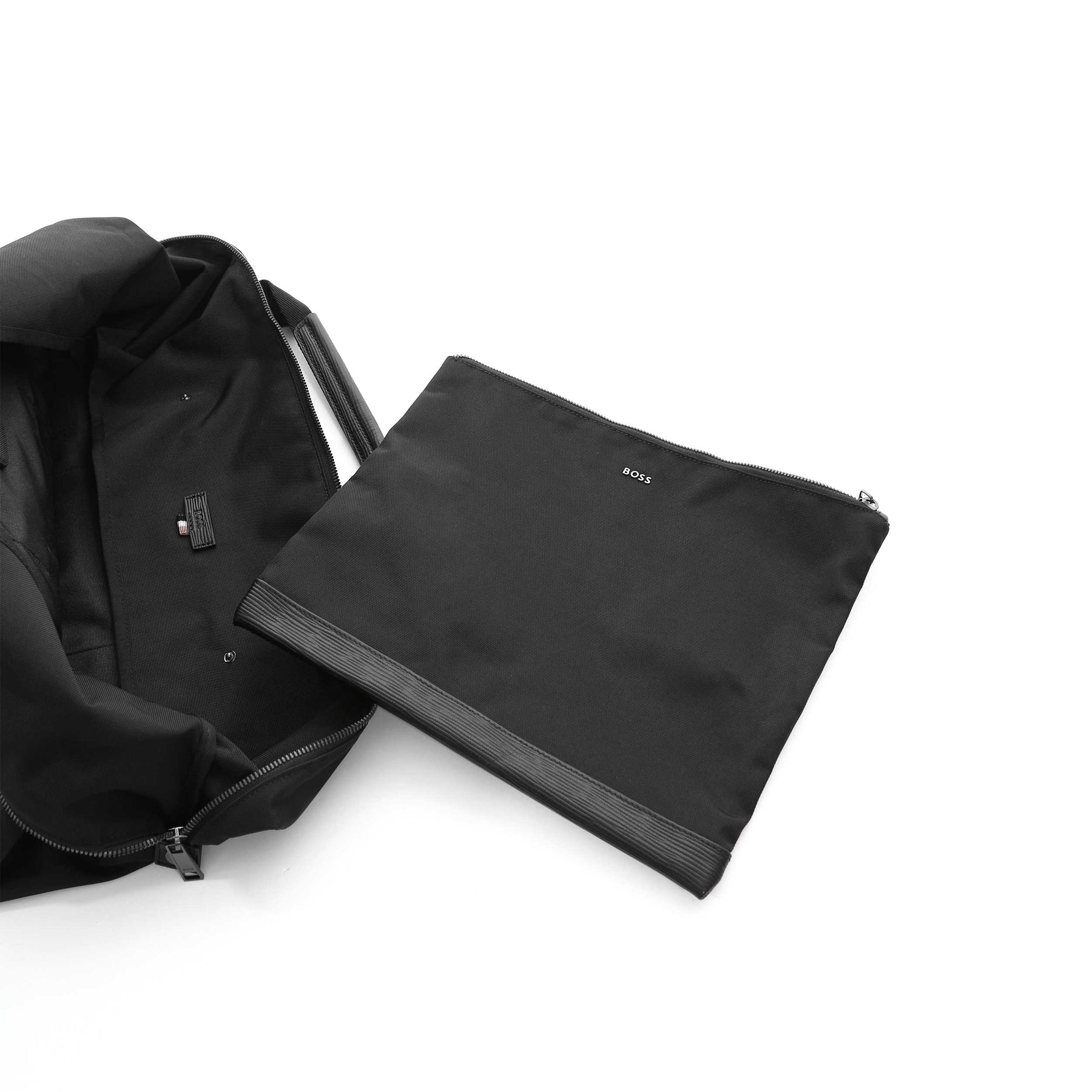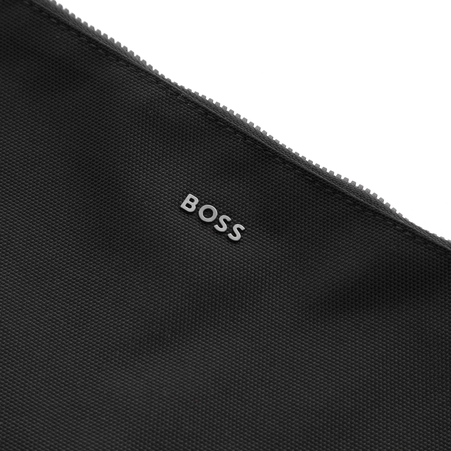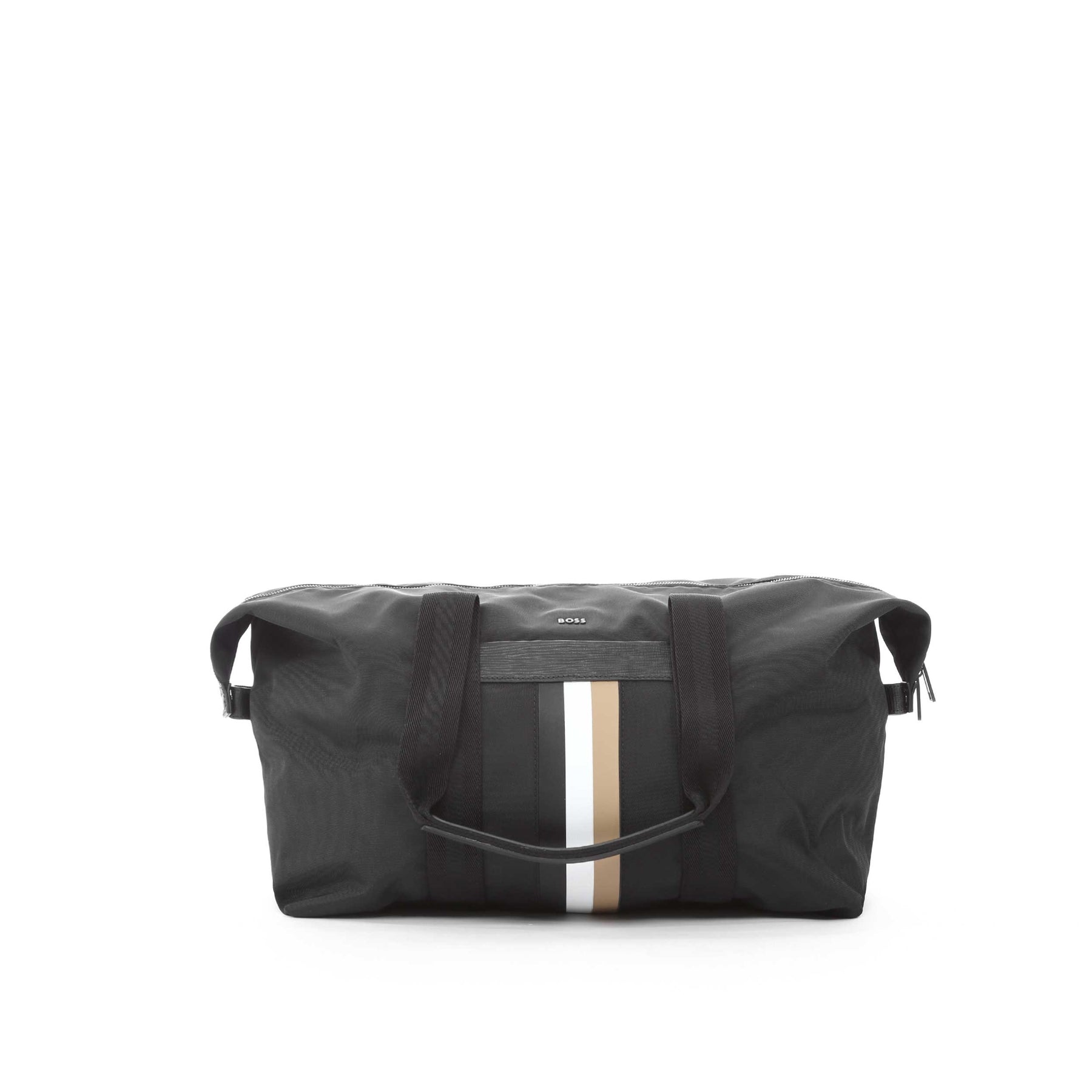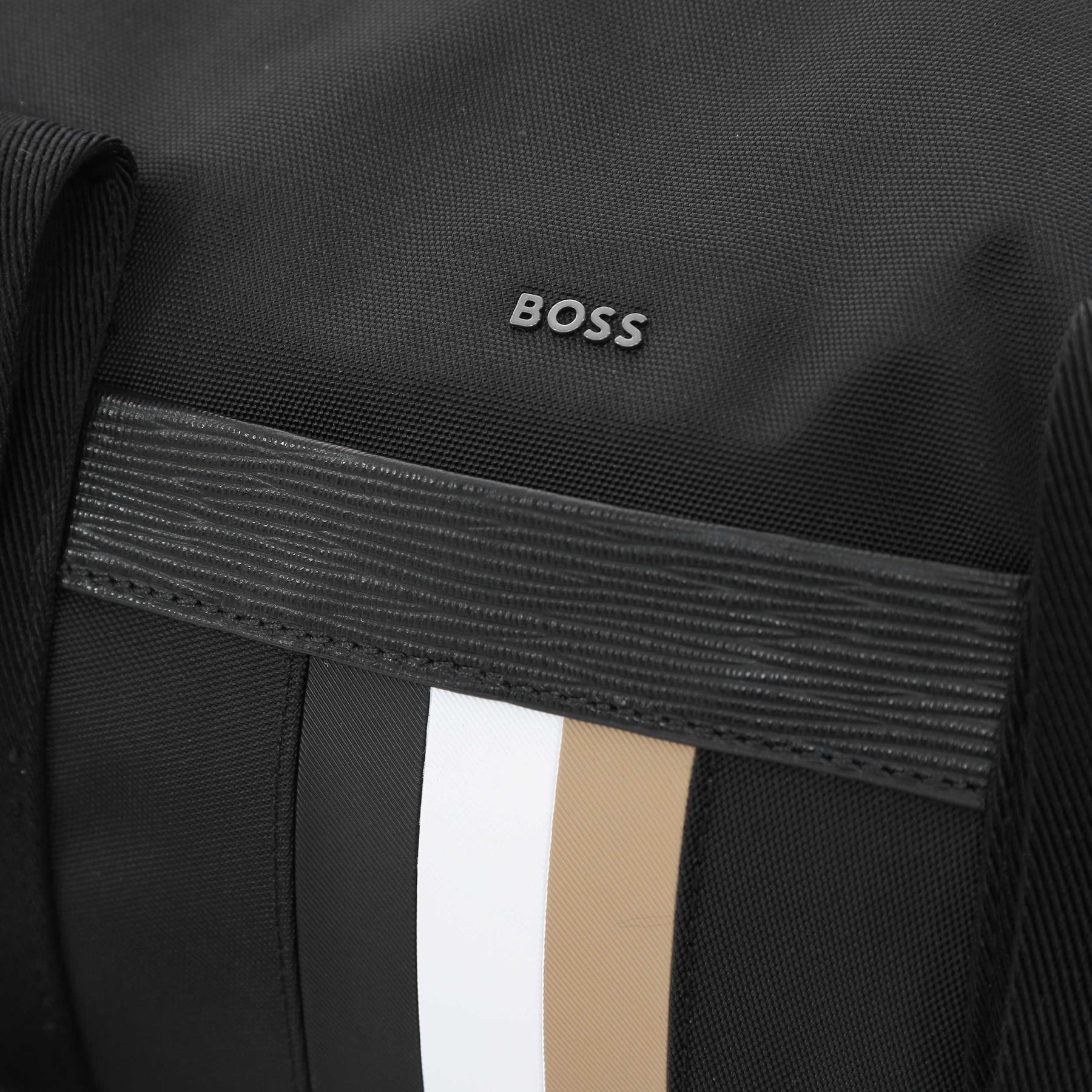 BOSS First Class S Hold Bag in Black. A versatile Hugo Boss holdall. This nylon holdall is a spacious accessory with a two way zip. Removable pouch for added storage. Tri-colour BOSS logo to the front. Leather details throughout the bag. Finished off with a metal BOSS logo badge to the front. The perfect holdall for weekends away or for the gym.