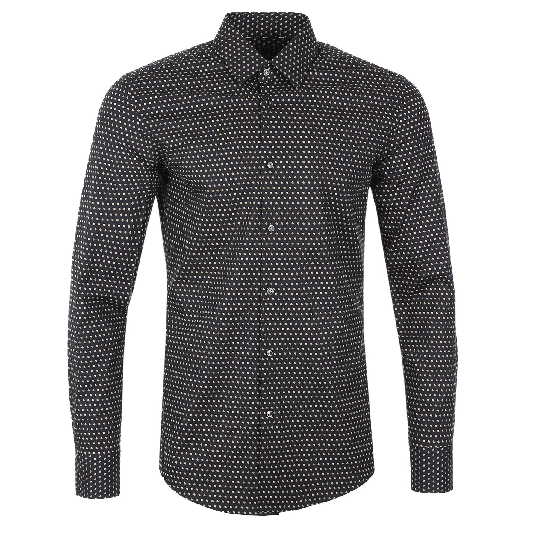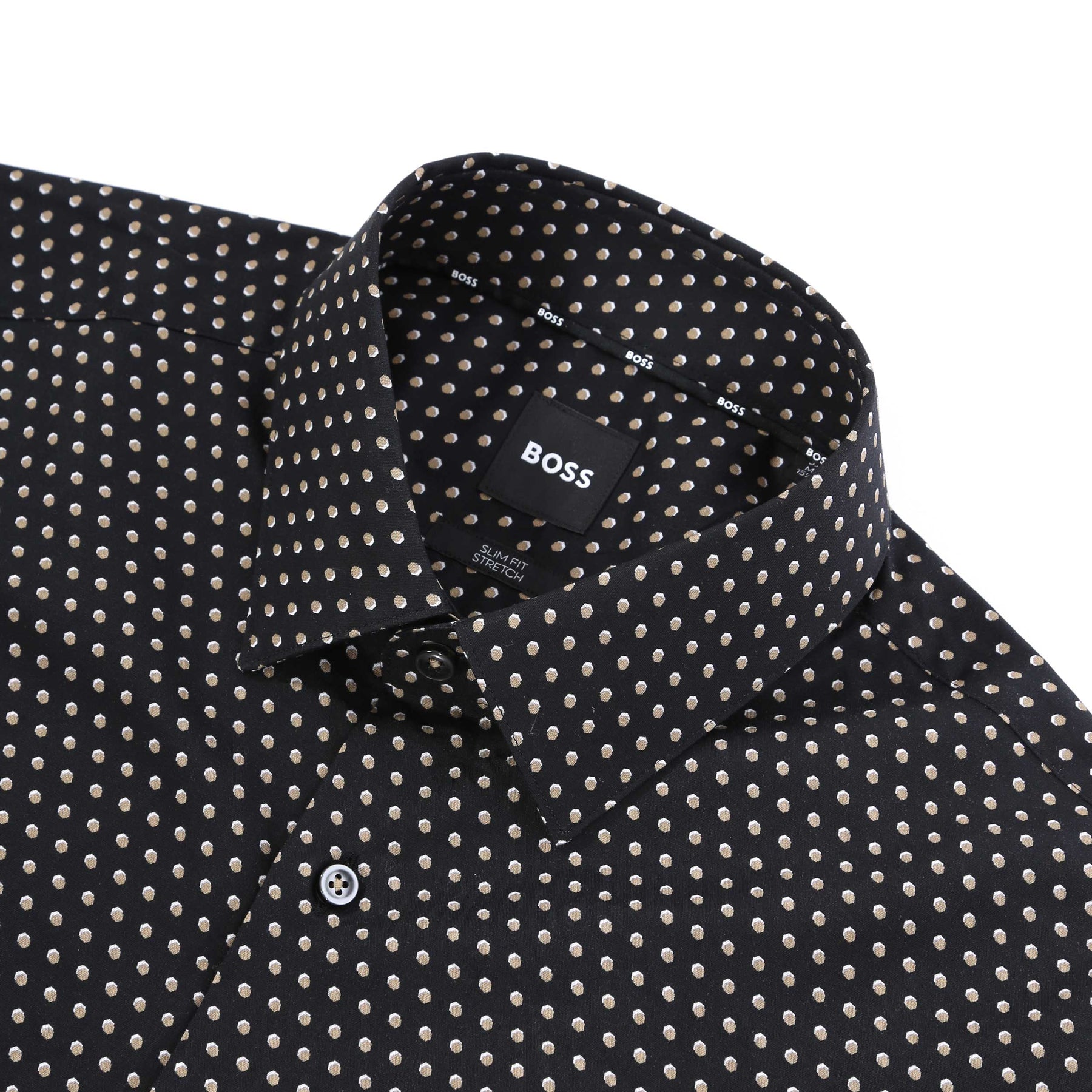 BOSS H Hank S Kent C1 232 Shirt in Black Gold. A long sleeve BOSS shirt in a slim fit. Featuring a full button fastening and a geometric design throughout. Crafted from a soft performance stretch material, designed for movement and breathability. Treated with an easy-iron finish.