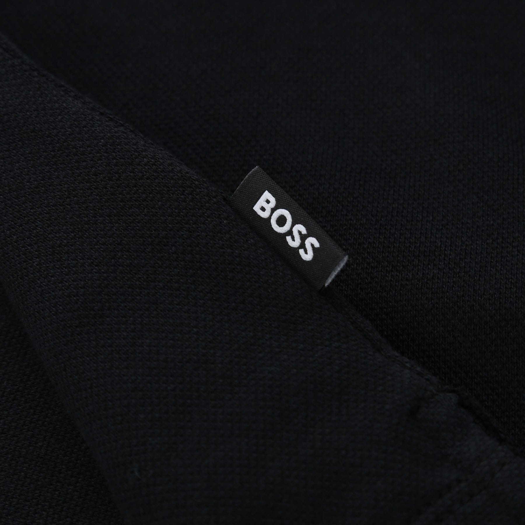 BOSS H Paras 57 Polo Shirt in Black. A regular fit short sleeve BOSS polo shirt. The branded metal quarter-zip adds a sleek upgrade to the classic polo collar, while the short sleeves keep it clean and versatile for everyday wear. Finished with a woven BOSS pinch tag on the lower left seam, it’s detailed with side vents and an extended back hem for improved comfort and movement. A polished, easygoing layer that slots straight into any smart-casual lineup.