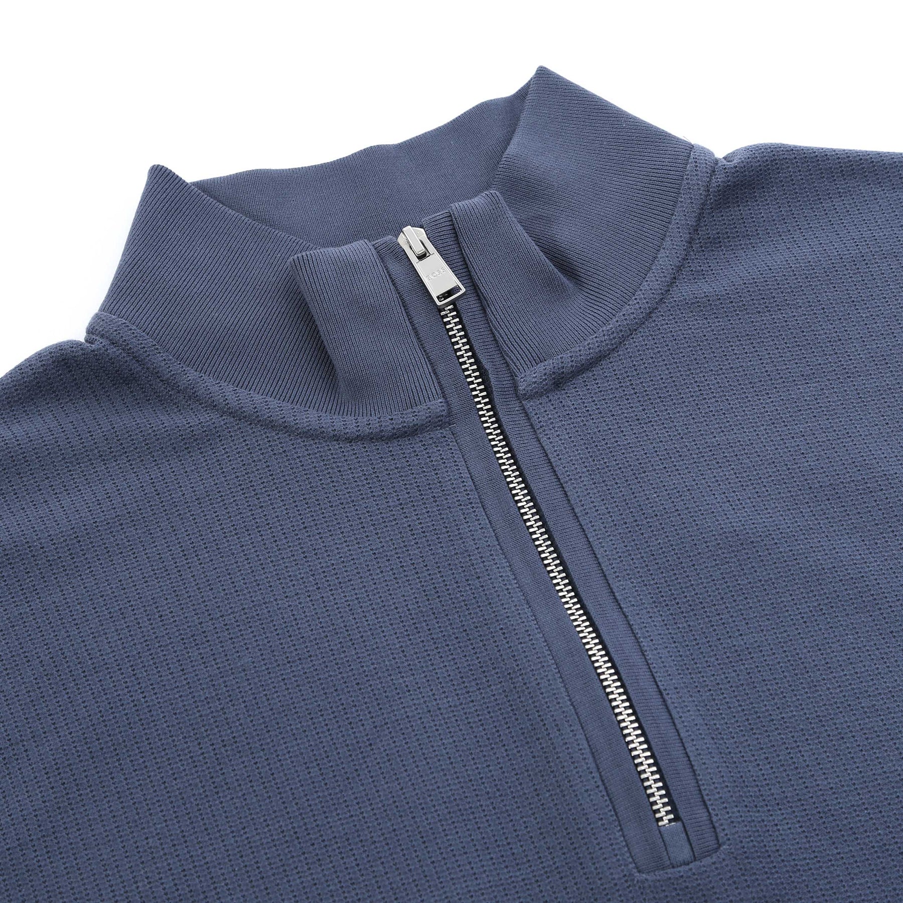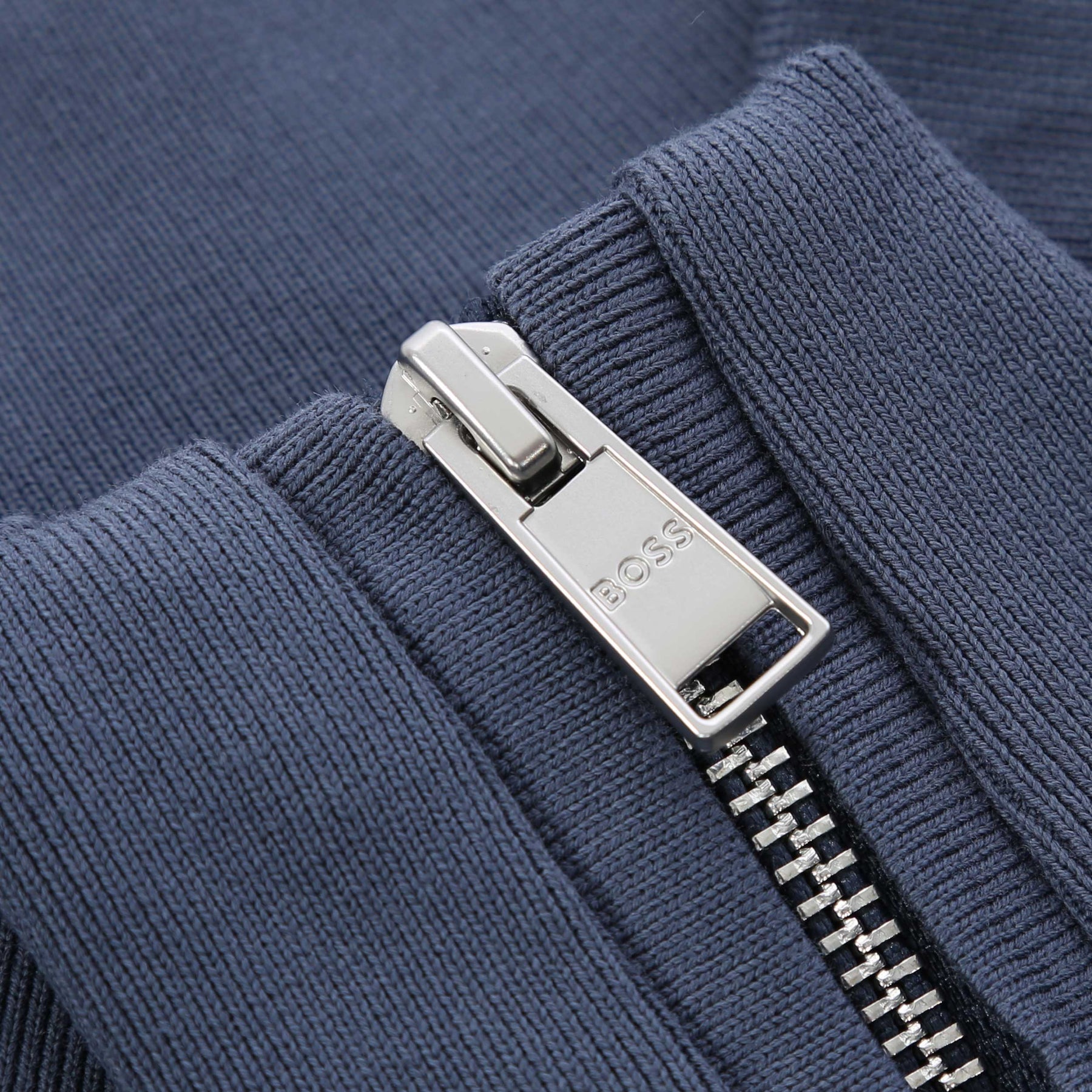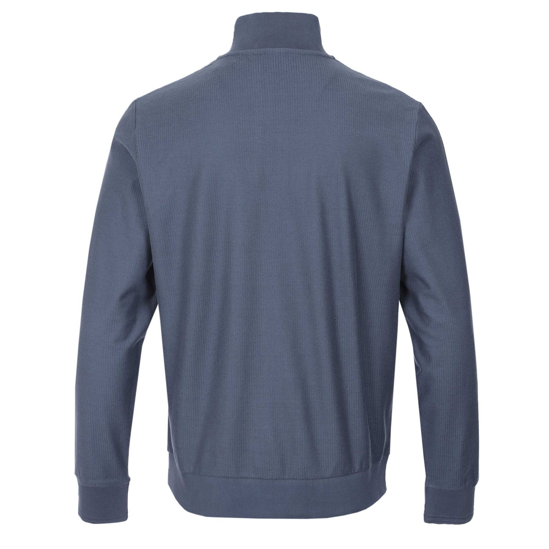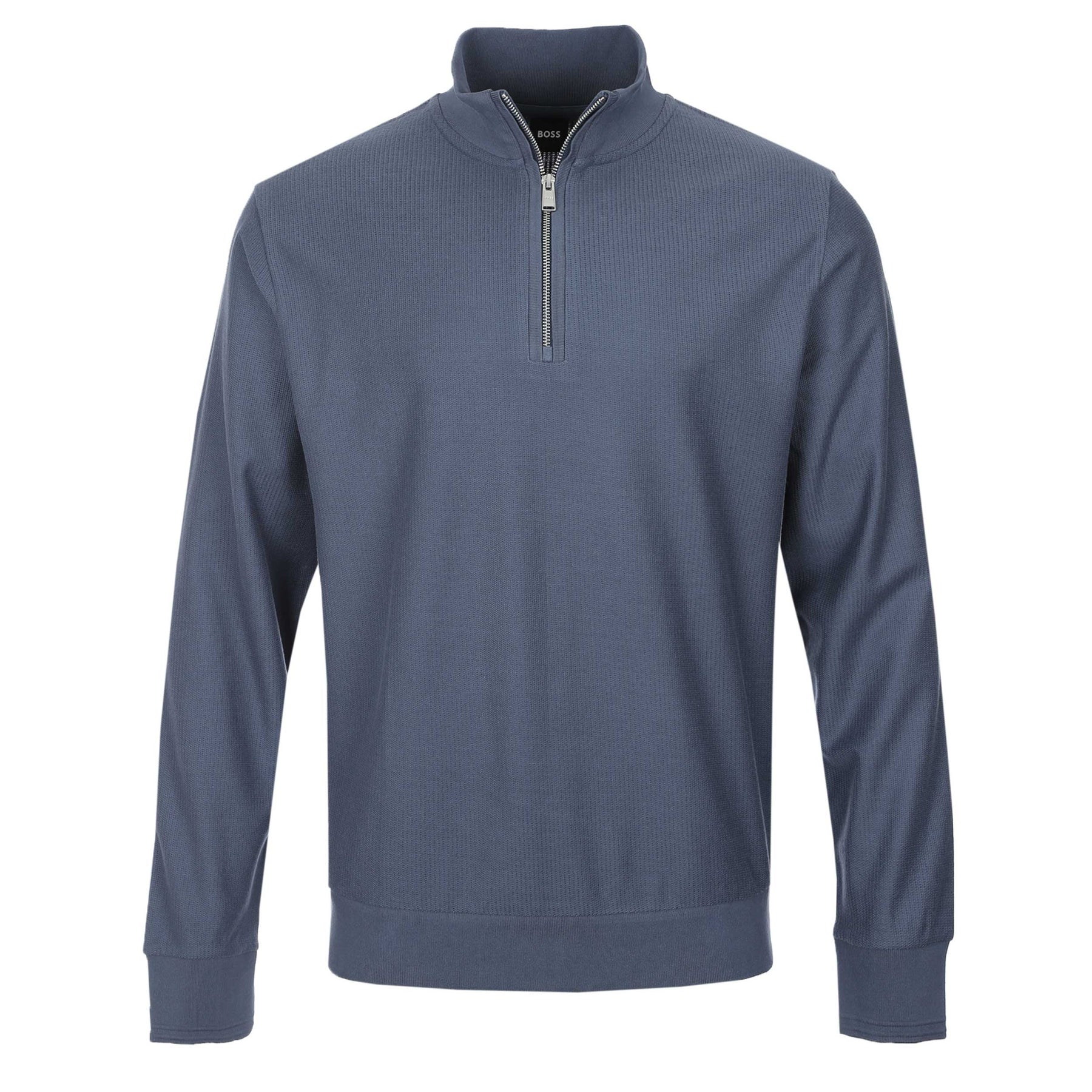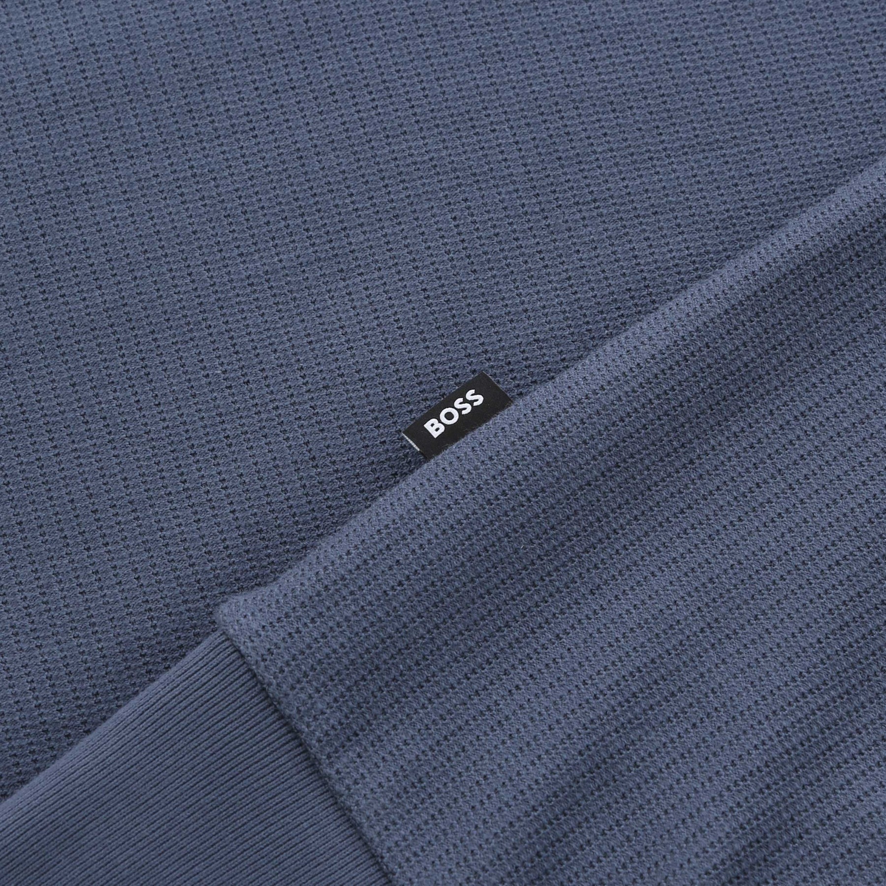 BOSS H Sidney 70 Knitwear in Open Blue. An elegant and refined knitwear by BOSS. This pique cotton mix long sleeve knitwear comes with a quarter zip fastening. Textured design to the knitwear. Hems to the waistband and cuffs are ribbed. BOSS logo to the side seam. This BOSS knitwear can be worn both formally or casual.