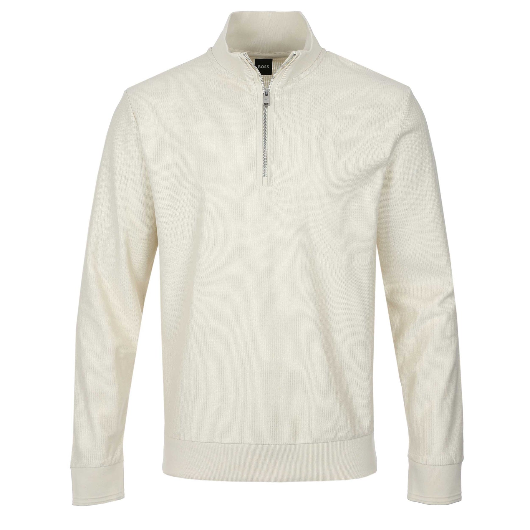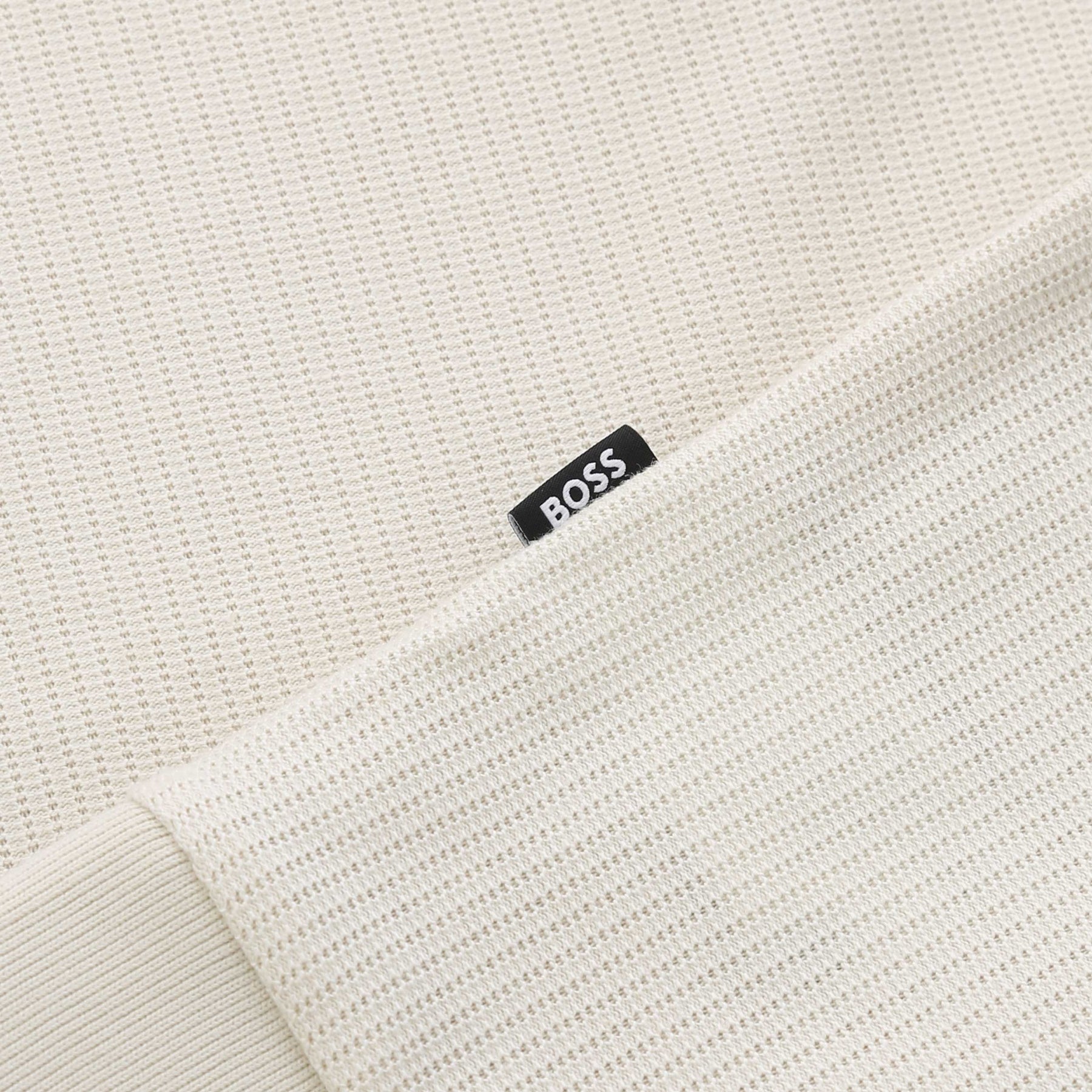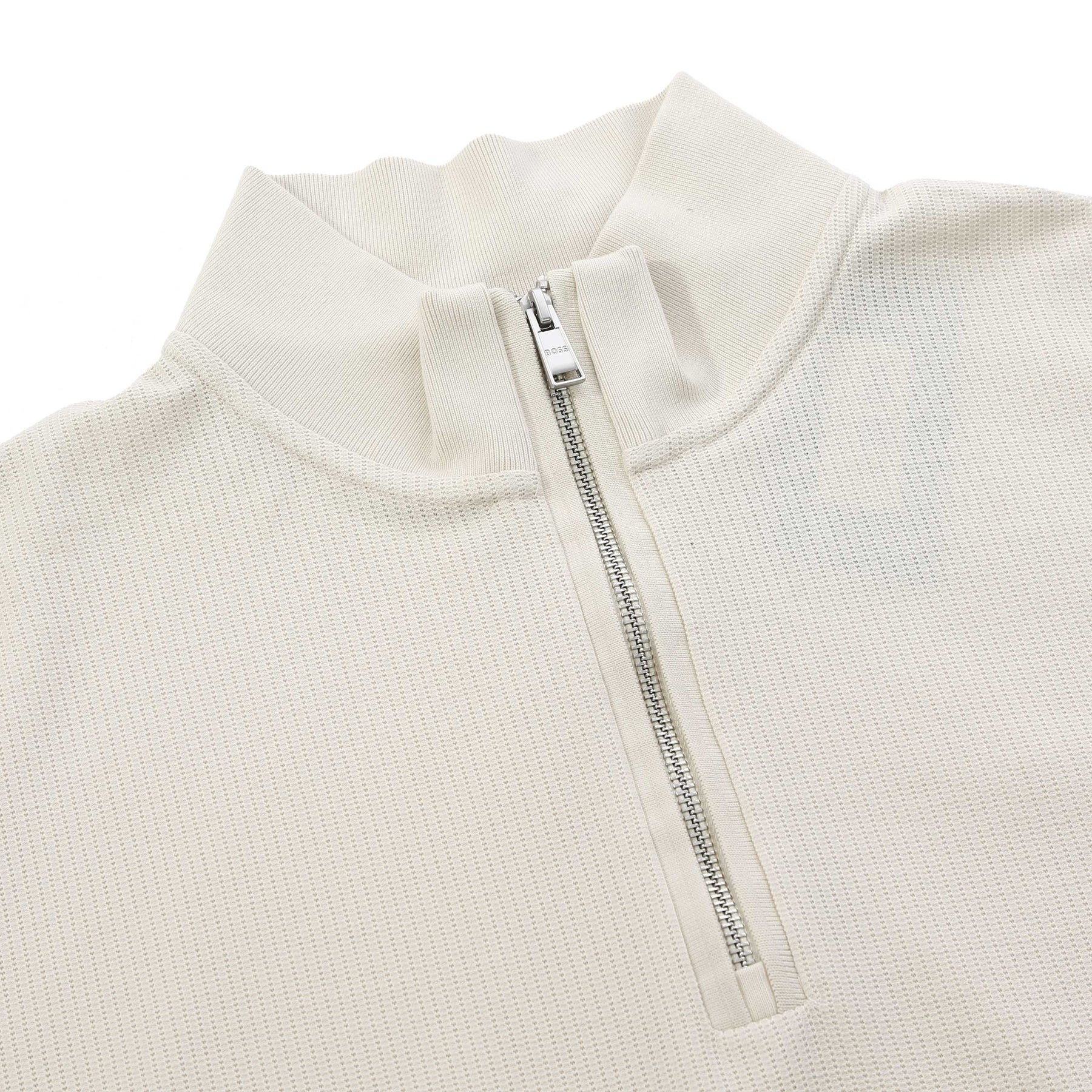 BOSS H Sidney 70 Knitwear in Open White. An elegant and refined knitwear by BOSS. This pique cotton mix long sleeve knitwear comes with a quarter zip fastening. Textured design to the knitwear. Hems to the waistband and cuffs are ribbed. BOSS logo to the side seam. This BOSS knitwear can be worn both formally or casual.