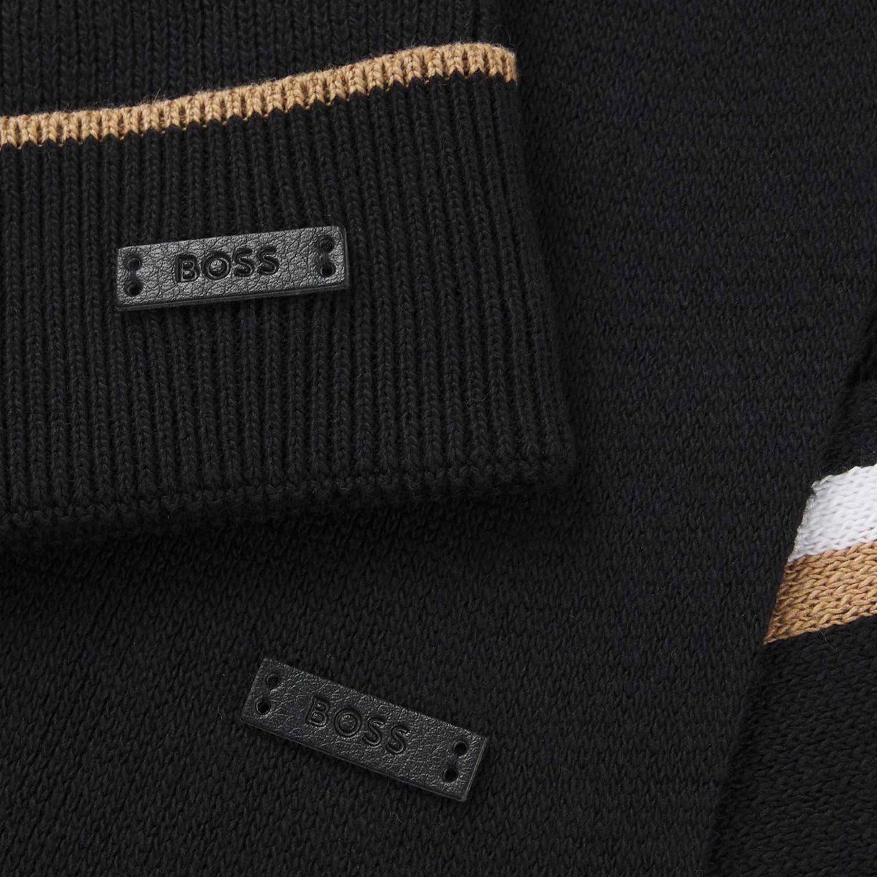 BOSS Henzo Set Hat & Scarf Set in Black. Hat and scarf gift set from BOSS. The hat and scarf feature a stripe design with a leather BOSS logo tab. All presented in a BOSS gift box.