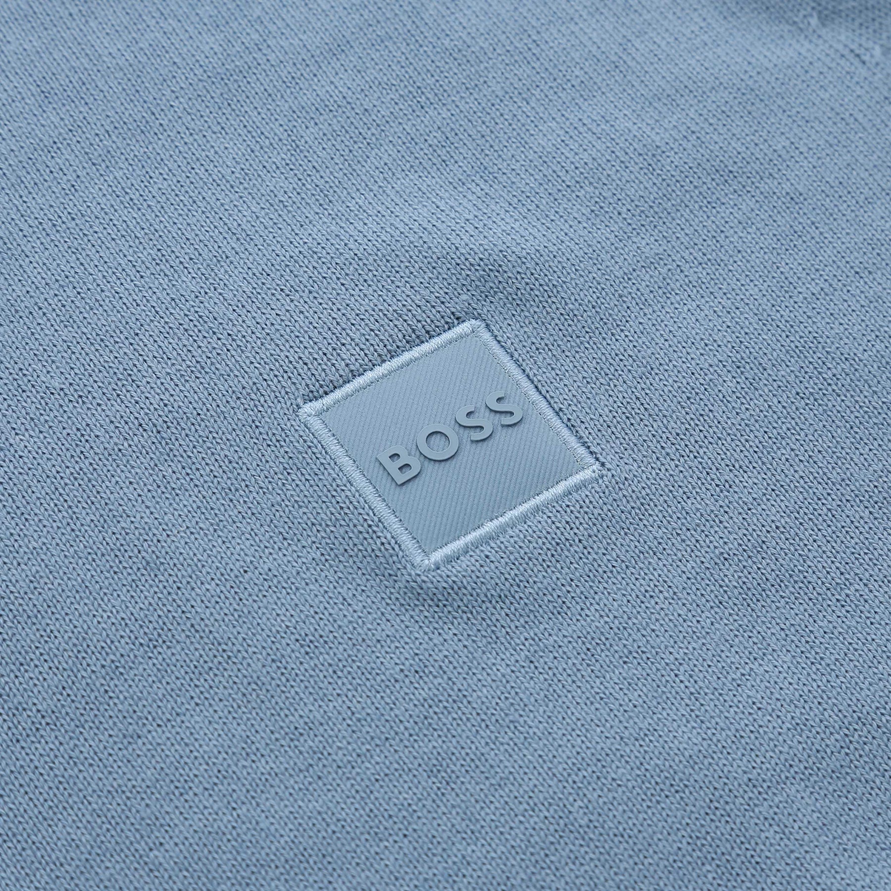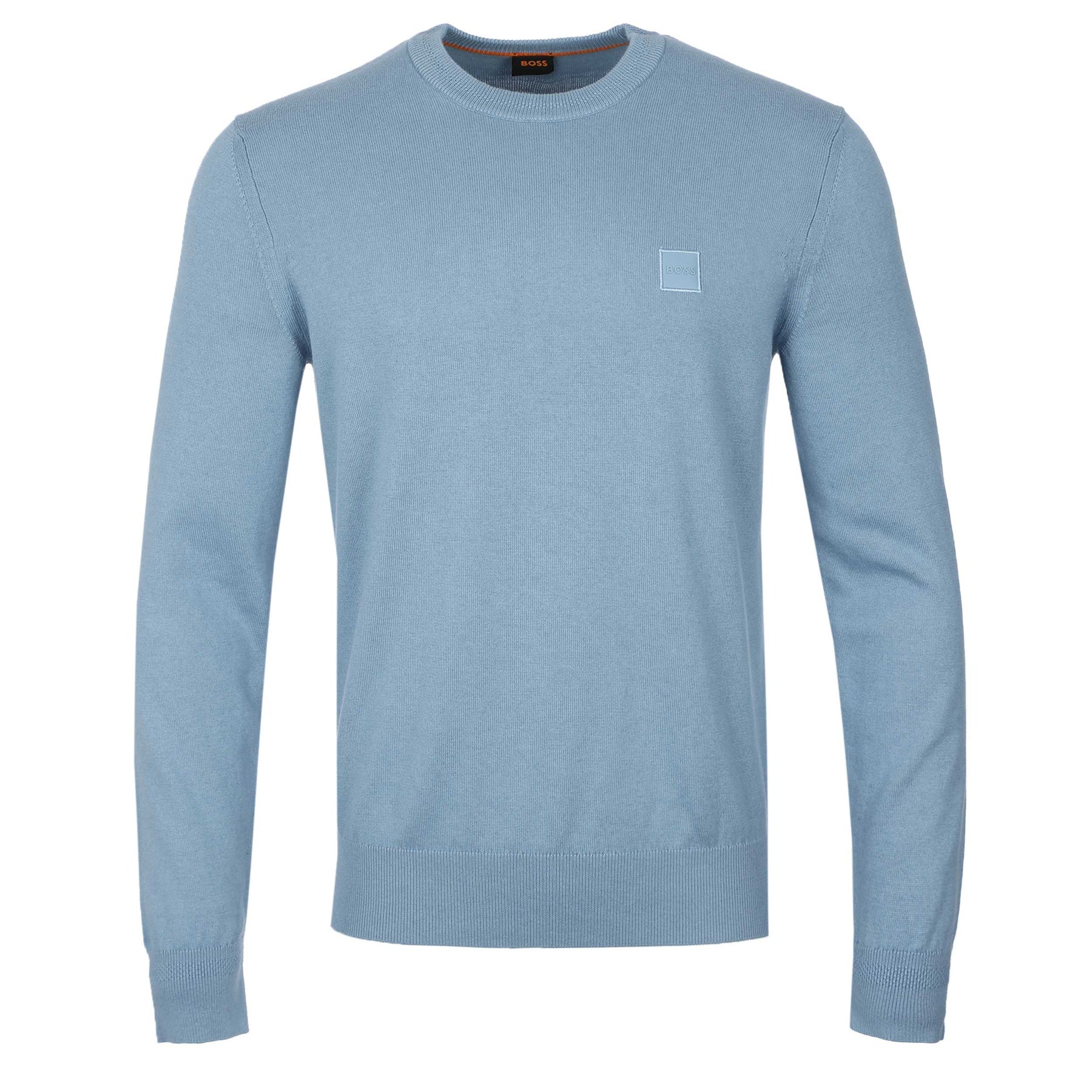 BOSS Kanovano S Knitwear in Light Pastel Blue. A classic piece of knitwear by BOSS. This jumper is a regular fit with crew neck and long sleeves. It has ribbed cuffs, cuts to a regular length and is detailed with a tonal BOSS square logo on the chest.