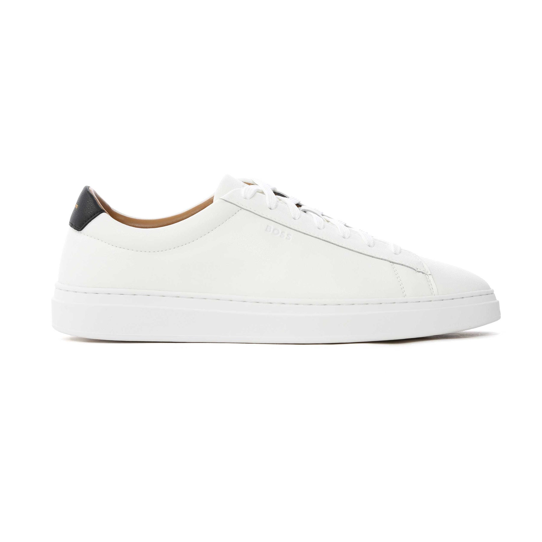 BOSS Kieran Tenn allt Trainer in Natural. These low top BOSS trainers arrive with a 7 hole lace up and a tonal colour sole unit. Textured leather trainer featuring subtle BOSS logo. Contrasting heel tab. A perfect blend of luxury and everyday comfort.