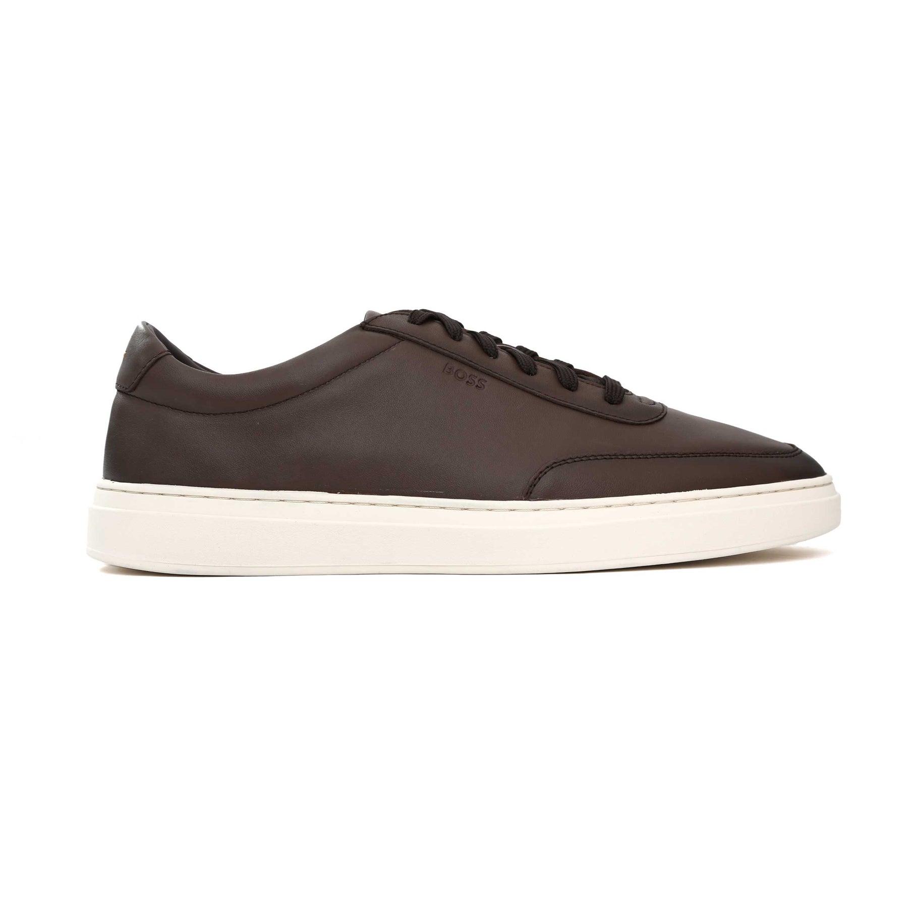 BOSS Kieran Tenn buox Trainer in Dark Brown. These low-top BOSS trainers feature a clean 6-eyelet lace-up and a contrasting sole for a modern, understated look. Crafted from smooth leather with subtle BOSS branding on the side, they’re finished with a tri-colour embroidered heel tab for a signature touch. A refined mix of luxury detailing and everyday comfort.