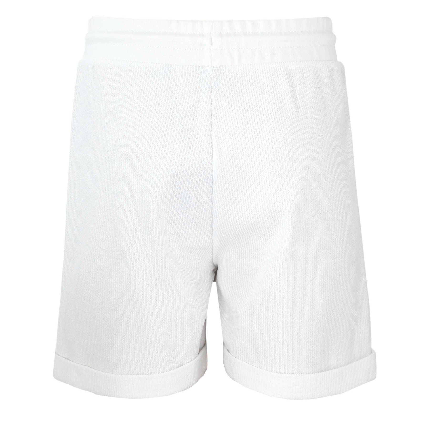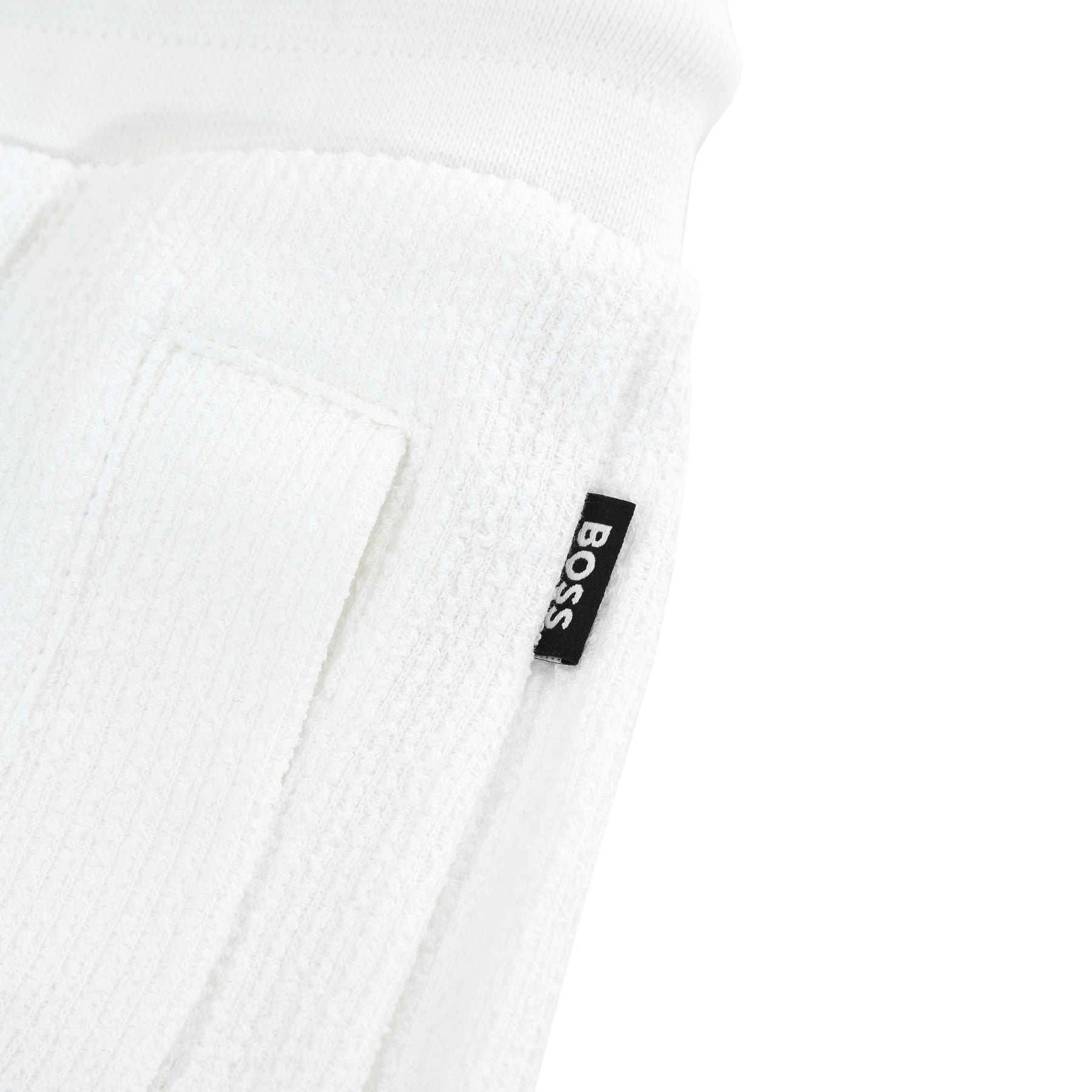 BOSS Lasdun 129 Short in White. A regular fit short by BOSS. This short arrives in a plain design. Boucle fabric style. Featuring an elastictae drawstring waistband. 2 snap fastening side spockets and 2 seat pockets. Team up with the matching shirt.
