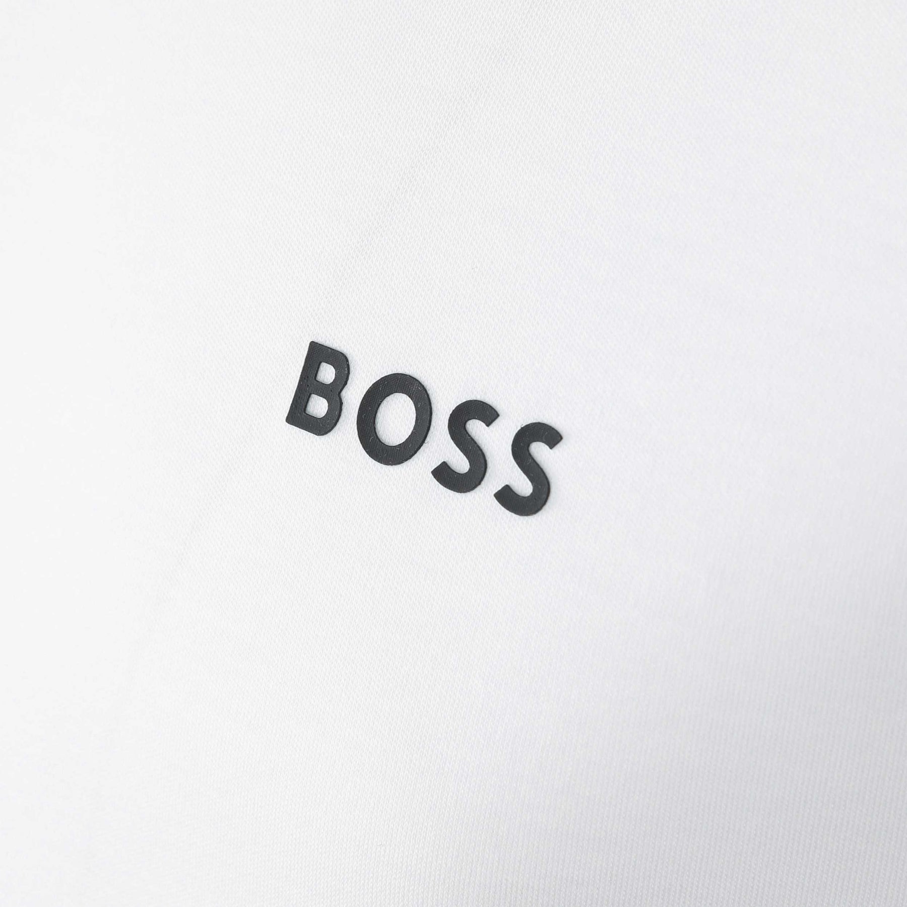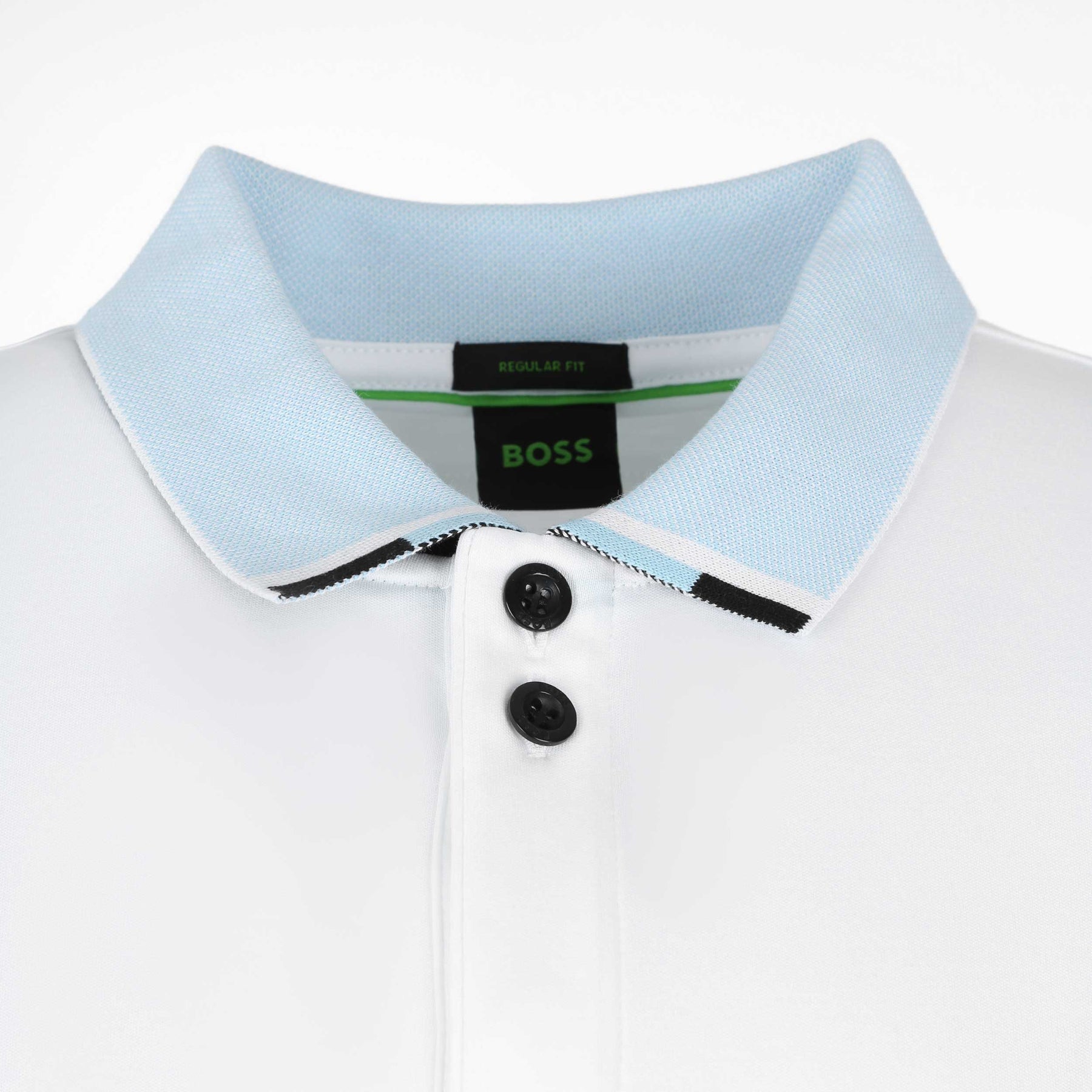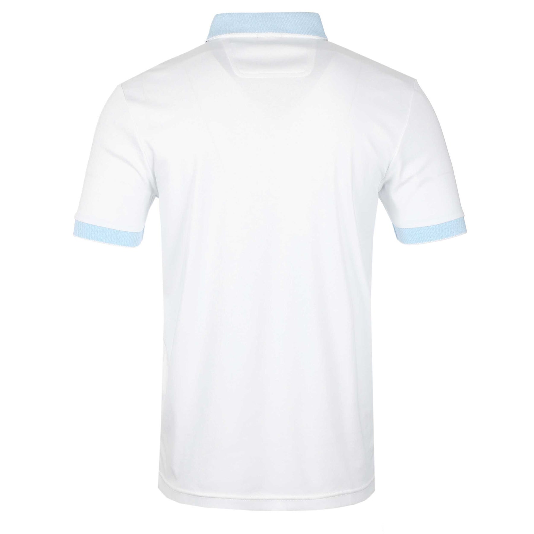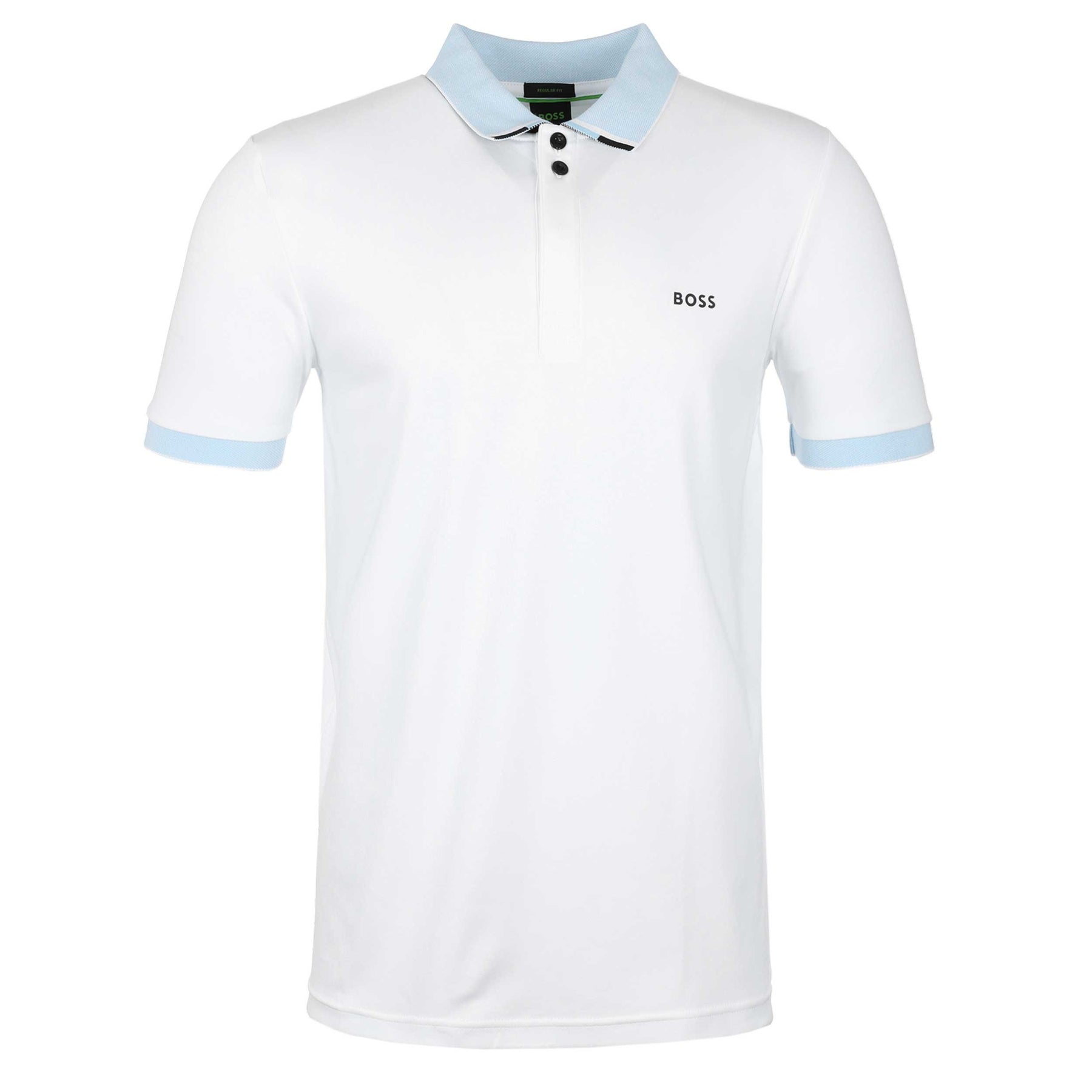 BOSS Paddy 1 Polo Shirt in White. A classic BOSS polo shirt in a regular fit. A 3 button fastening placket with a contrasting colour rubber BOSS logo to the chest. Contrasting colour collar and cuffs. Tip detailing to the collar.