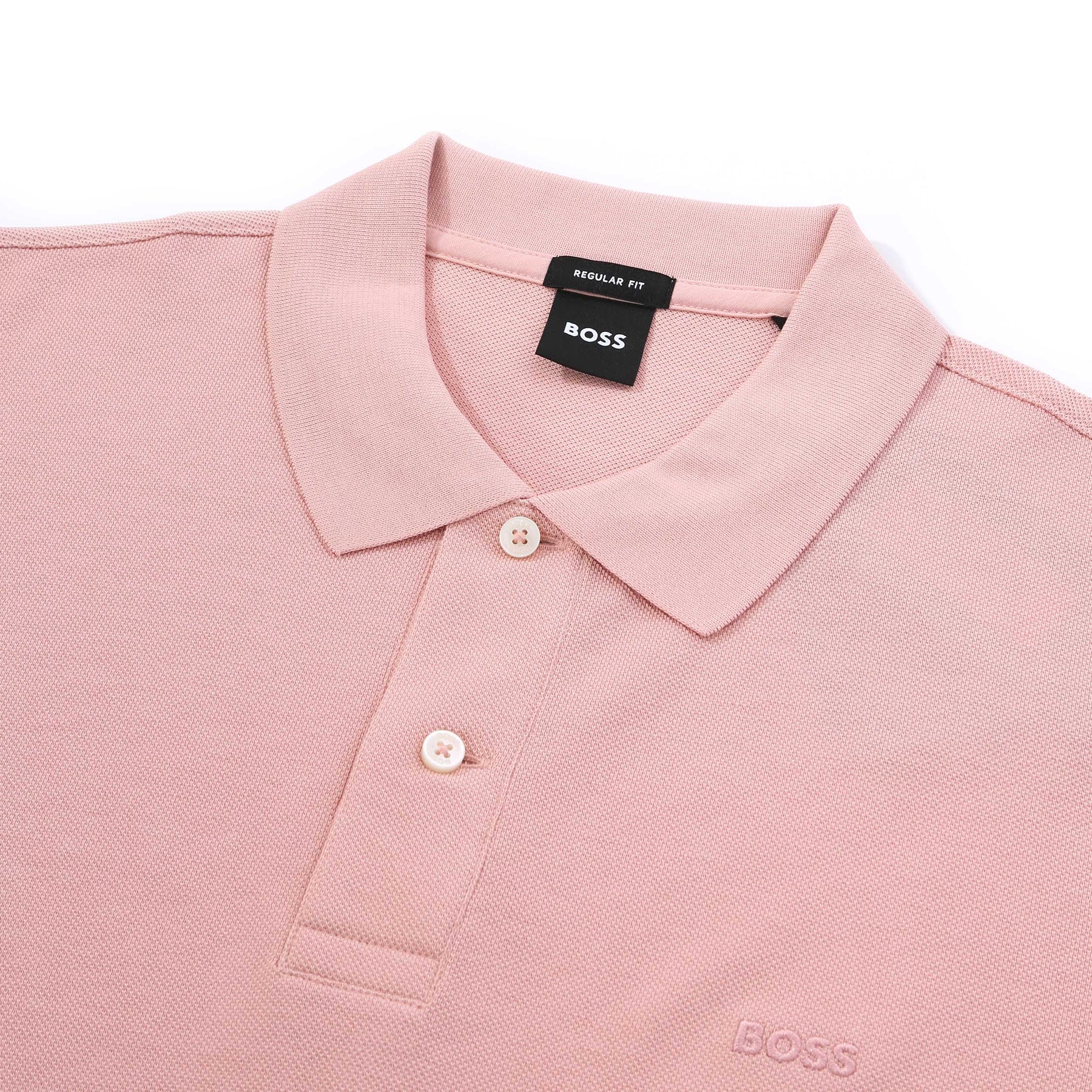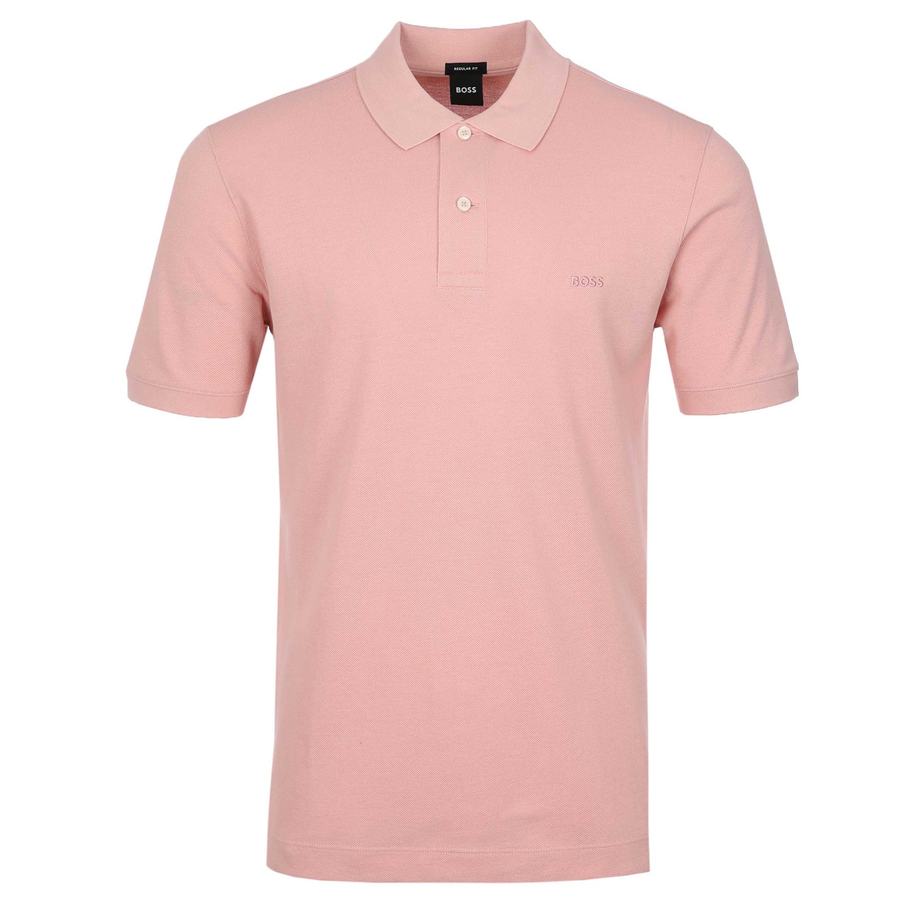 BOSS Pallas Polo Shirt in Light Pastel Pink. A regular fit BOSS polo shirt with a classic polo collar. This short sleeve polo shirt arrives with a 2 button placket. Embroidered tonal BOSS logo to the chest. Ribbed collar and cuffs. Perfect casual polo shirt to be teamed up with either jeans or sweat pants.