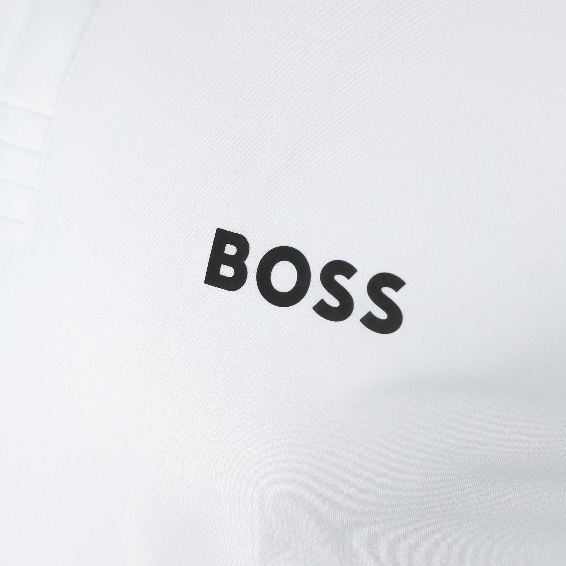 BOSS Pariq MB 1 Polo Shirt in White. A regular fit Hugo Boss polo shirt. This polo shirt has a unique, bomber style collar. This short sleeve polo shirt arrives finished off with a 2 button placket. Rubber BOSS logo to the chest. Tri-colour stripe design to the back panel. Perfect casual polo shirt to be teamed up with jeans.