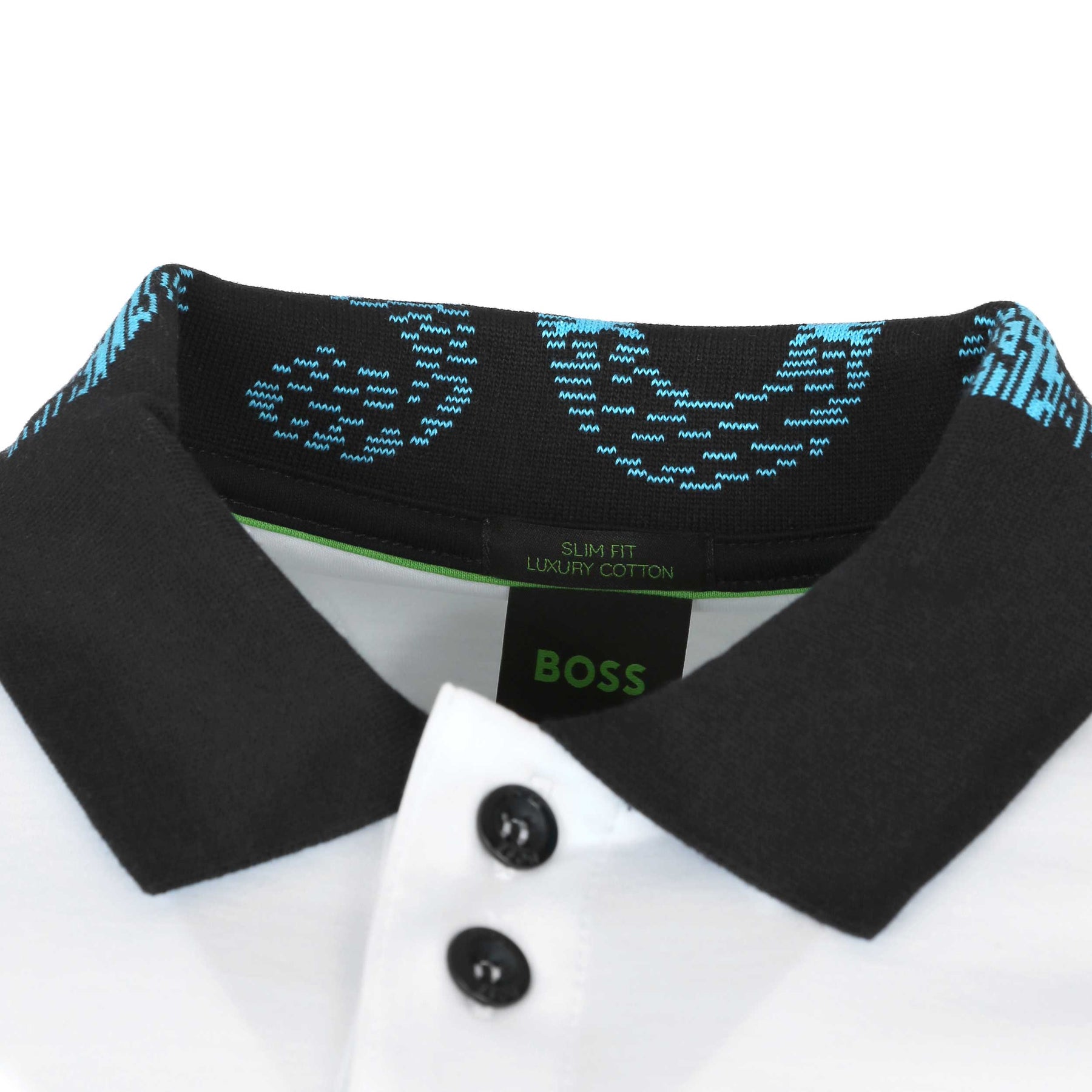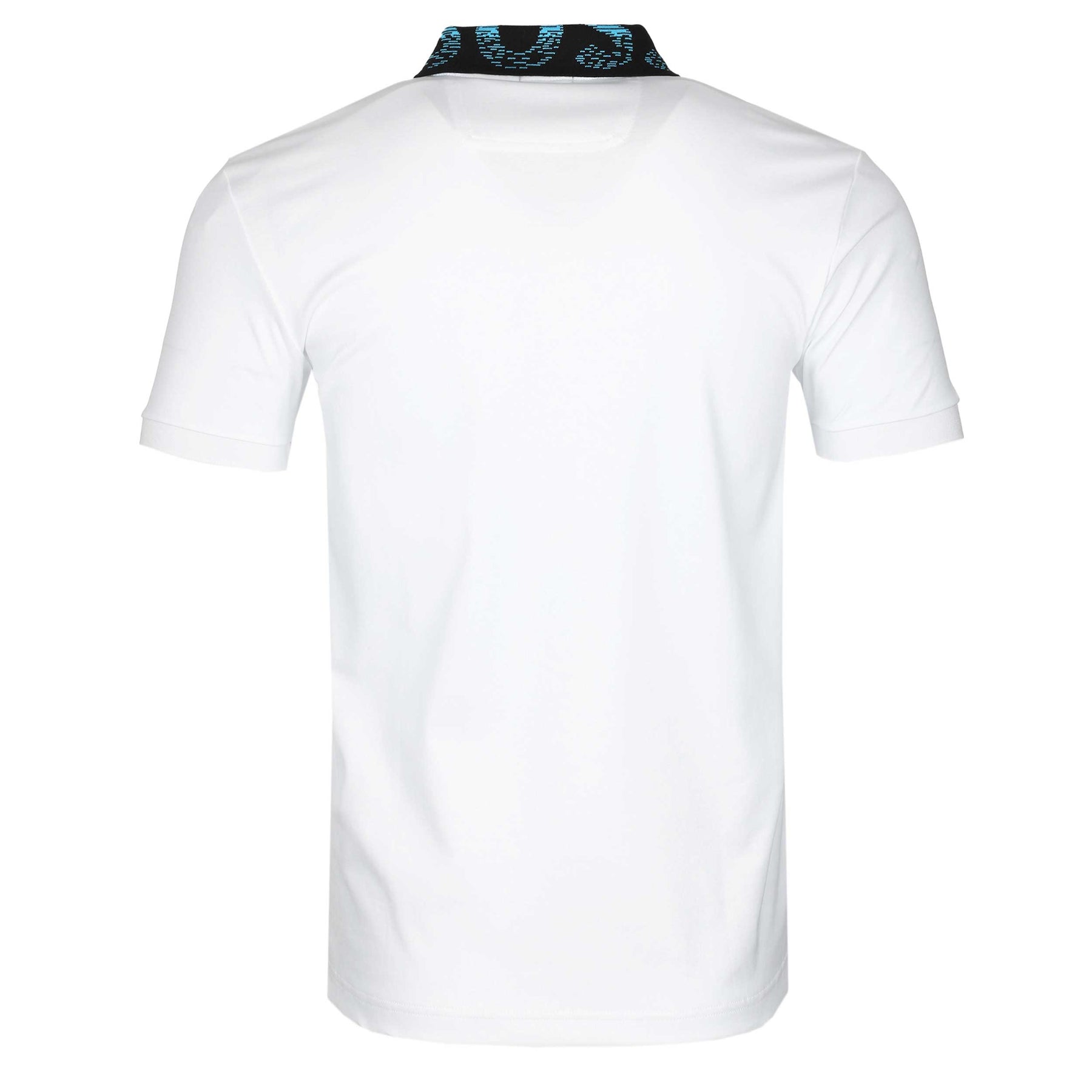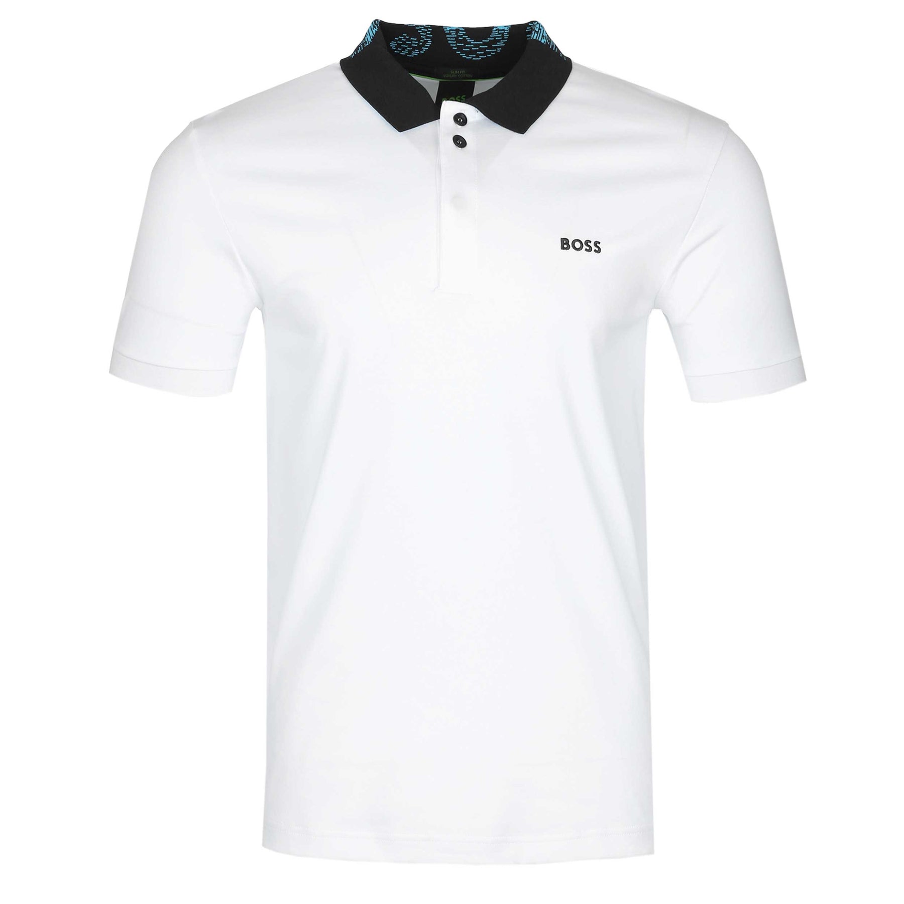 BOSS Paule 1 Polo Shirt in White. A slim fit polo shirt by BOSS. Featuring a contrasting colour collar with jacquard BOSS logo to the rear of the collar. Short sleeves and a 3 button placket. Finished with an embroidered BOSS logo on the chest.