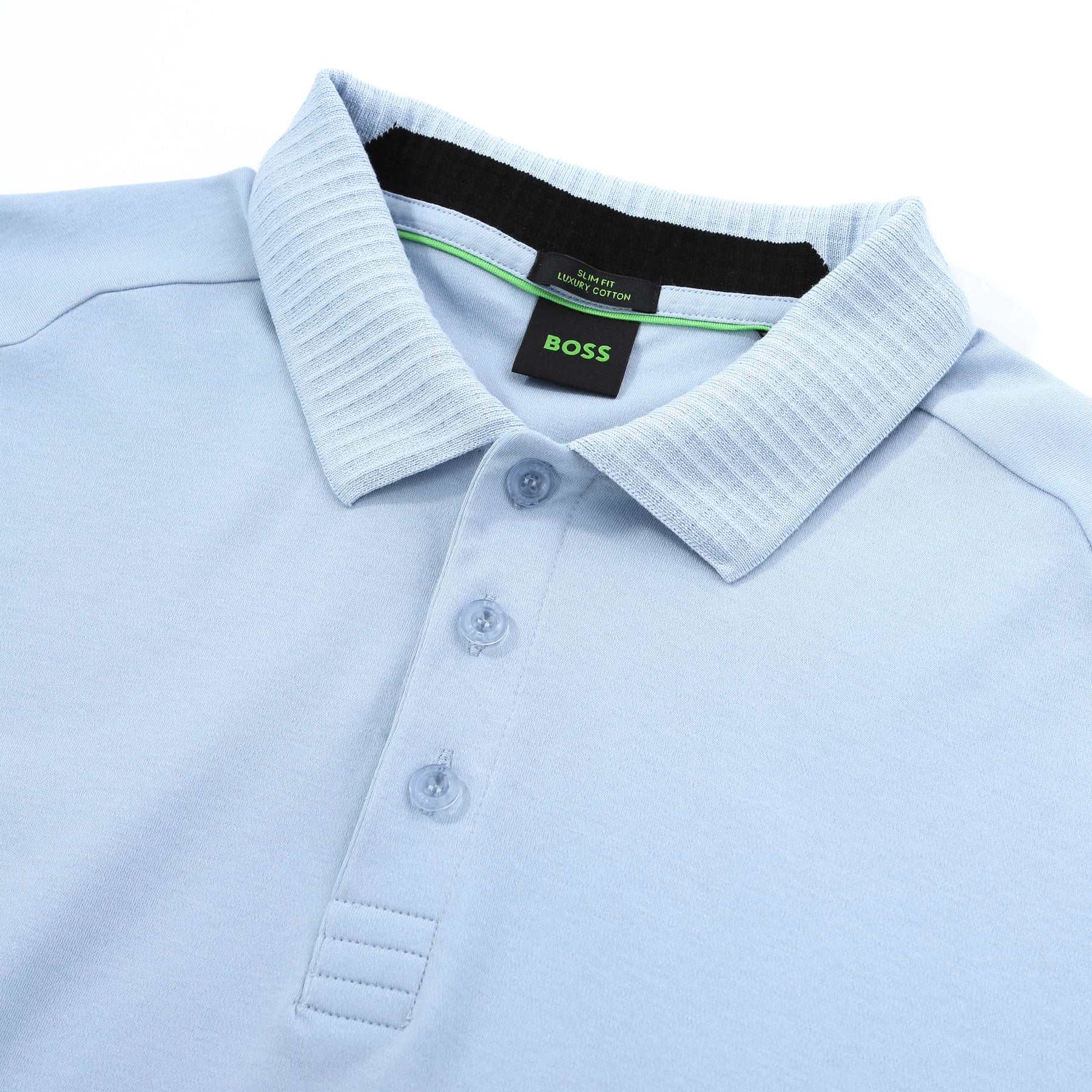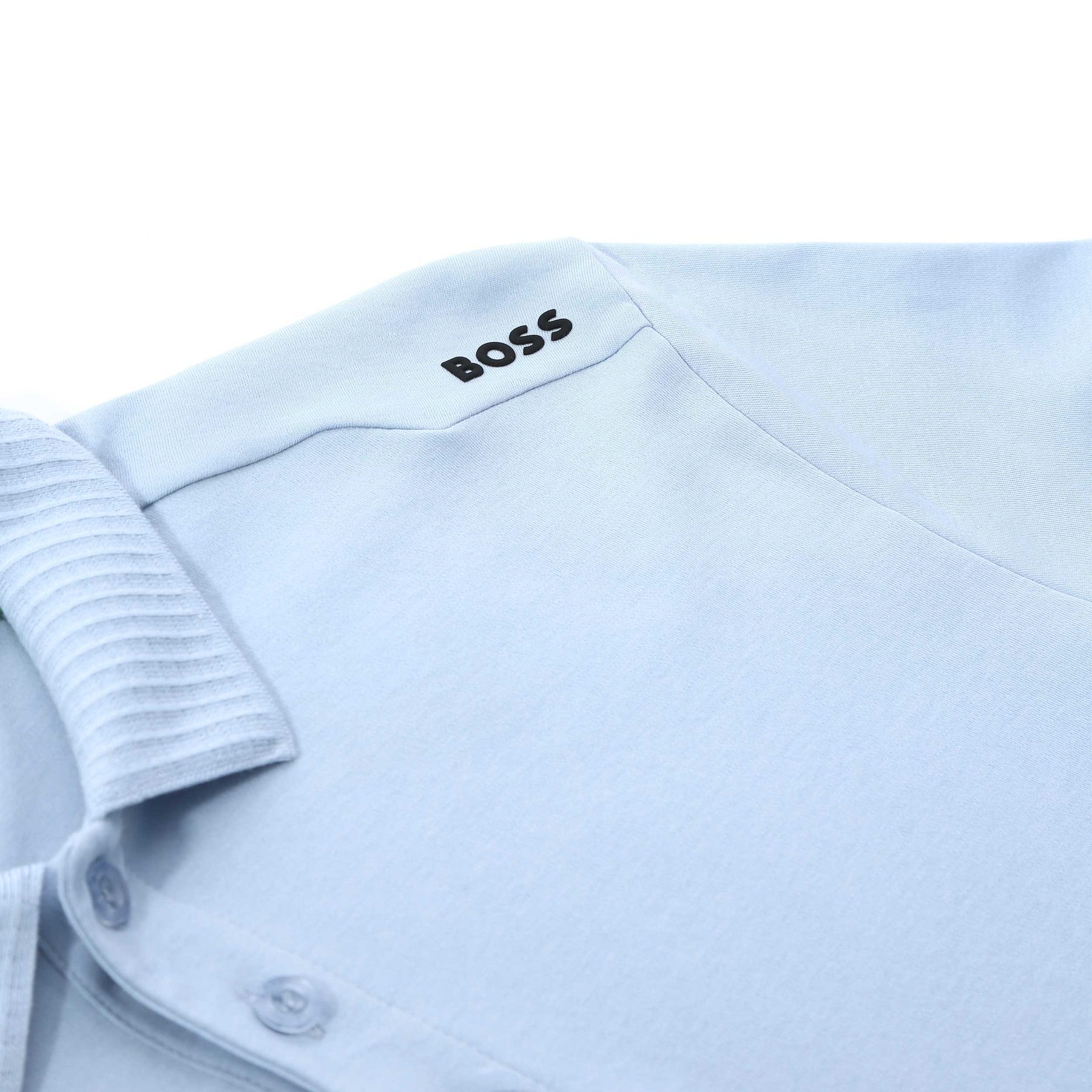BOSS PL Terrace Lux Polo Shirt in Open Blue. The PL Terrace Lux Polo Shirt is built for performance, comfort and clean athletic style. Crafted from 100% cotton, it offers breathable comfort and a structured feel that holds its shape throughout the day. Cut to a slim fit, this polo provides easy movement without losing its clean, tailored profile. Waffle design to the collar and a rubber BOSS logo in a contrasting colour to the shoulder. Three-button placket, and matching flat-knit cuffs for a sharp, considered finish.