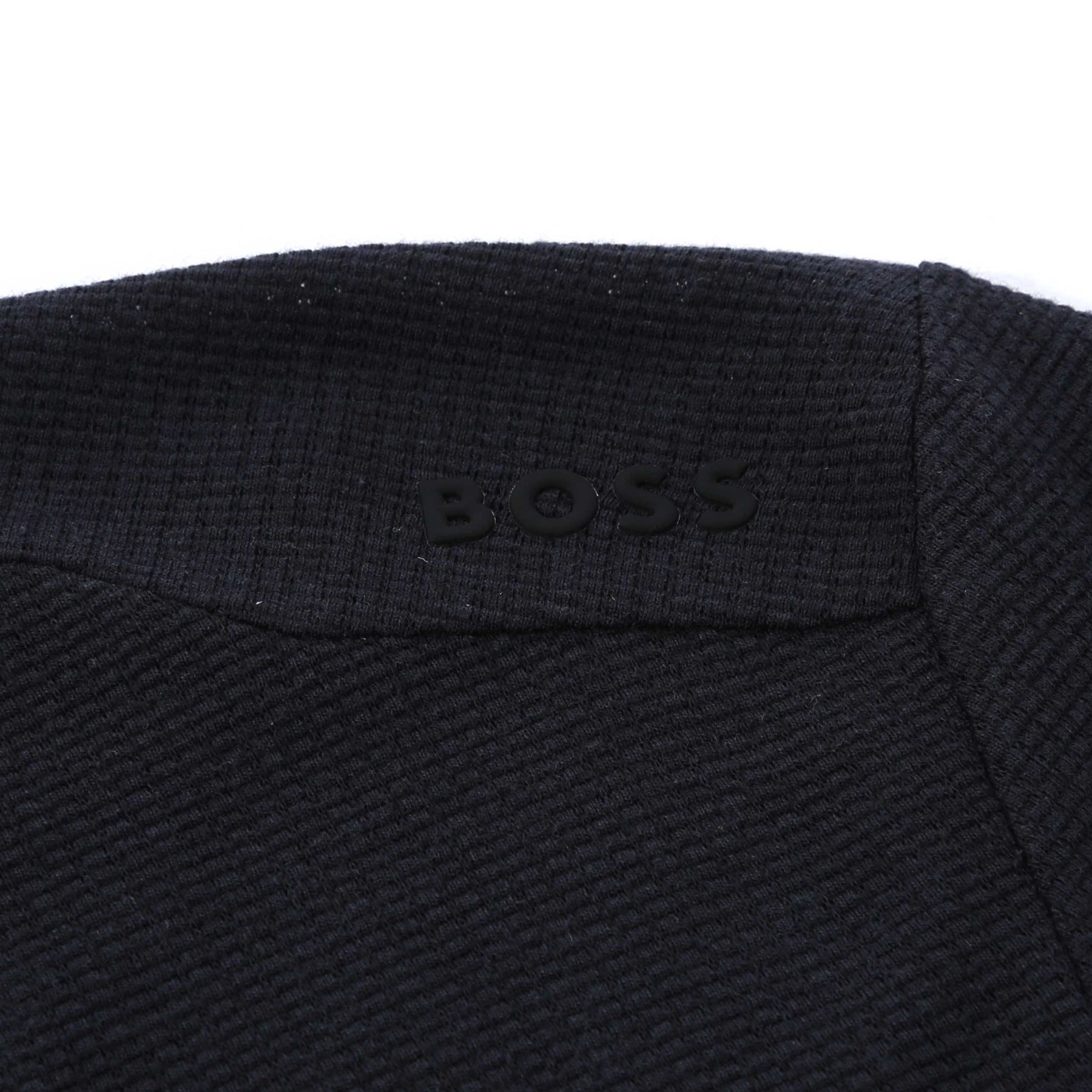 BOSS PL Terrace Zip Polo Shirt in Dark Blue. This regular fit polo shirt delivers modern casual style with premium texture and comfort. Crafted from a breathable cotton waffle jacquard fabric, the textured knit enhances airflow while adding subtle depth and character. The natural cotton construction ensures all-day comfort, making it an ideal lightweight polo shirt for warmer weather. A framed zip placket gives this BOSS designer polo a contemporary edge, while the BOSS branding adds a refined signature finish without overpowering the clean design. The regular fit provides a relaxed yet structured silhouette that pairs easily with chinos, tailored shorts or denim.