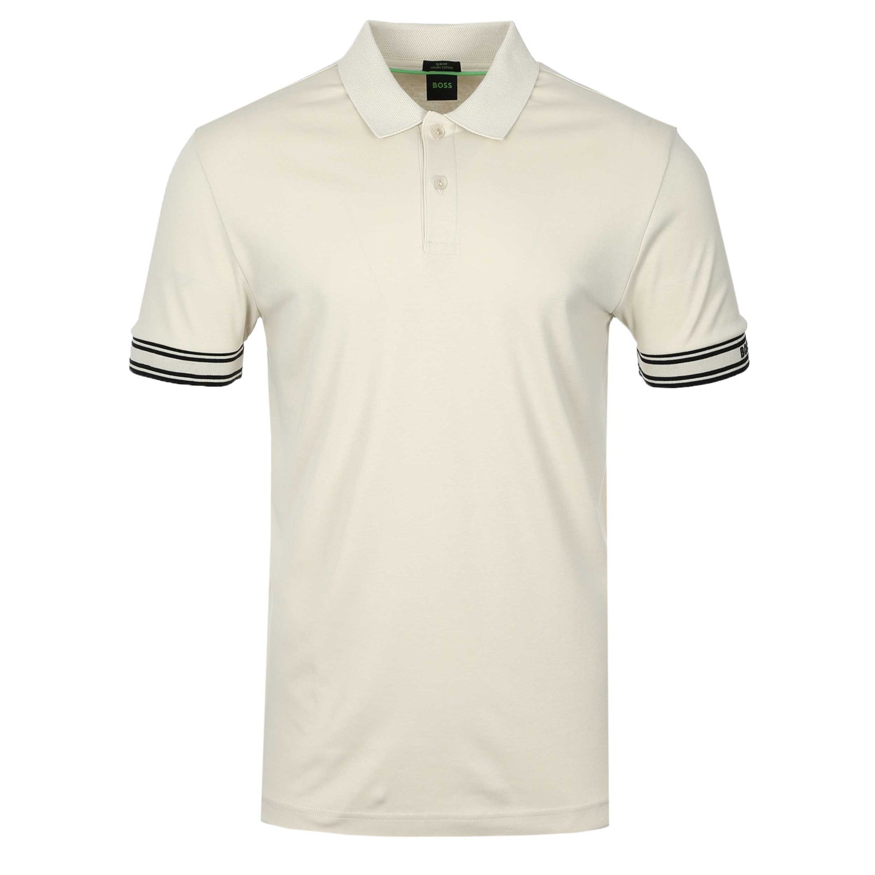 BOSS Polo Zone Polo Shirt in Open White. A classic Hugo Boss polo shirt in a slim fit. A 2 button fastening placket. A BOSS polo shirt with flat knit collar and cuffs. Contrasting colour stripe detailing to the cuffs. Raised rubber logo to the left cuff.