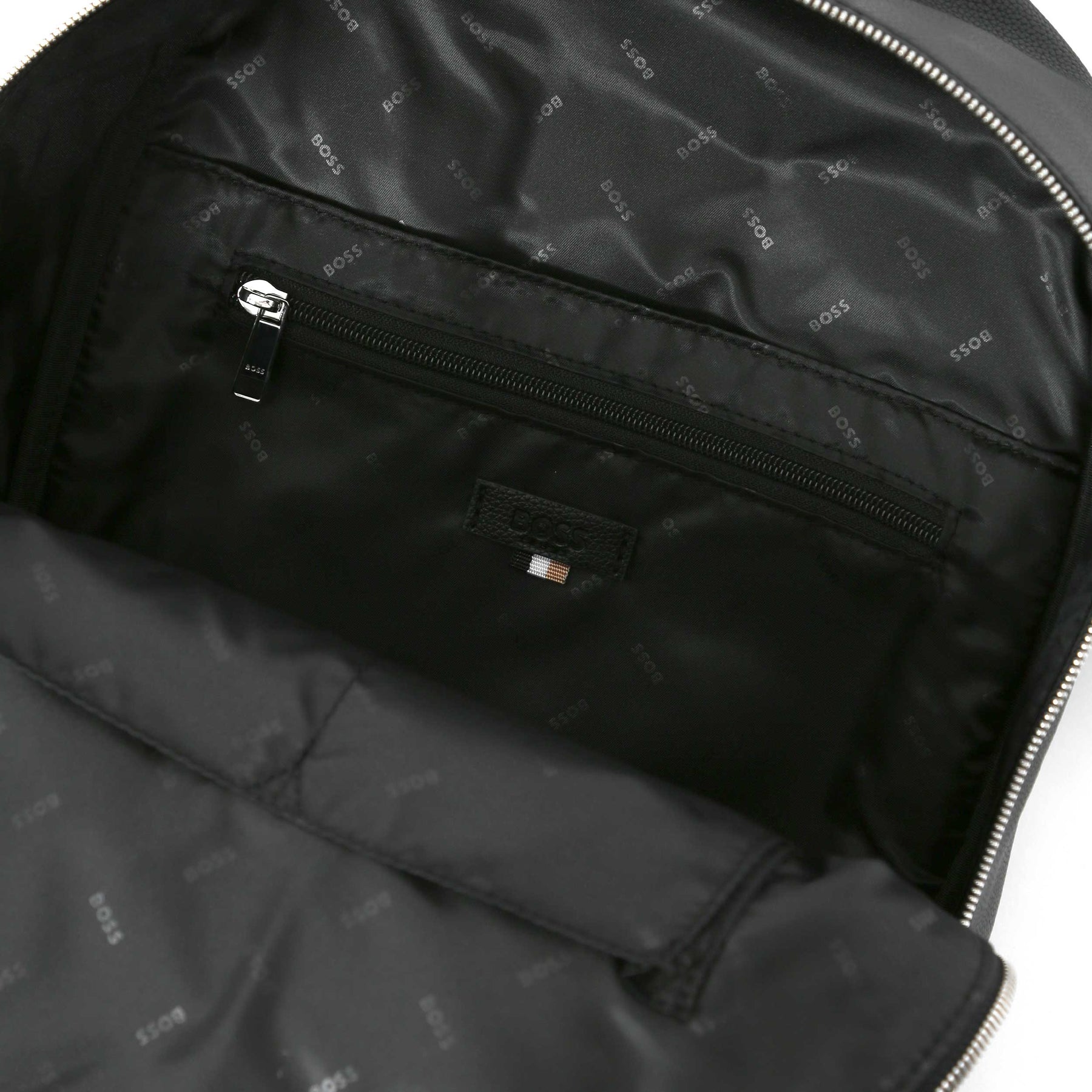 BOSS Ray_Backpack in Black. Man Bag by BOSS. Main compartment with a branded zip fastening. Adjustable shoulder strap. Inside this Hugo Boss bag has 1 slot compartment and 2 zip compartments. BOSS logo and tri-colour design to the front. Zip compartment to the front of the bag.