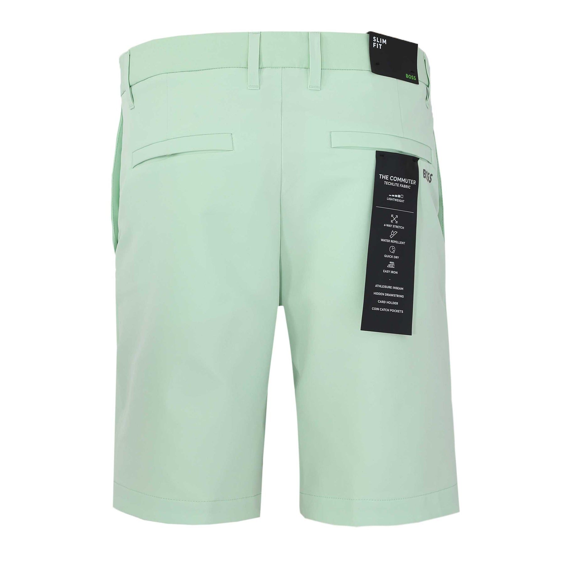 BOSS S Commuter 9 Short in Open Green. A regular fit short by BOSS. This 4 way stretch short arrives in a plain design with a regular rise. Featuring a partially elasticated waistband for comfort and a button fastening. 2 side slash pockets and 2 seat pockets. Hidden drawstring tothe waistband. Can be teamed up with a t-shirt or shirt for those casual or smart occasions.