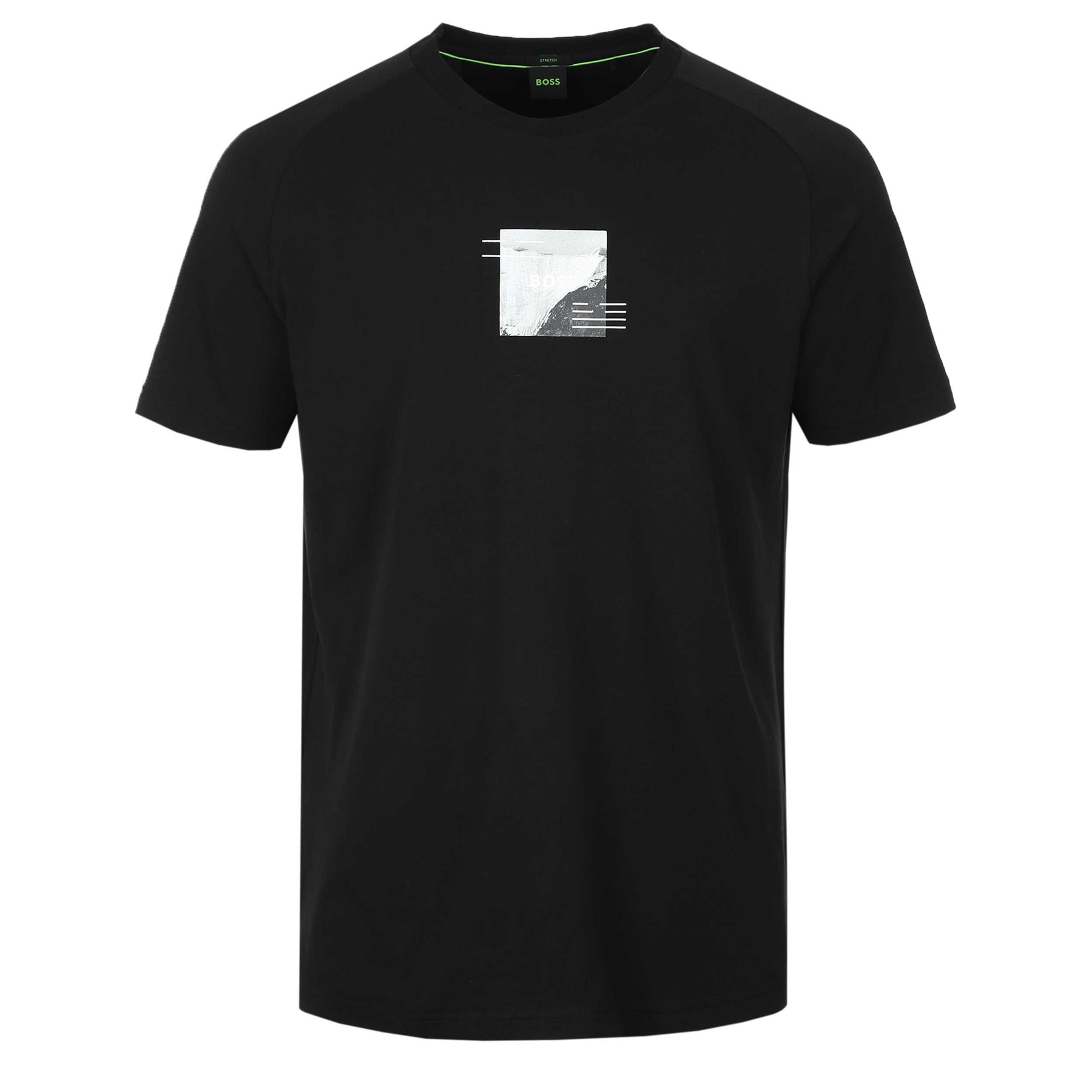 BOSS Tee Stripe Zone T Shirt in Black. Regular fit t shirt by BOSS. Crafted from a soft, stretchy cotton blend, this relaxed-fit BOSS T-shirt delivers a fresh, modern look with bold photo prints and subtle reflective accents. Finished with a clean logo detail, it’s made using at least 60% cotton sourced from regenerative agriculture and contains over 60% better raw materials—bringing effortless style with a more responsible approach.
