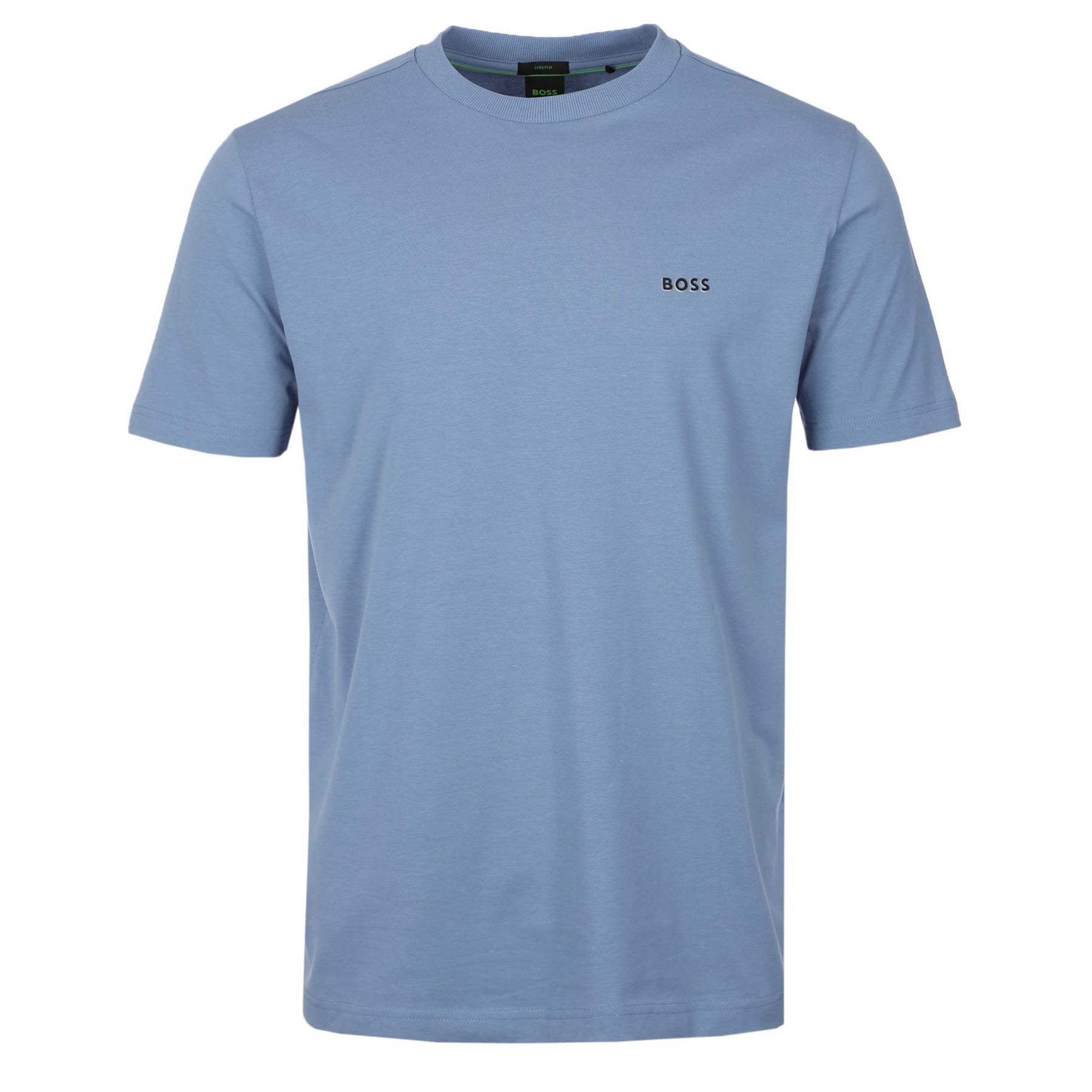 BOSS Tee T-Shirt in Open Blue. Regular fit t shirt by BOSS. A classic crew neck, short sleeve t shirt design constructed from a stretch cotton. It features a raised rubber BOSS logo print. Ribbed neckline. The perfect t shirt for those casual days.