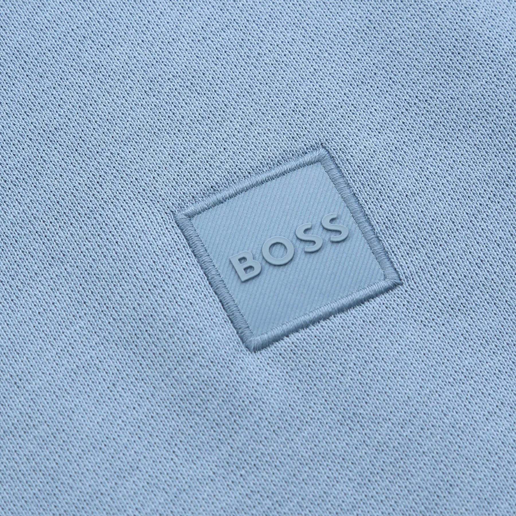 BOSS Westart Sweat Top in Light Pastel Blue. A relaxed fit Hugo Boss sweatshirt with a classic crew neck. This sweatshirt arrives with ribbed cuffs and is constructed from a French terry cotton. Finished with a tonal BOSS logo on the chest.