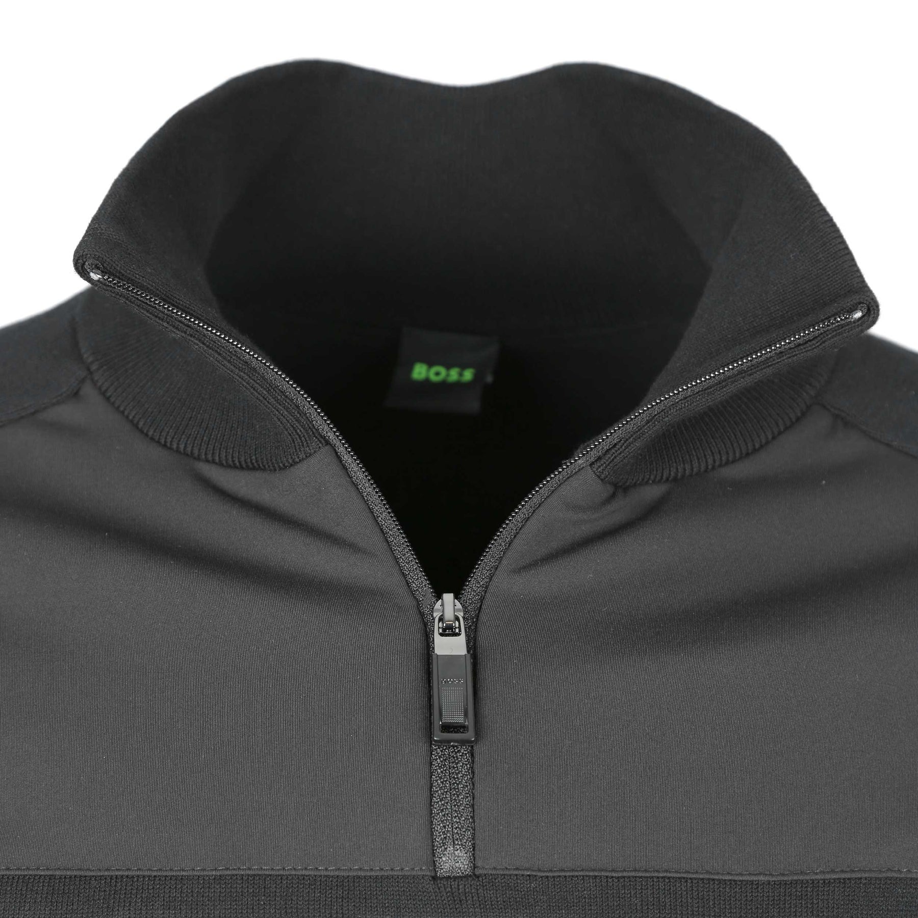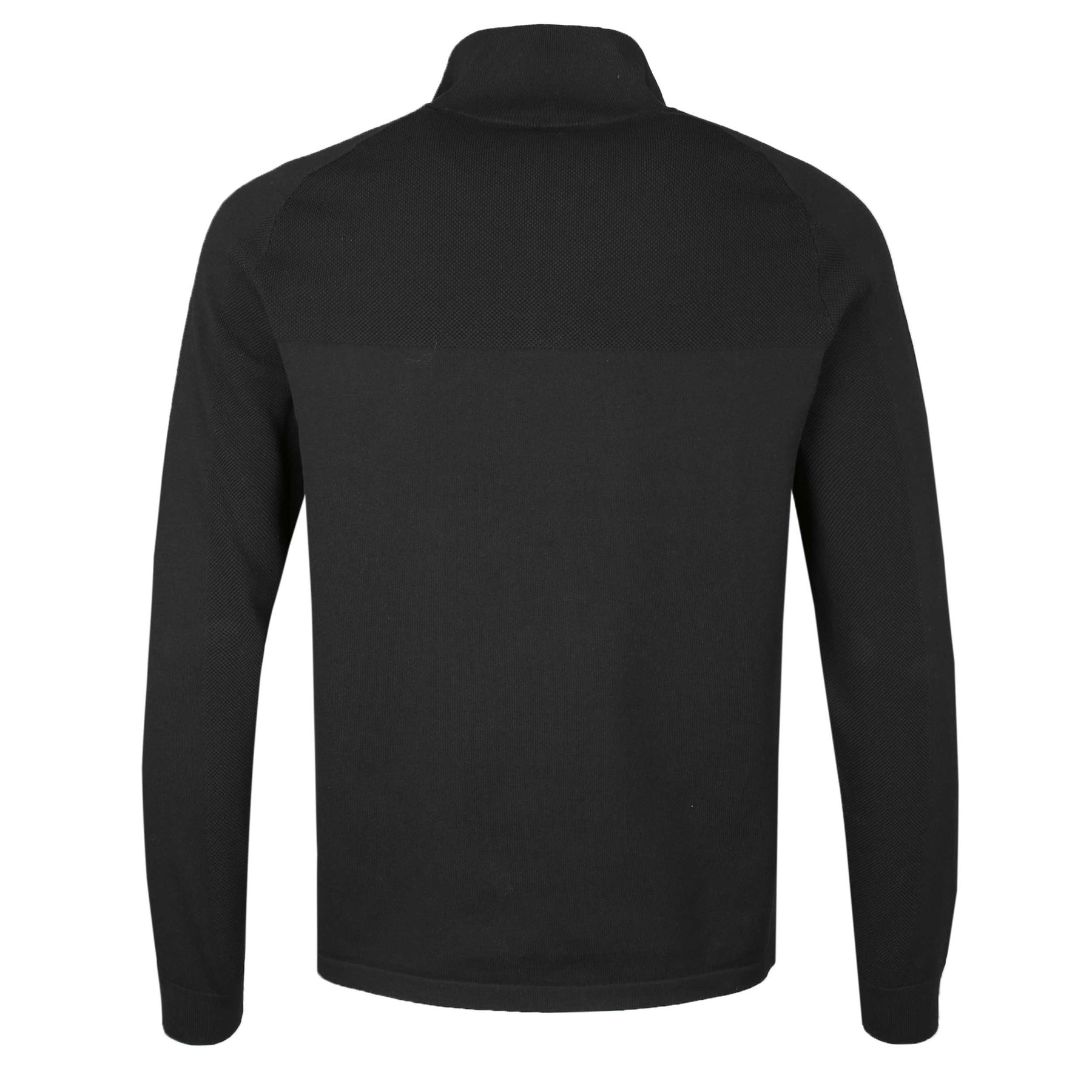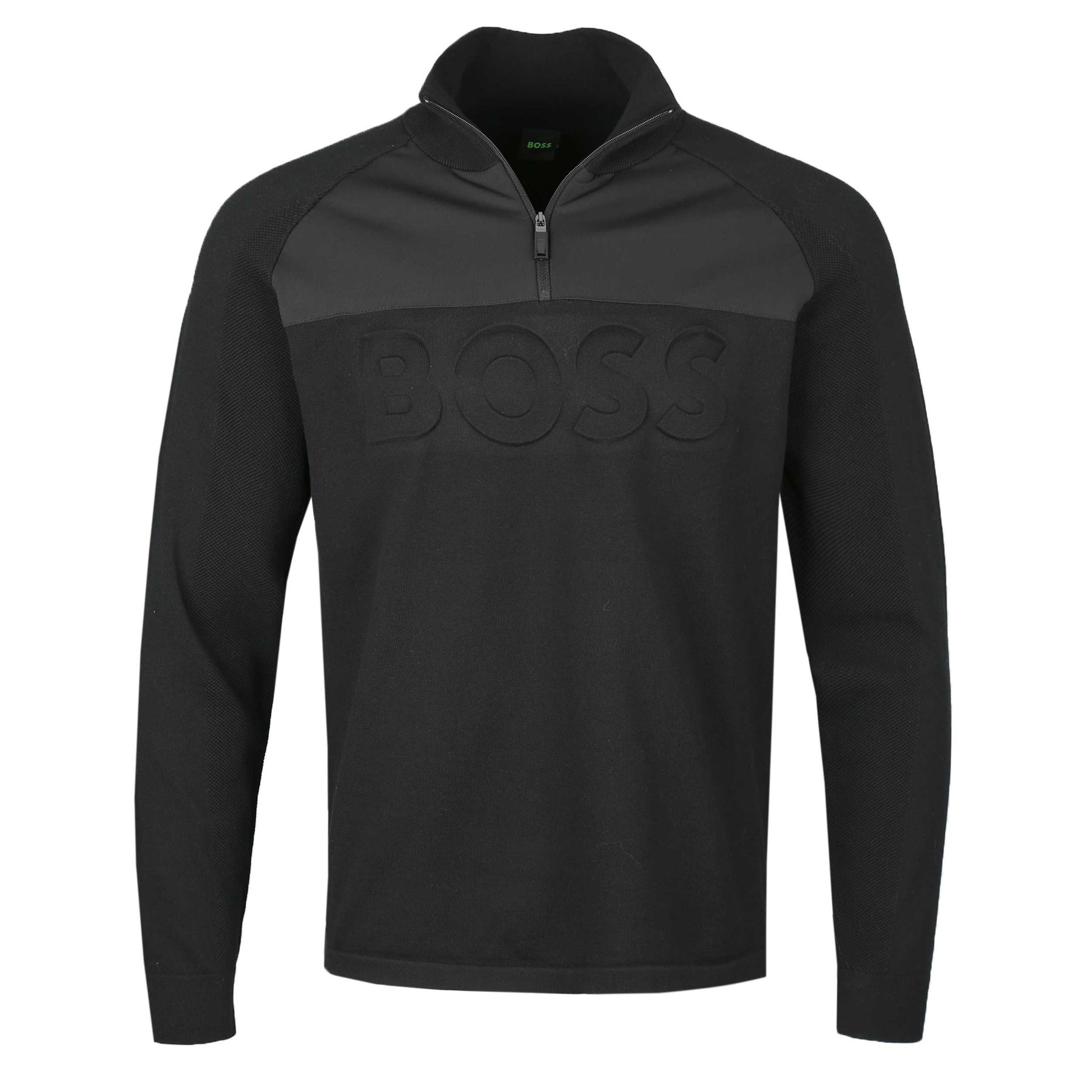 BOSS Zine Knitwear in Black. A high neck sweat top by BOSS. Featuring the BOSS logo across the chest. With a ribbed collar and cuffs. Finished with a half zip fastening. Perfect for everyday.