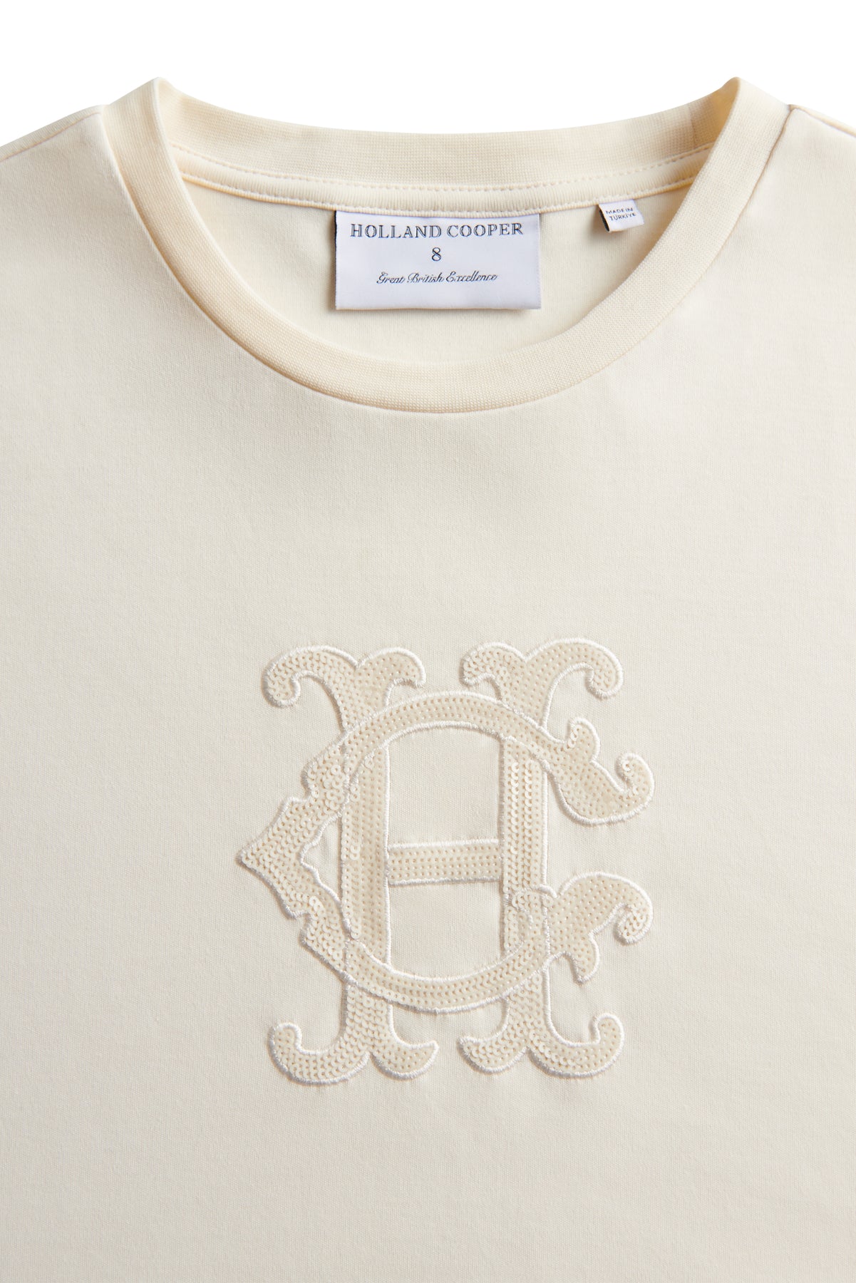 At the centre front, tonal sequin embroidery showcases the signature HC heraldic motif, adding a subtle touch of texture and understated luxury. Finished with a classic crew neckline and short sleeves, this versatile piece blends casual ease with elevated detailing — perfect for pairing with denim, tailoring, or relaxed weekend looks.