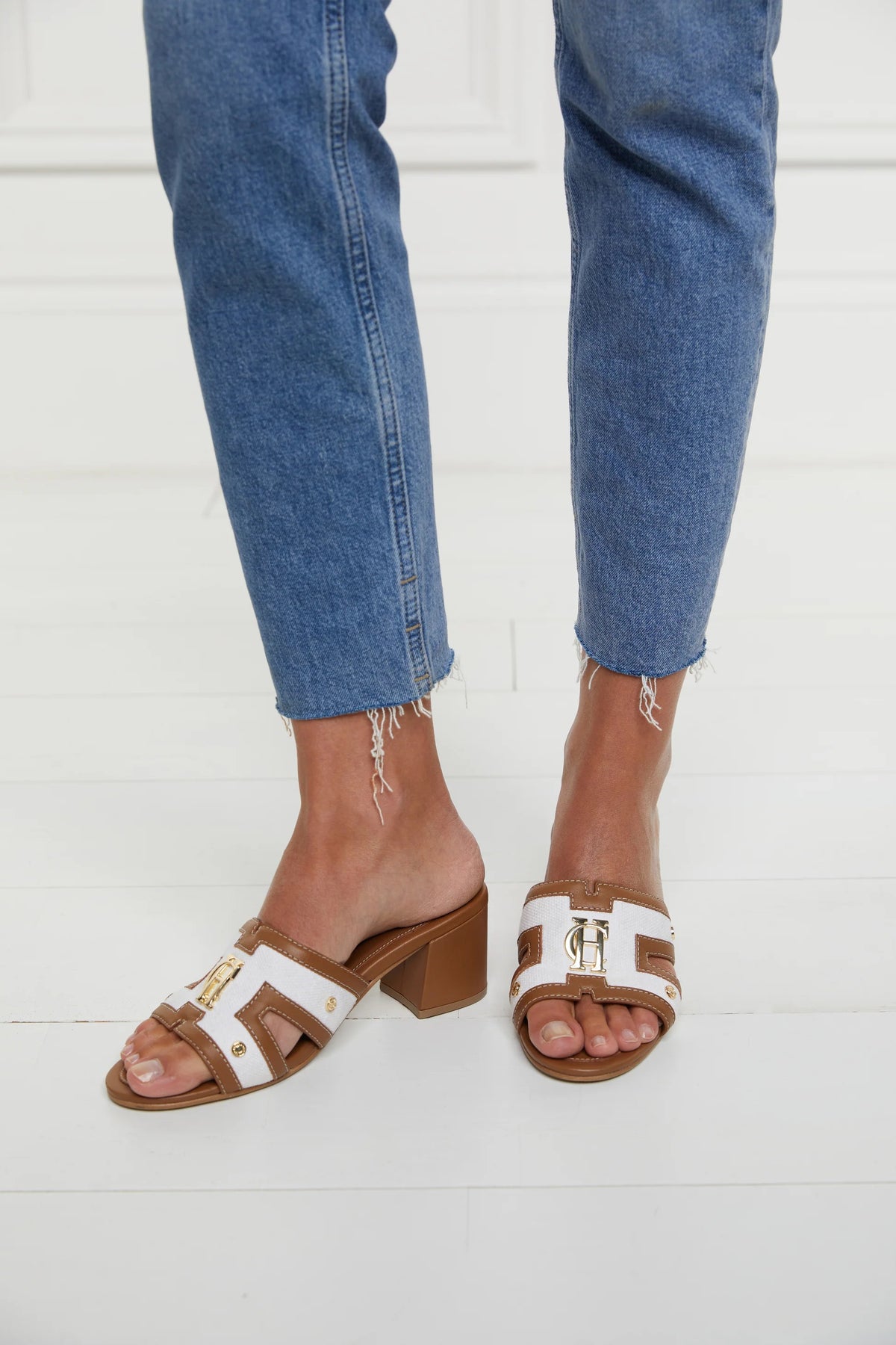 Holland Cooper Monogram Mule Ladies Heel Slide in Tan Canvas. A classic and sophisticated shape mule shoe perfect for summer. Made from leather and a cushioned sole for extra comfort. Block design heel to the shoe. Contrasting colour canvas strap design. Detailed with a cut out detail and finished with the signature HC logo in gold.
