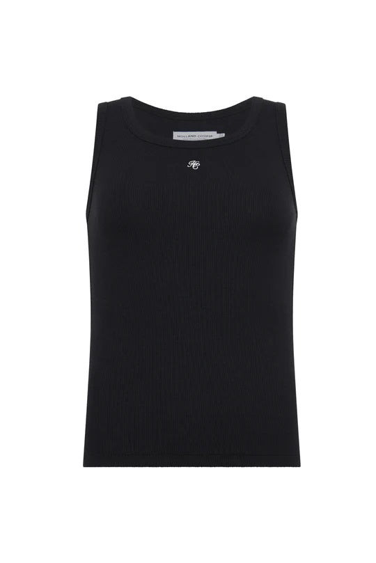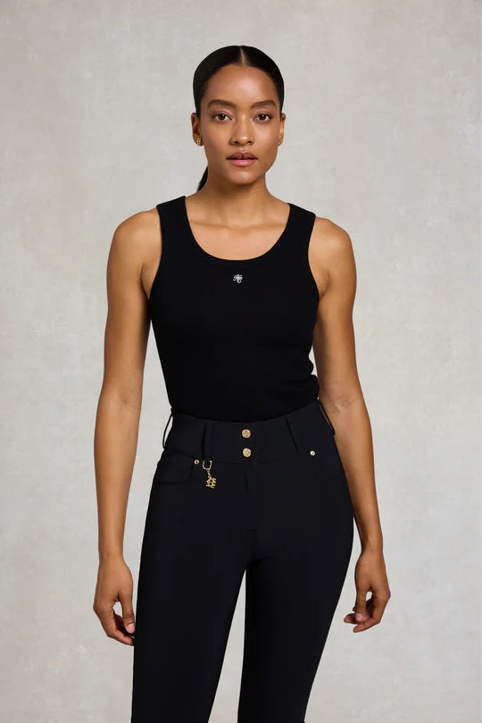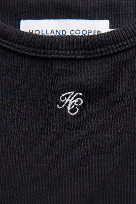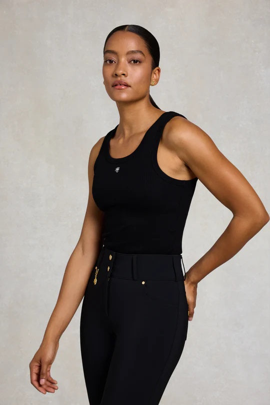 Holland Cooper Rebecca Rib Tank in Black. Elevate your everyday wardrobe with this refined essential, designed with timeless British sophistication. Crafted from a premium cotton-elastane blend, it offers a smooth, breathable feel with just the right amount of stretch for all-day comfort. Expertly tailored in a sleek slim fit, it creates a clean, flattering silhouette while maintaining effortless wearability. Finished with the signature HC embroidery at the neckline, this understated detail adds a subtle mark of heritage luxury, making it a versatile foundation piece for both smart and casual styling.