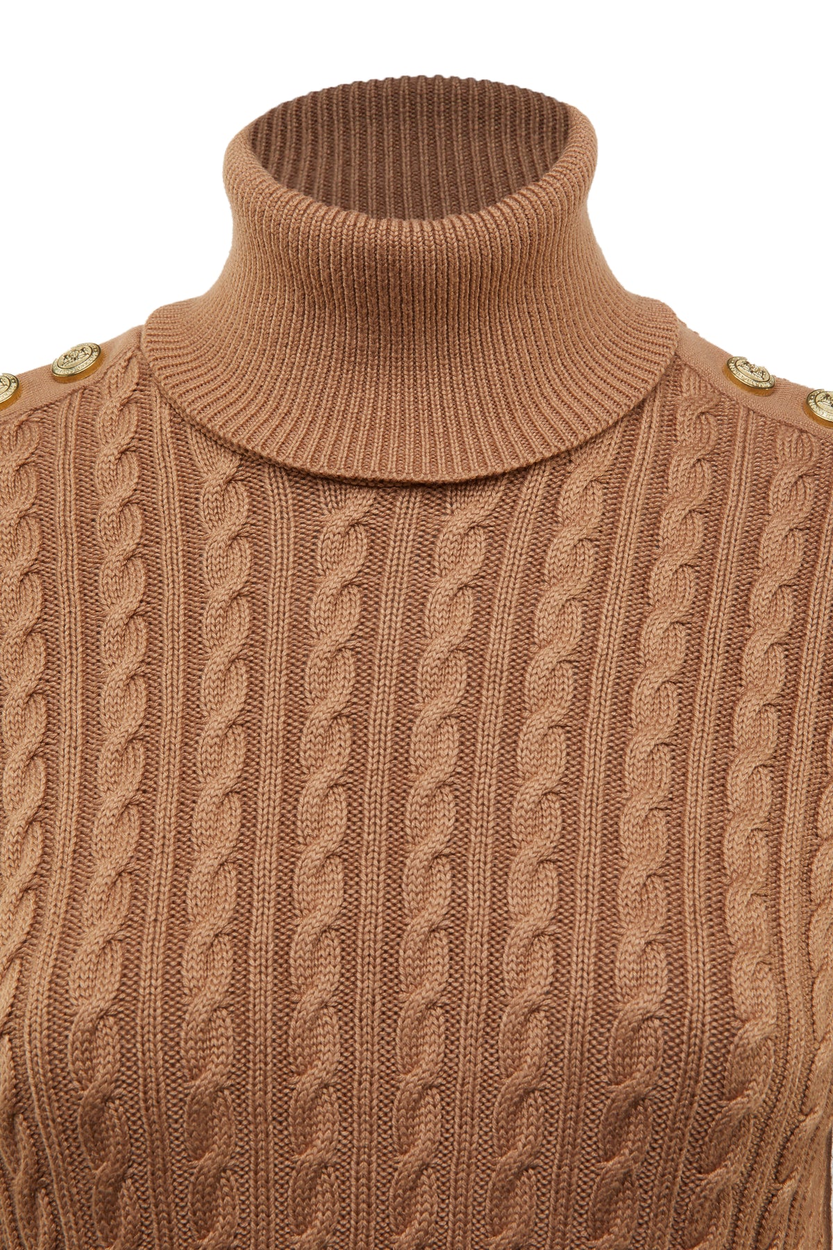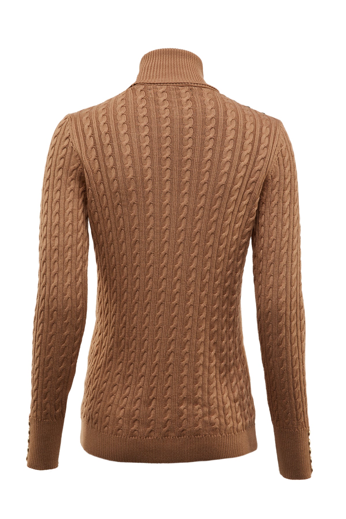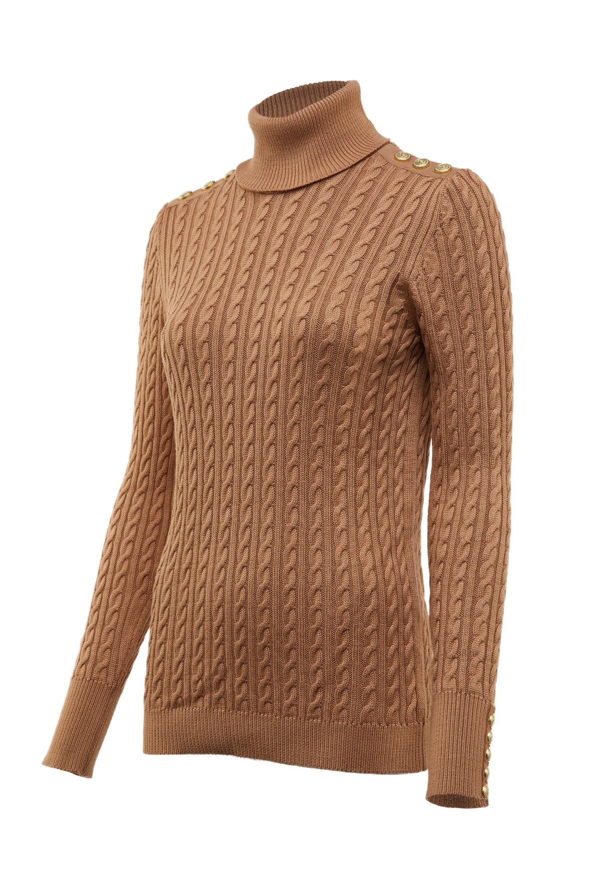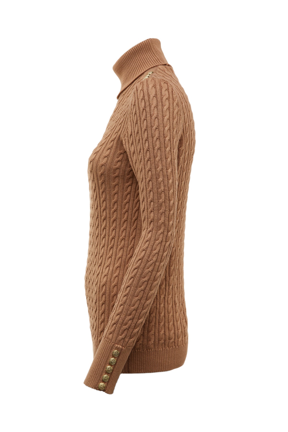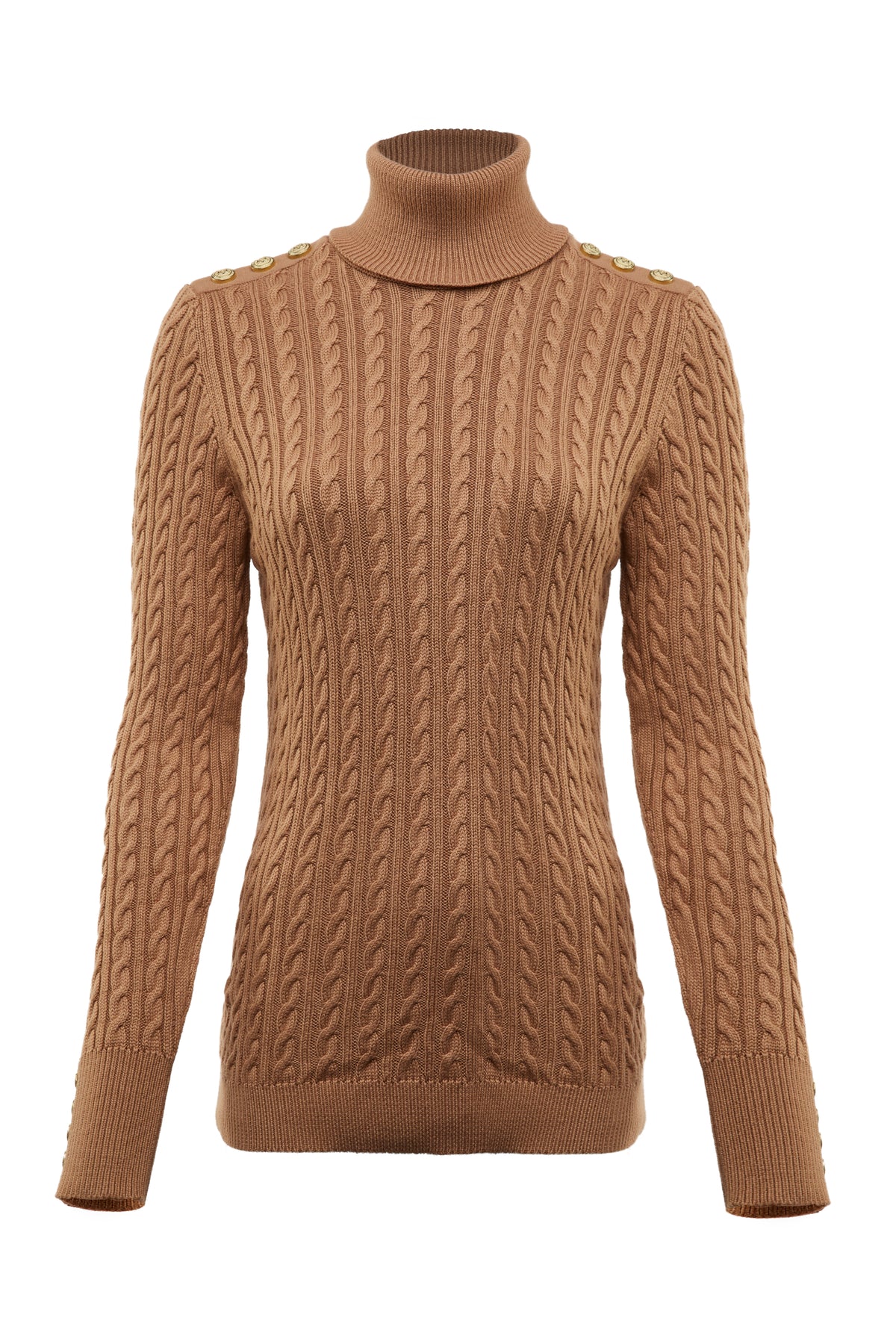Holland Cooper Seattle Roll Neck Cable Knitwear in Dark Camel Marl. Relaxed fitting knitwear by Holland Cooper. It has a roll neck with long sleeves. Signature gold button features to both shoulders and cuffs of the knitwear. Cable knit design. Ribbing to the neckline, cuffs and waistband.