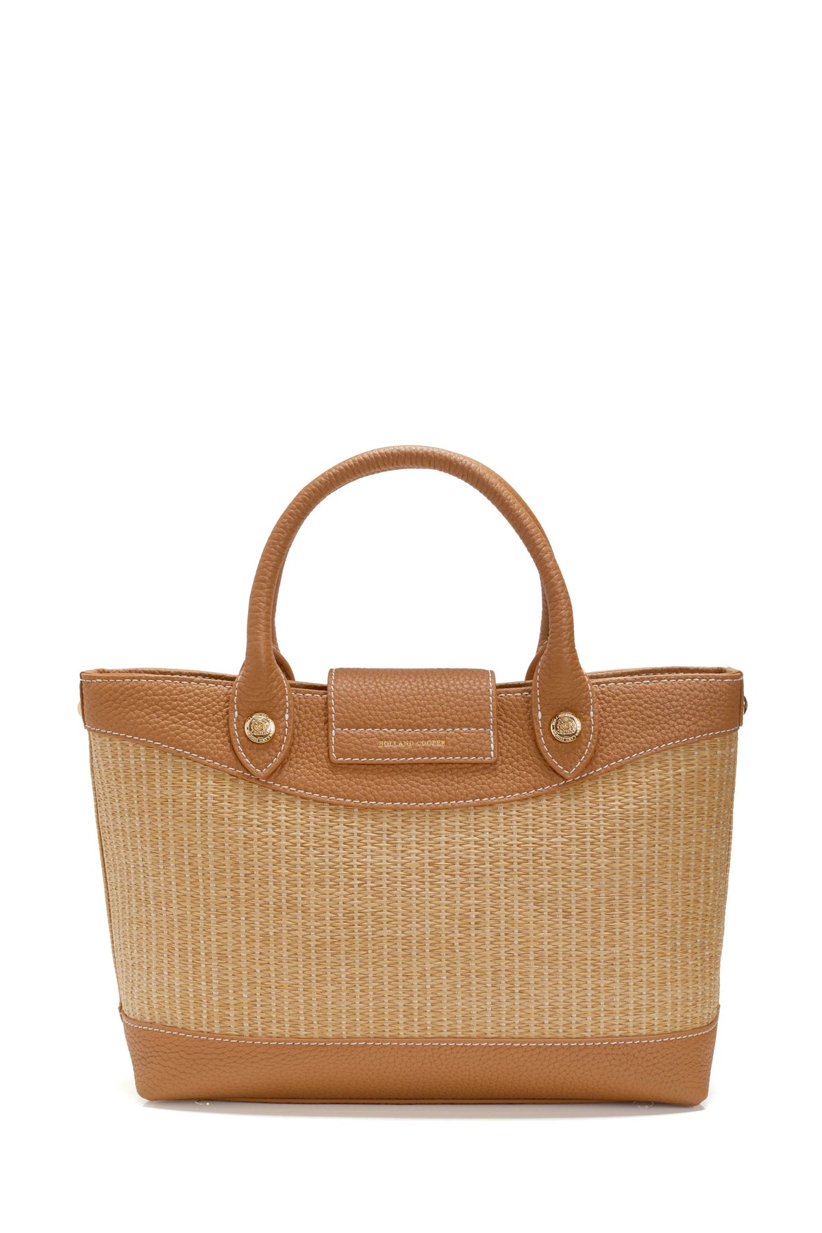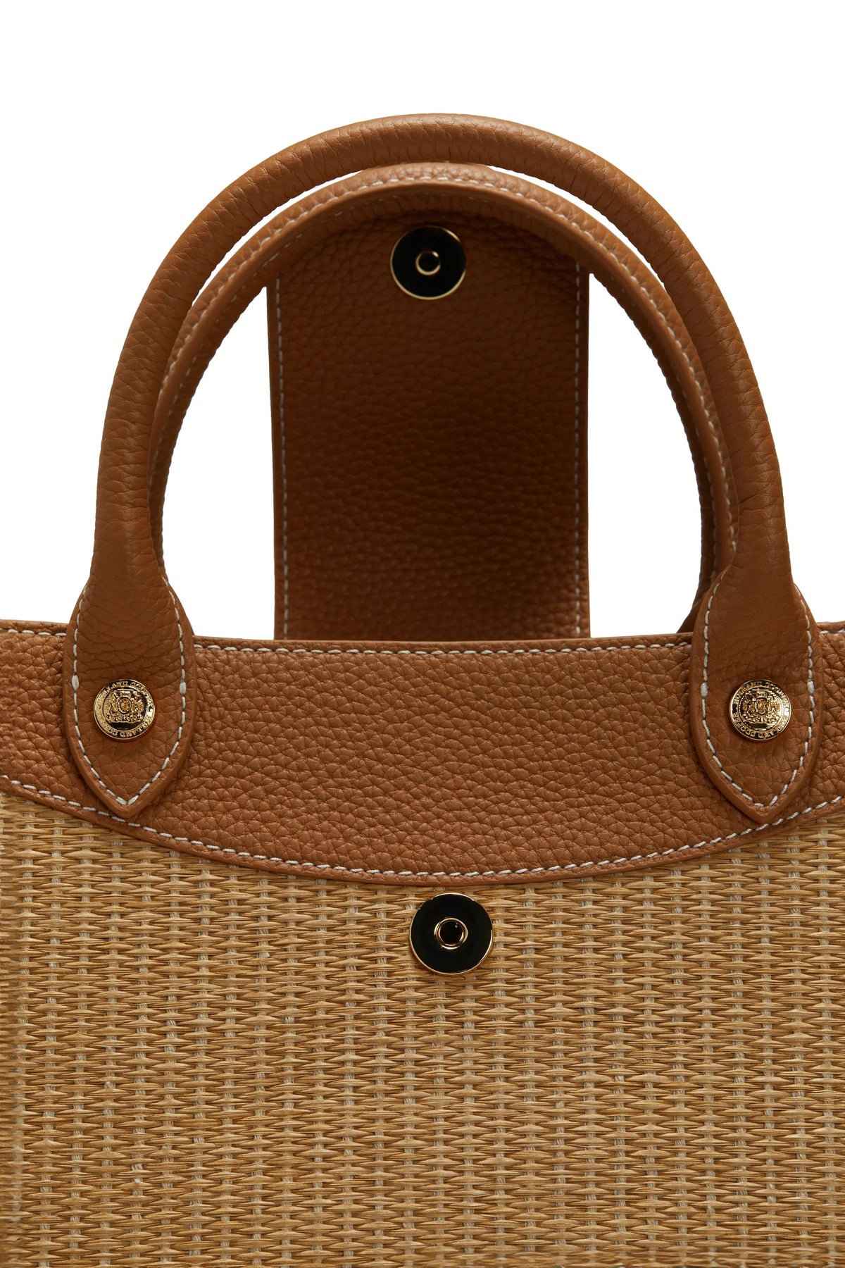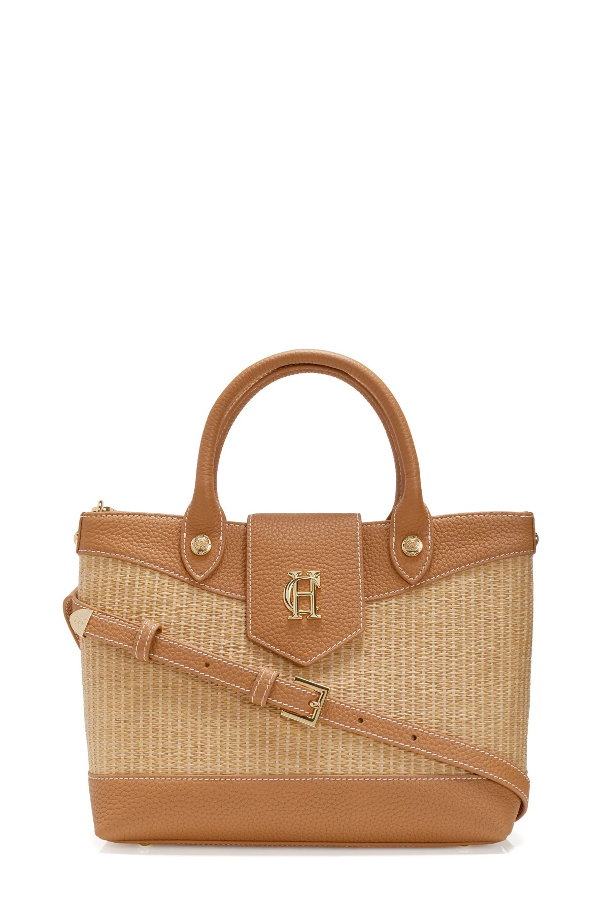 Holland Cooper Valencia Mini Tote Bag in Tan. Tote bag by Holland Cooper. Woven style tote bag with a carrier handle as well as a detachable shoulder strap. Zip fastening to the top with a zip pocket to the inside. Leather trims reinforce the bag. Finished with gold HC branding sat upon a magnetic fold over flap to the front.