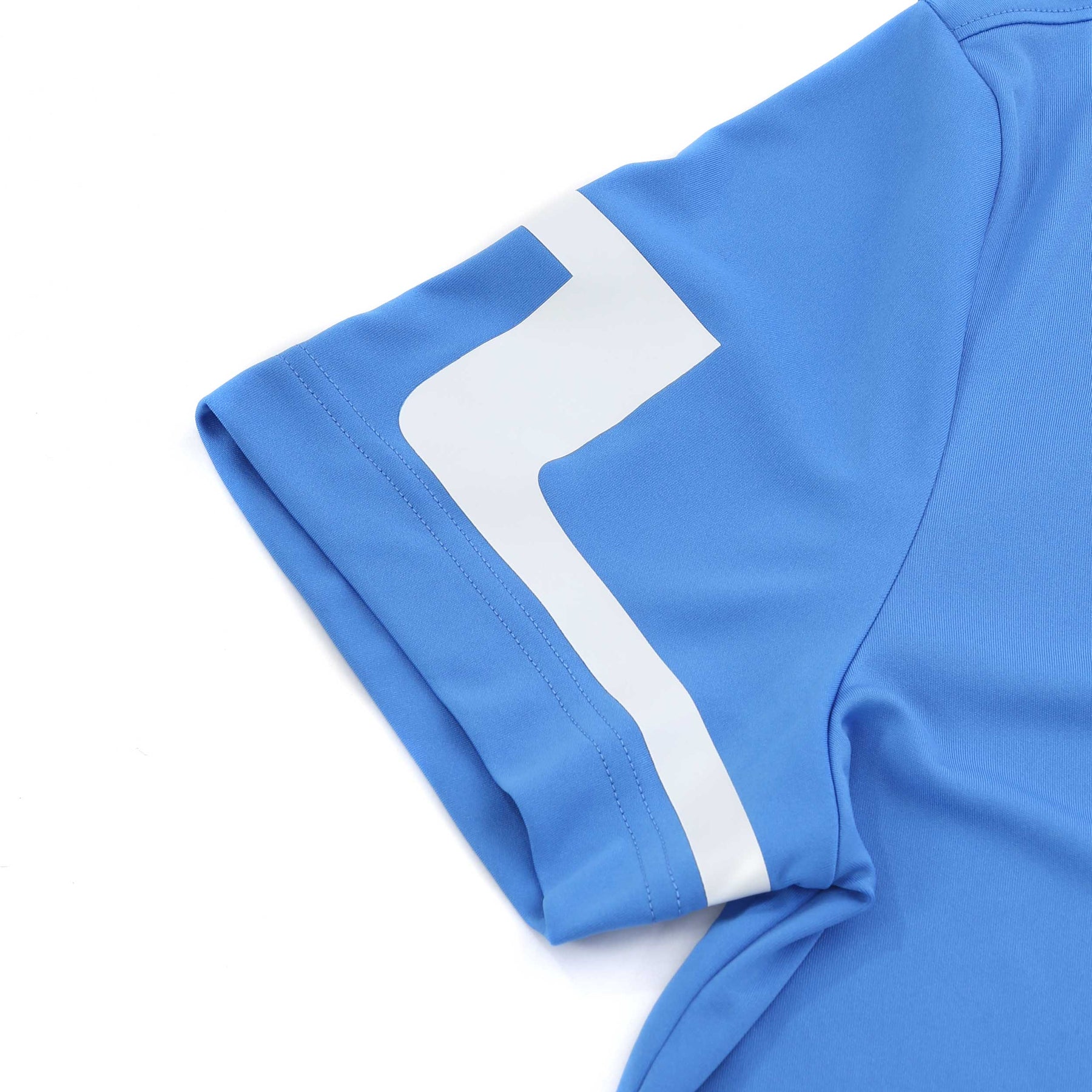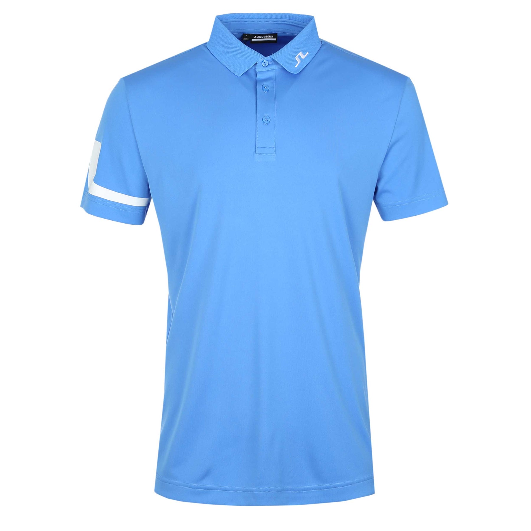 J.Lindeberg Heath Polo Shirt in Sonic Blue. A regular fit polo shirt by J.Lindeberg. This polo shirt is constructed from a stretchable TX jersey fabric. This lightweight polo shirt has moisture-wicking technology and 4 way stretch properties. 3 button fastening placket with a flat knit collar. Embroidered J.Lindeberg logo to the collar. Large printed logo to the right sleeve.