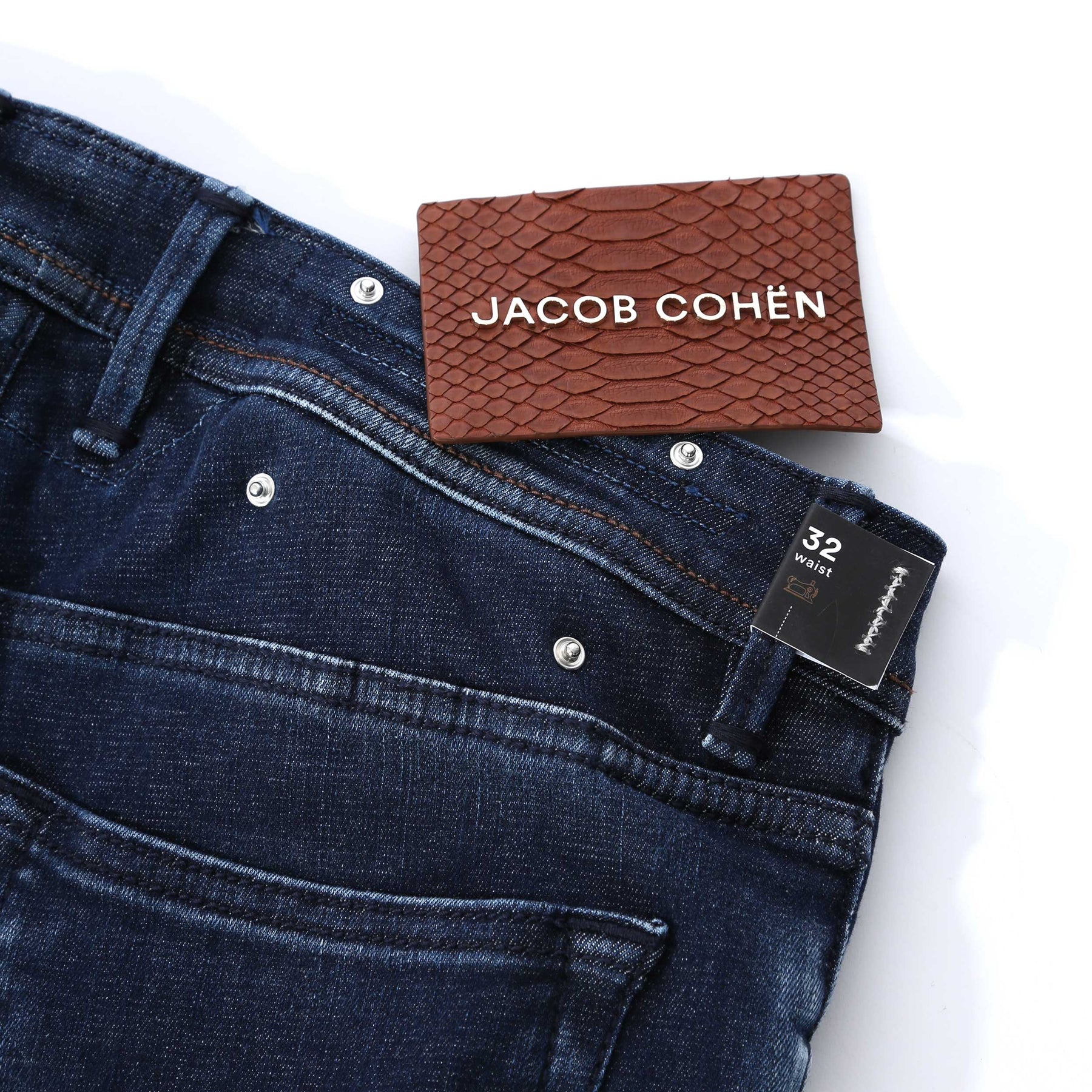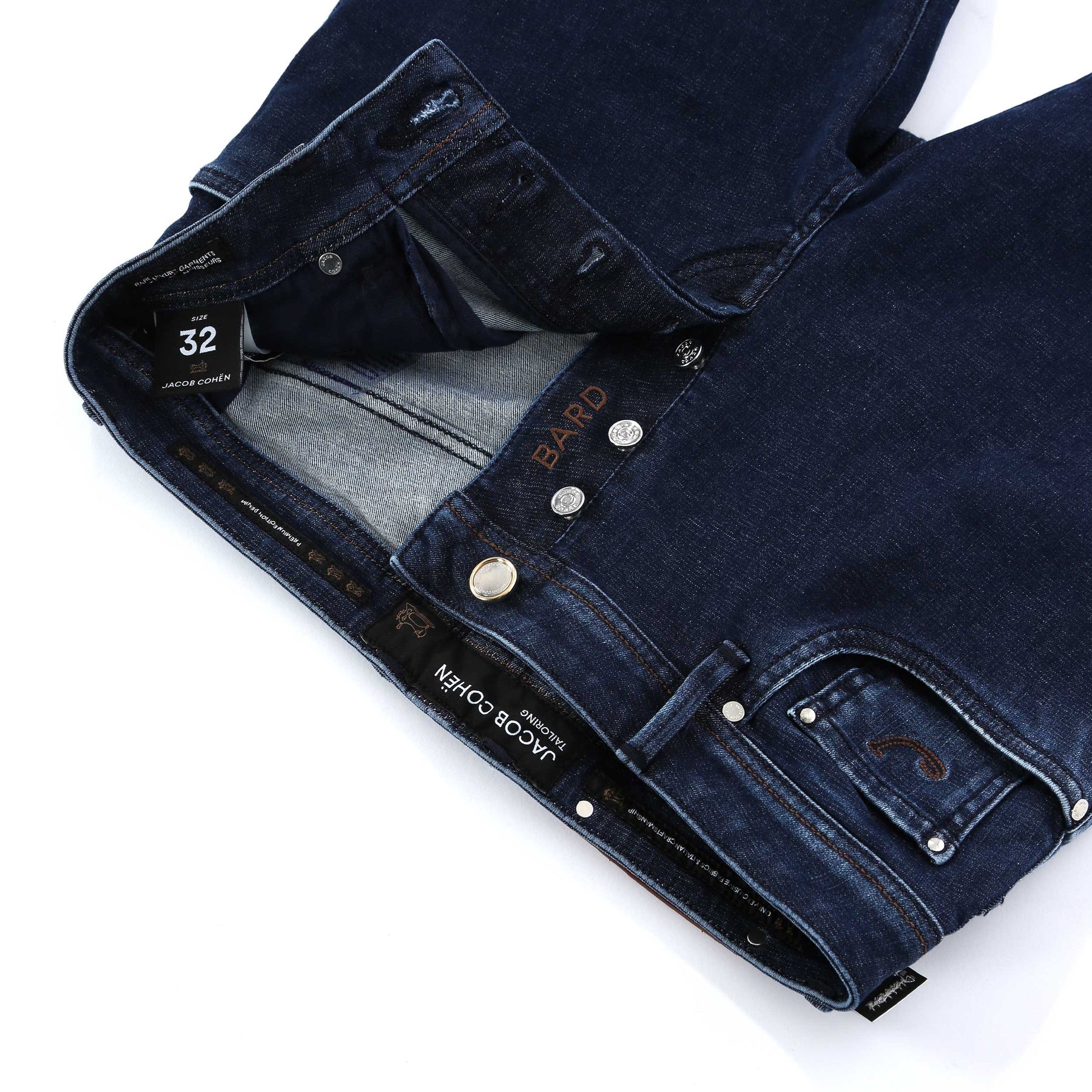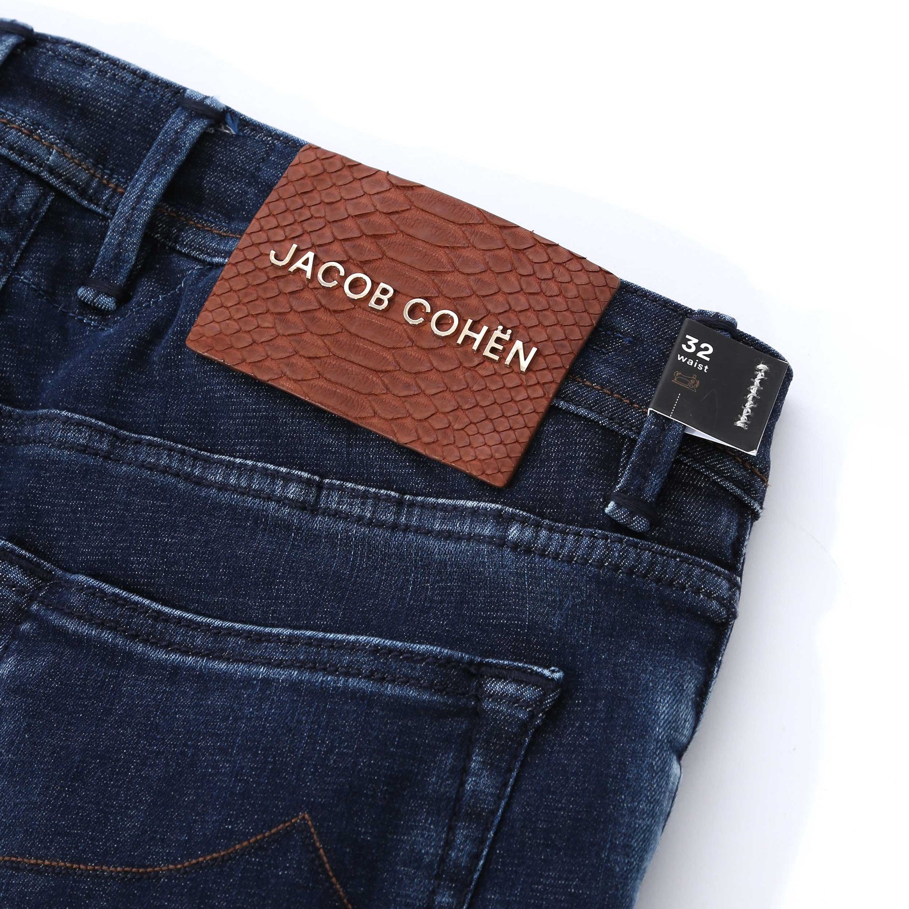 Jacob Cohen Bard Jean in Dark Blue Denim with Lizard Badge. A high quality jean by Jacob Cohen. A 5 pocket jean style, featuring a button and zip fly fastening with branded button detailing. A mid-blue, hand sanded denim. Finished with a remvoable lizard skin Jacob Cohen badge on the rear.