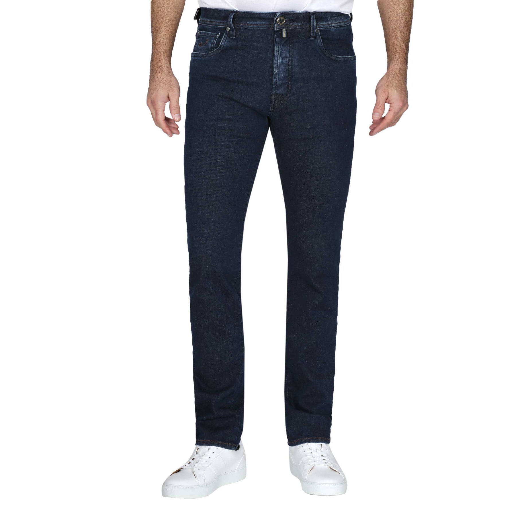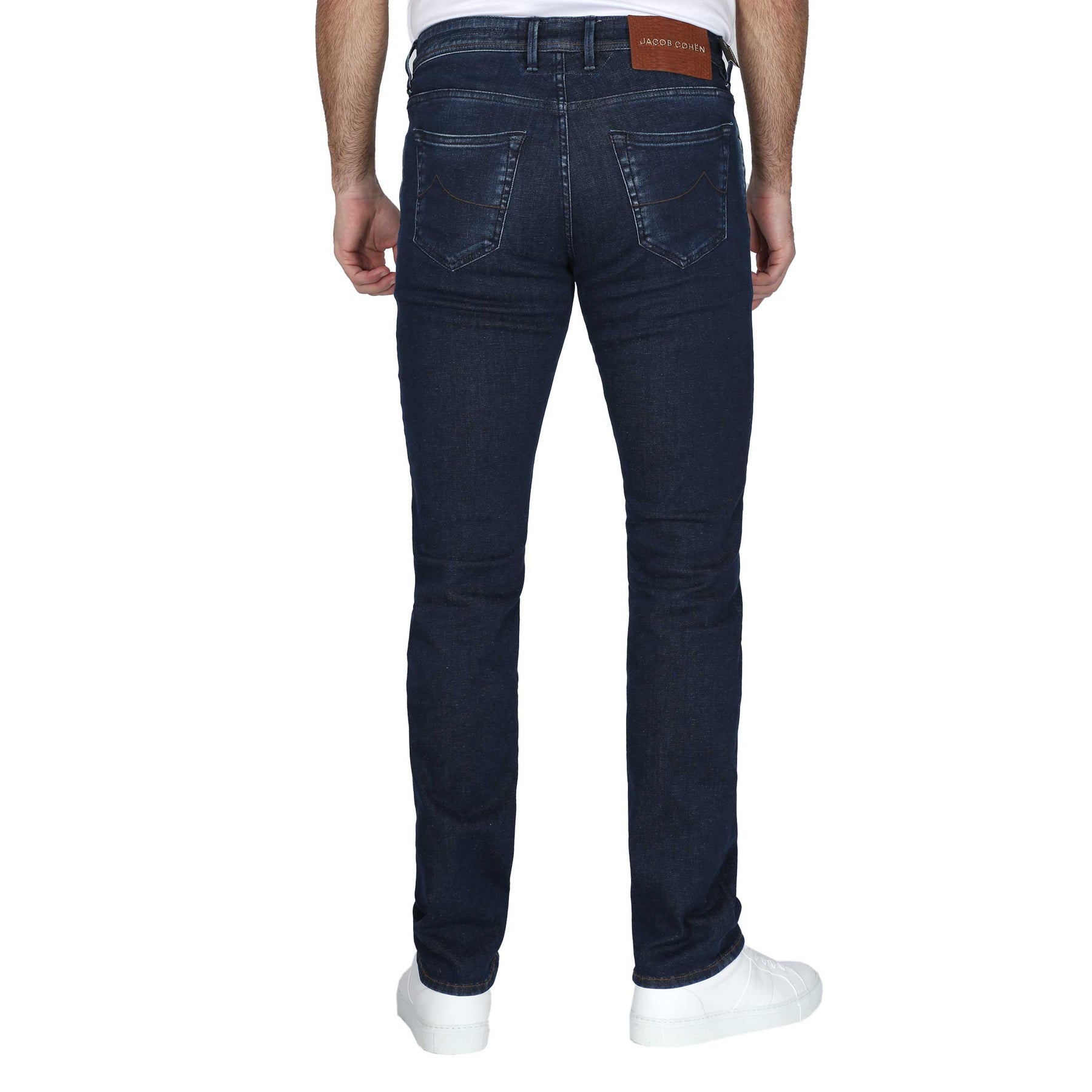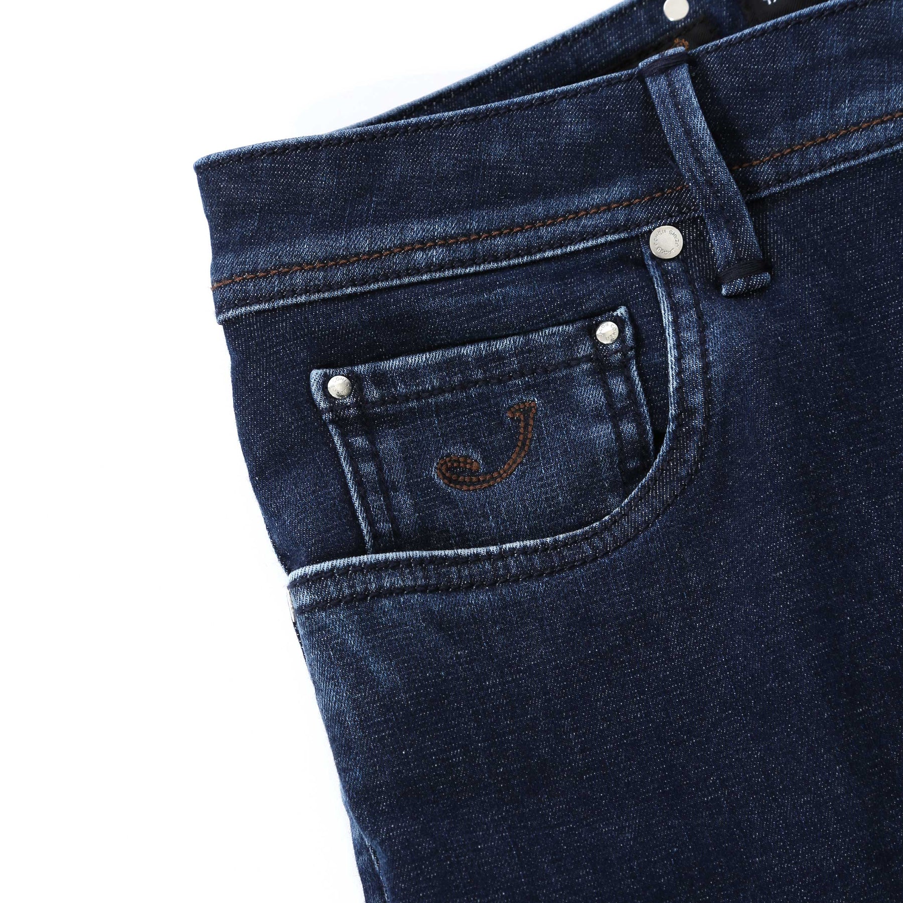 Jacob Cohen Bard Jean in Dark Blue Denim with Lizard Badge. A high quality jean by Jacob Cohen. A 5 pocket jean style, featuring a button and zip fly fastening with branded button detailing. A mid-blue, hand sanded denim. Finished with a remvoable lizard skin Jacob Cohen badge on the rear.