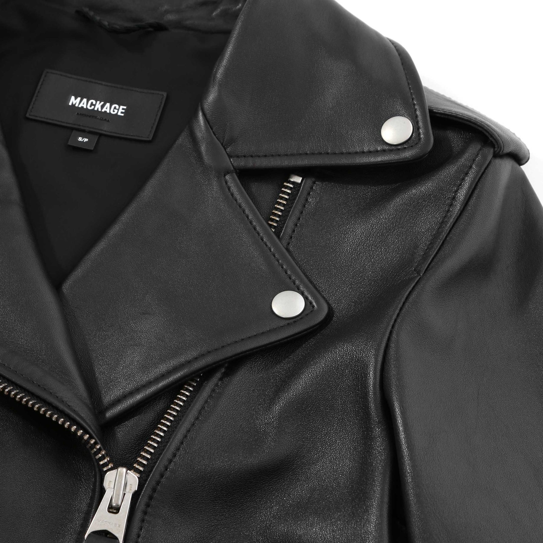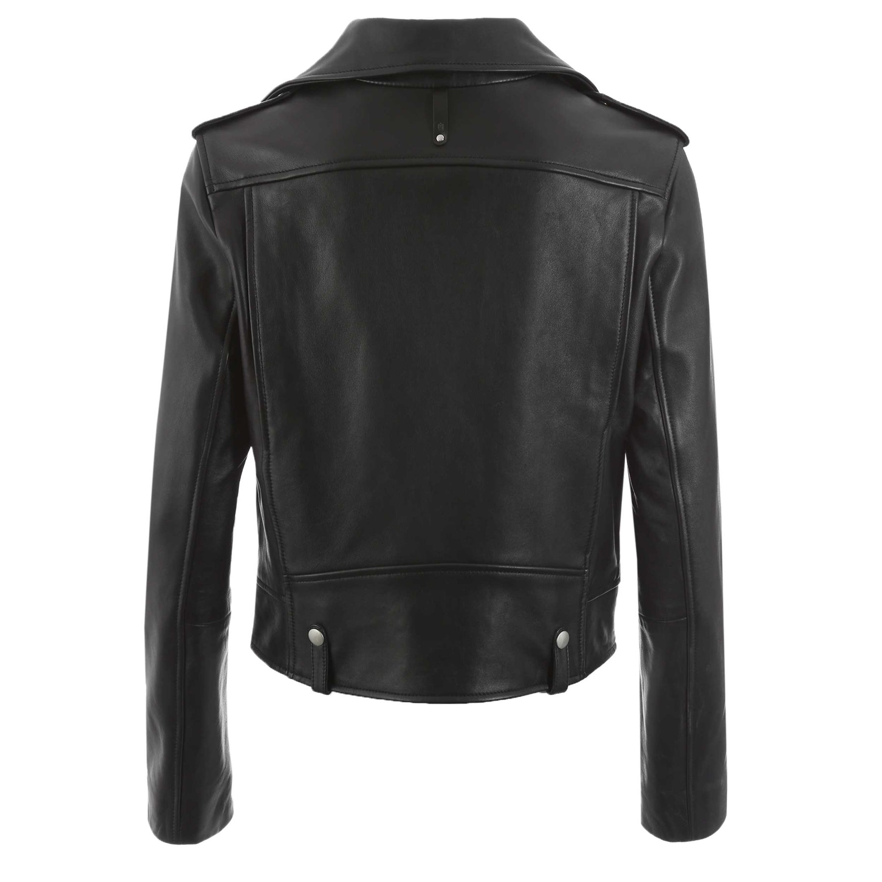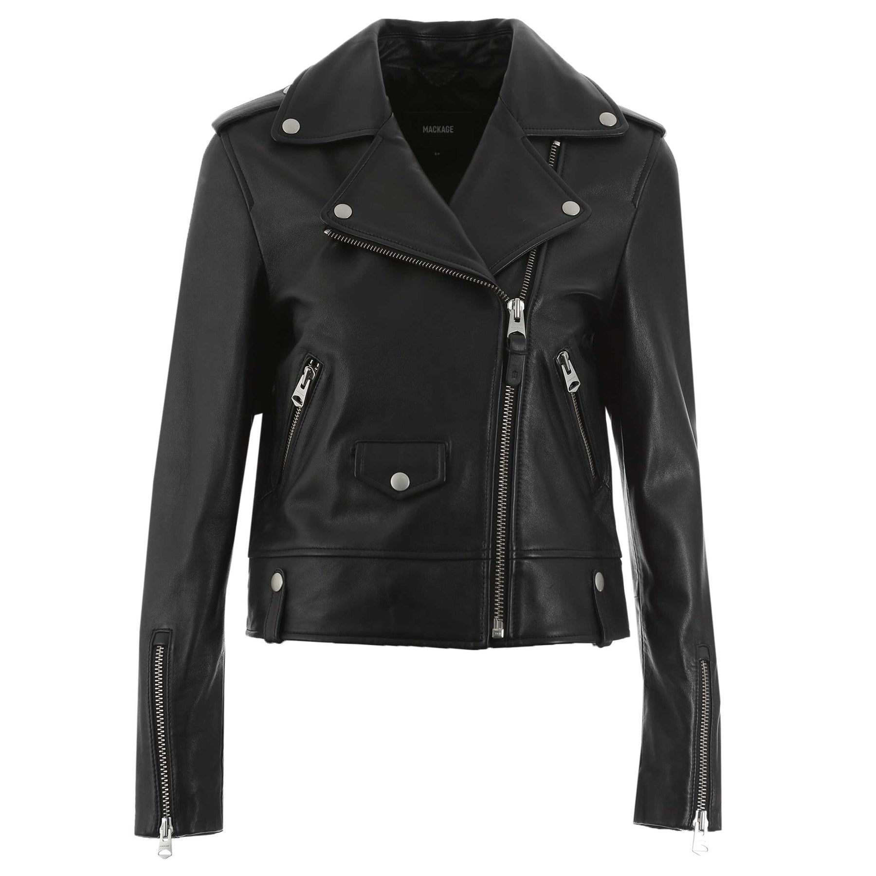 Mackage Baya R Ladies Leather Jacket in Black. Biker style leather jacket by Mackage. This relaxed fit leather arrives with asymmetrical zip fastening and snap closure to the collar. Zip fastening pockets the front of the jacket. Snap fastening ticket pocket. Zip cuffs.