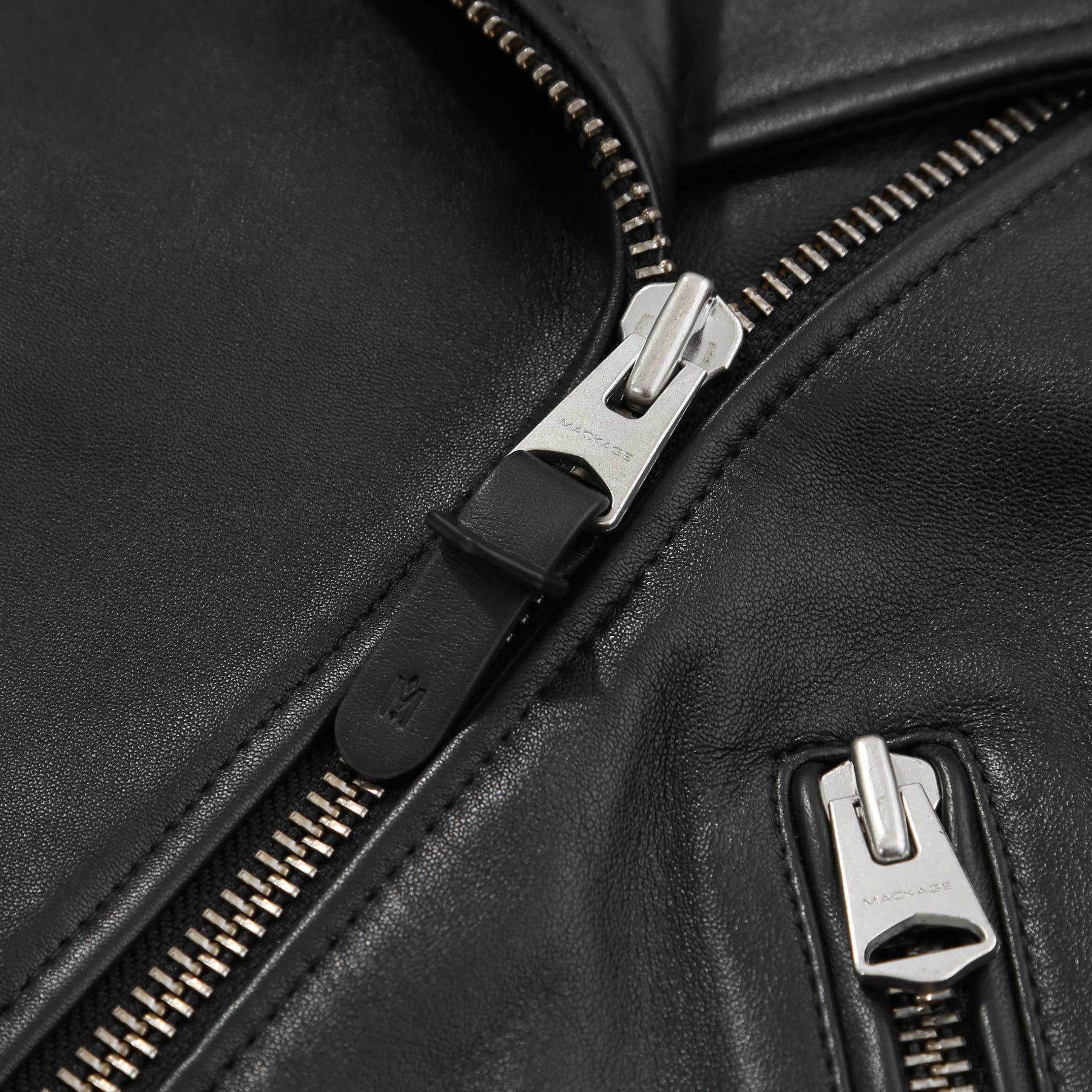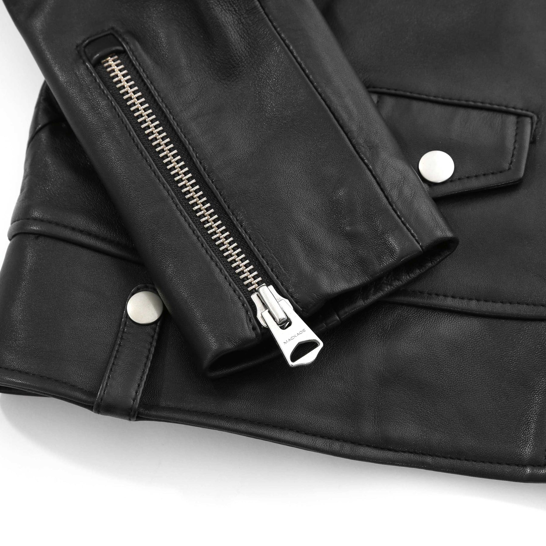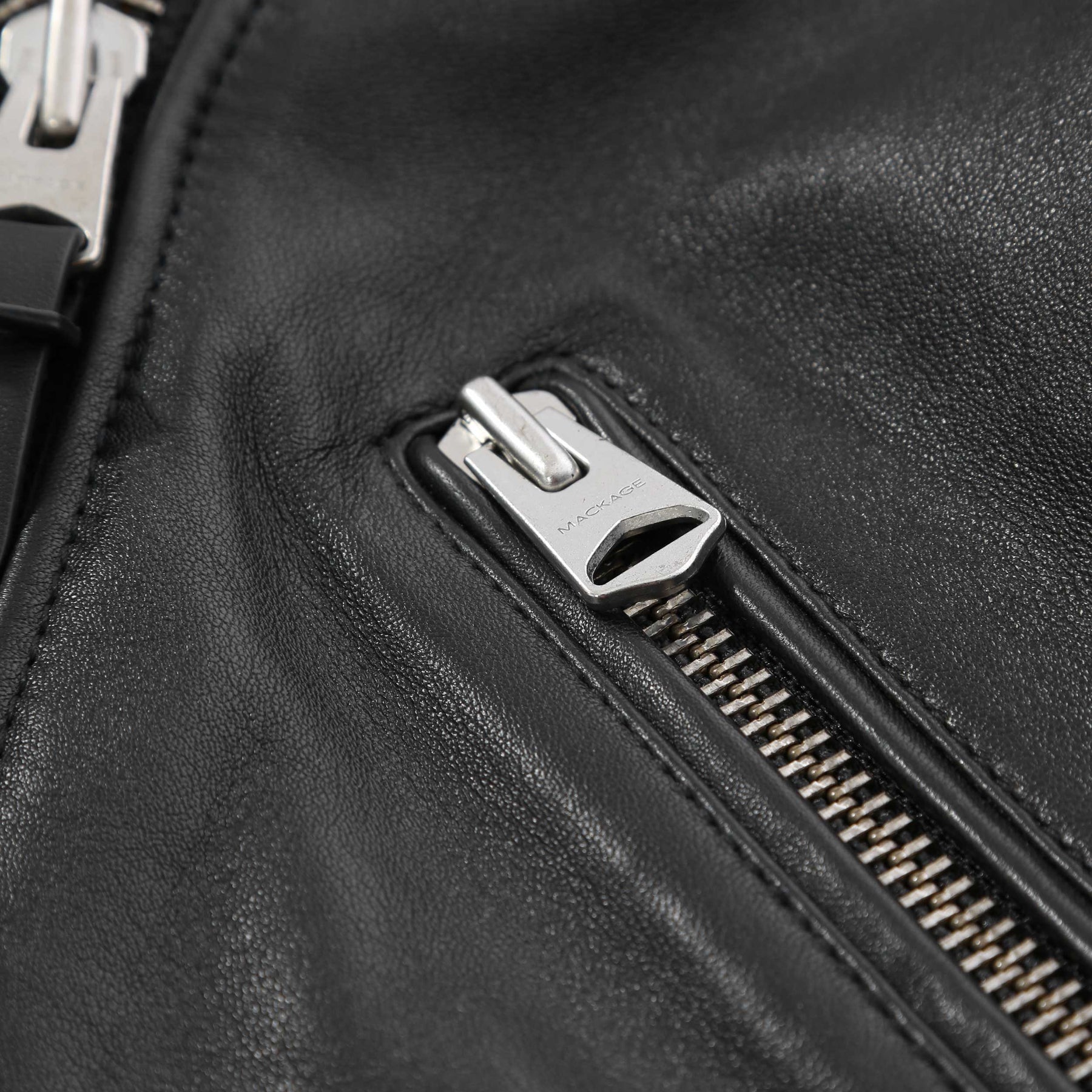 Mackage Baya R Ladies Leather Jacket in Black. Biker style leather jacket by Mackage. This relaxed fit leather arrives with asymmetrical zip fastening and snap closure to the collar. Zip fastening pockets the front of the jacket. Snap fastening ticket pocket. Zip cuffs.
