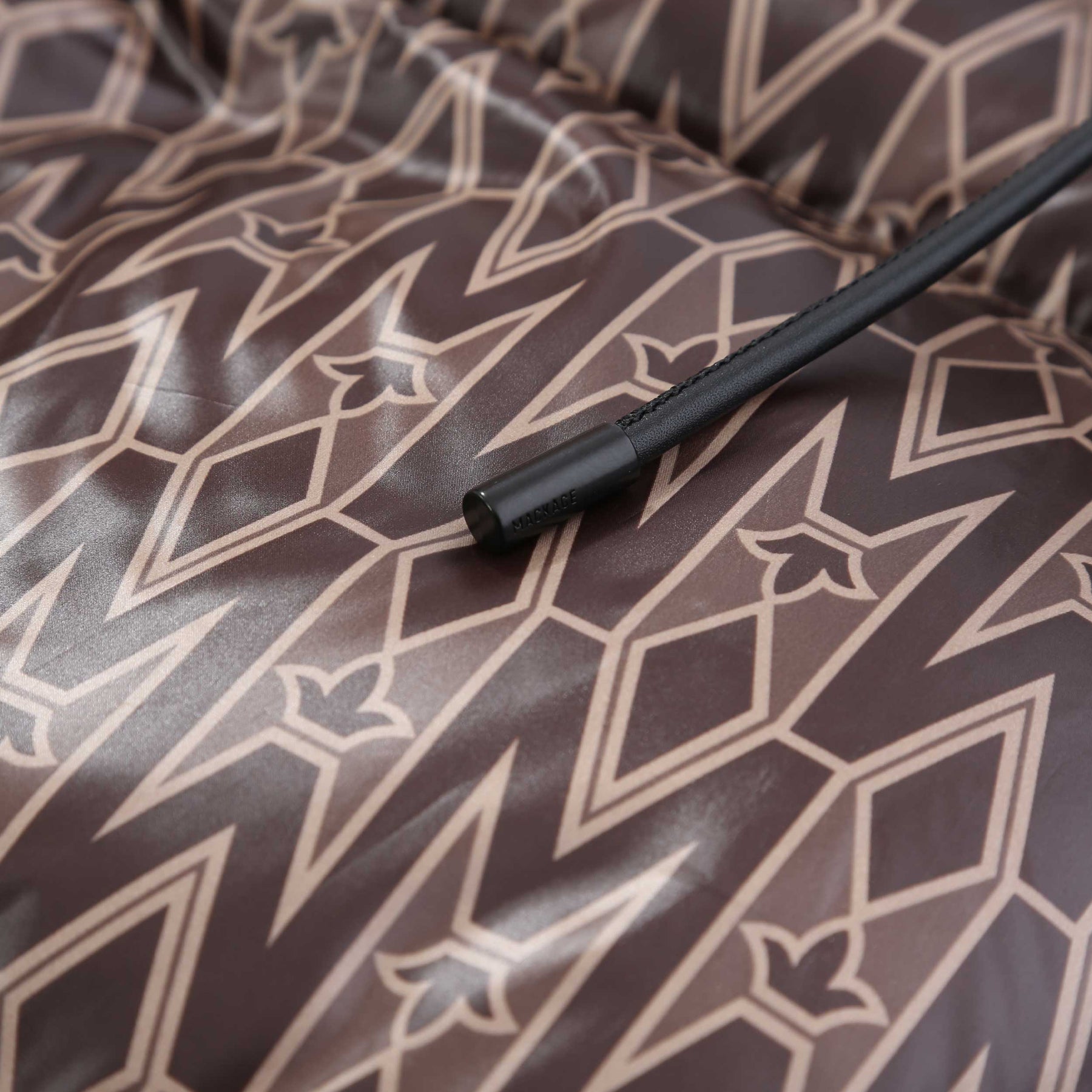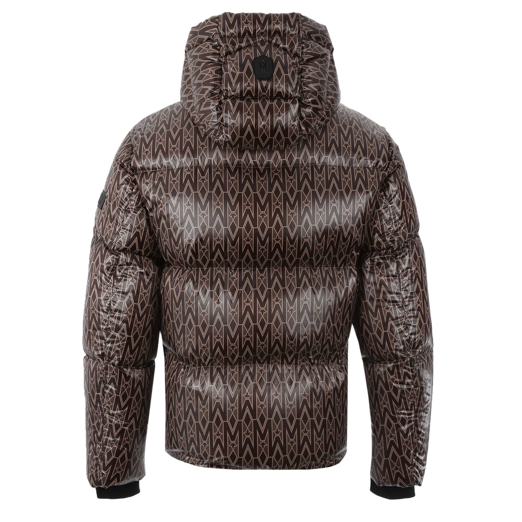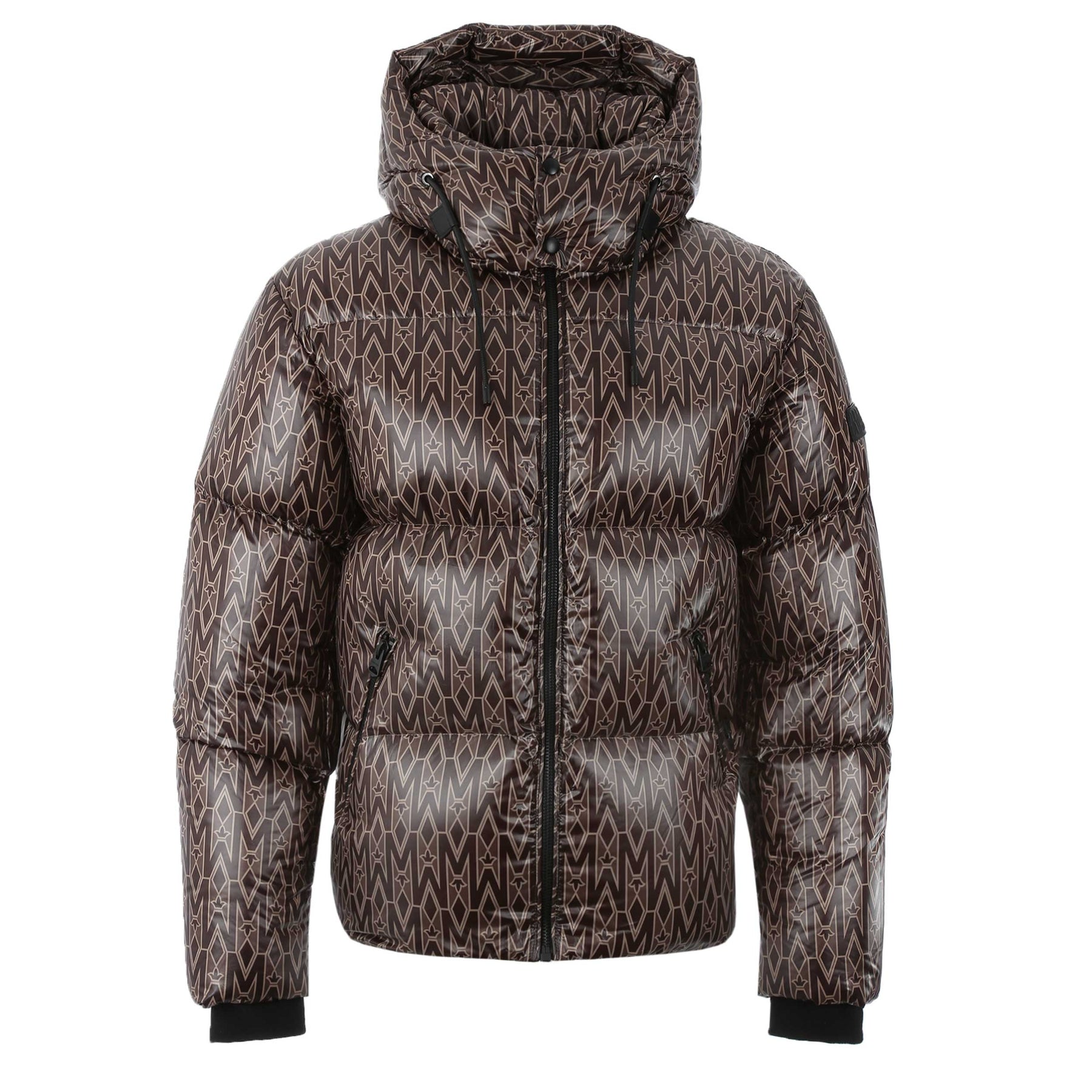 Mackage Kent MG Jacket in Coffee. A mid length high shine jacket by Mackage. Full zip fastening jacket featuring insulated zip pockets and an adjustable hood. All over Mackage logo print design to the jacket. Detachable hood and 2 full zip fastening pockets. Storm cuffs. Finished with the signature Mackage logo on the sleeve.
