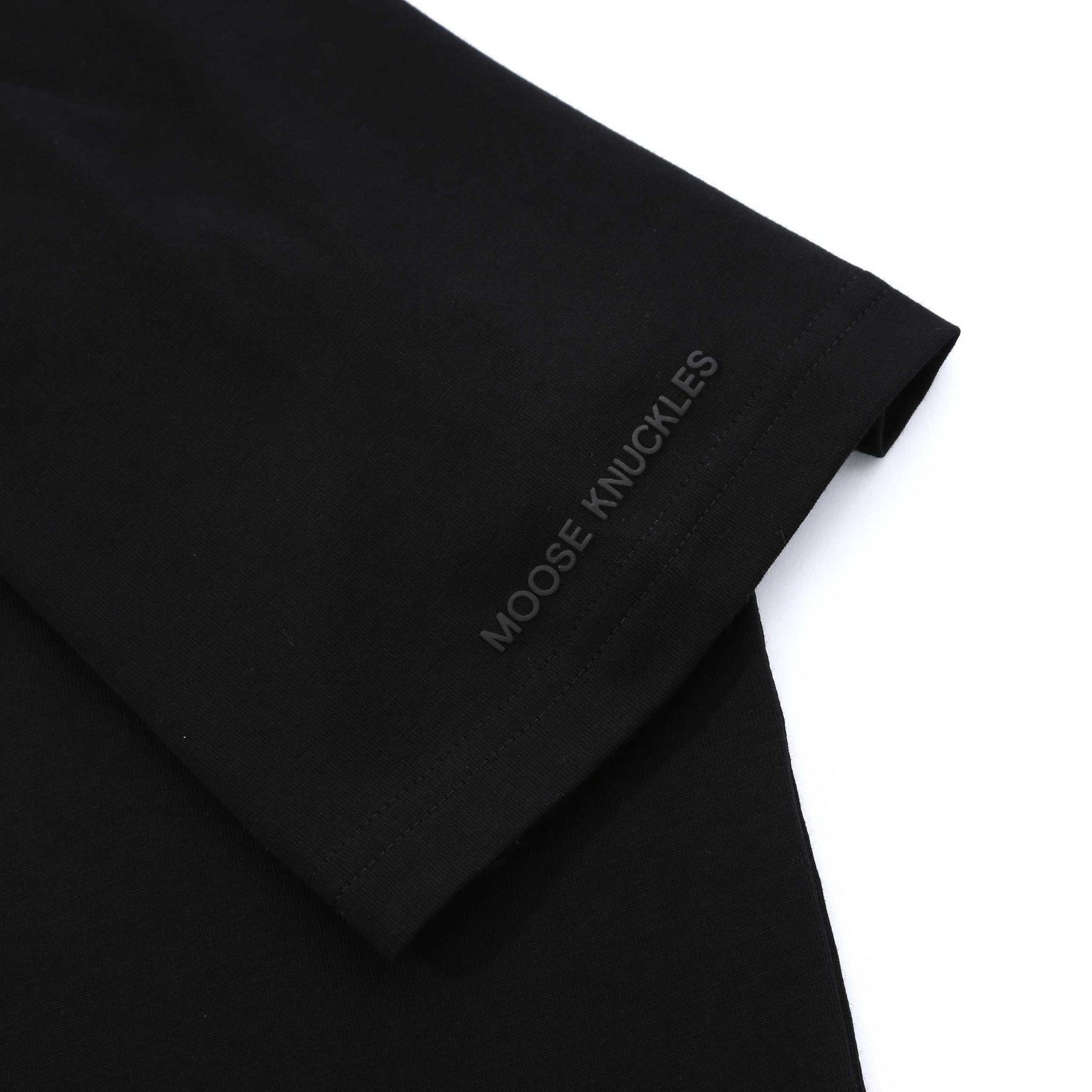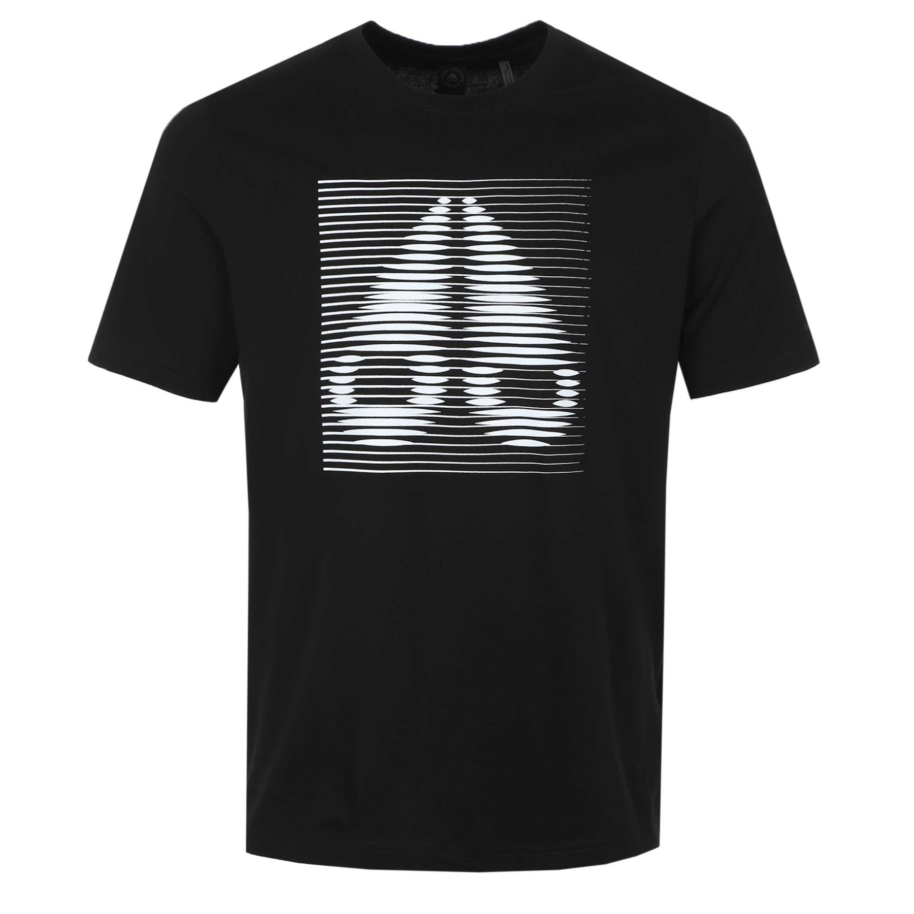 Moose Knuckles Raydaze Tee T-Shirt in Black. A classic t-shirt by Moose Knuckles. This t-shirt has short sleeves and a crew neck. It is designed with a printed, distorted Moose Knuckles logo on the front and tonal Moose Knuckles branding on the sleeve.