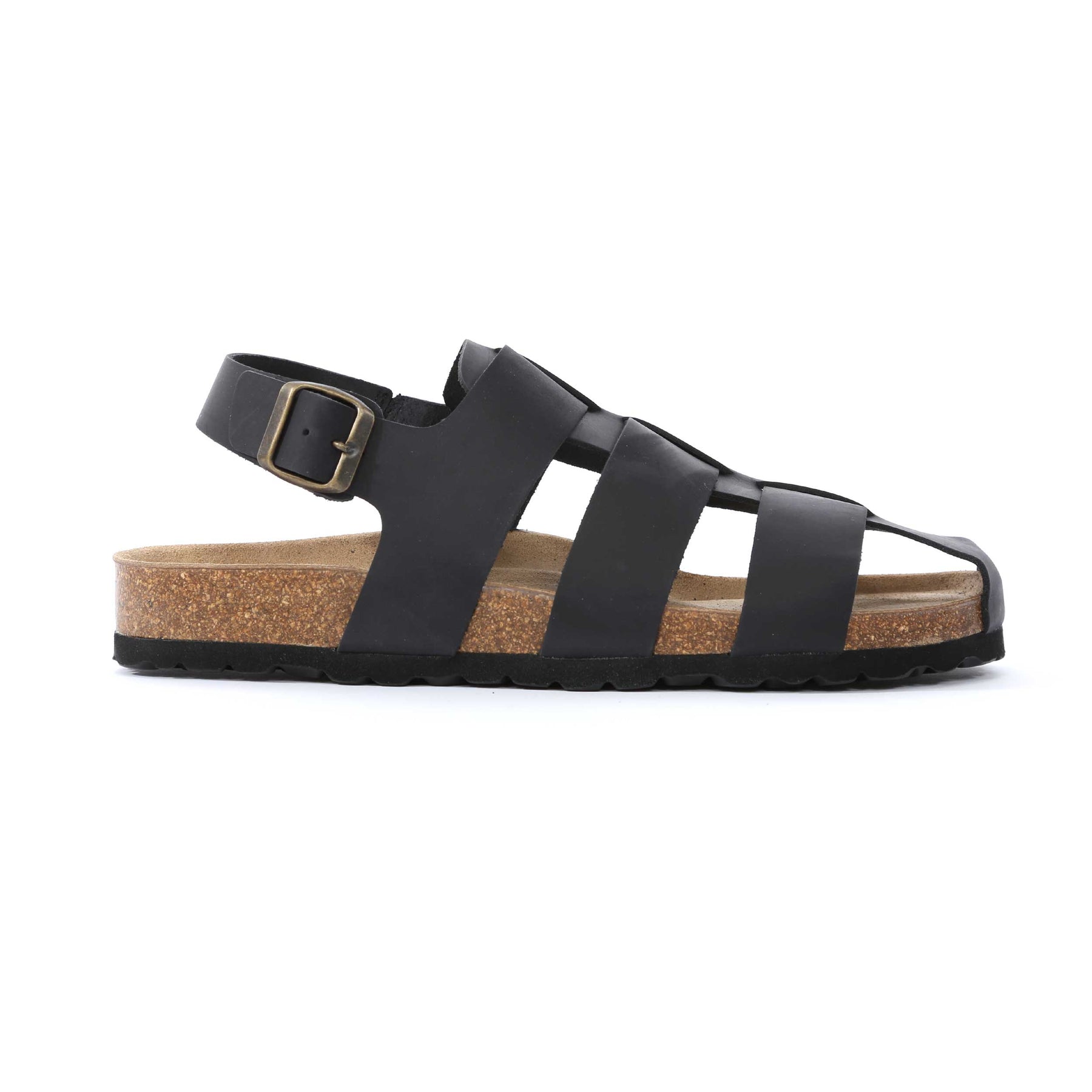 Oliver Sweeney Astorga Sandal in Black. Sandal by Oliver Sweeney. This Fisherman’s Sandal delivers timeless summer style with refined craftsmanship and everyday comfort. Inspired by the traditional woven strap design, the breathable upper allows airflow and water drainage, while a secure back strap ensures a stable, supportive fit. A central front strap enhances structure and provides added coverage for a confident, polished look. Made from premium black oiled calf nubuck leather, this luxury men’s sandal is finished with an antiqued brass buckle and three-hole adjustable fastening for a tailored fit. Underfoot, a moulded cork footbed is enhanced with an additional cushioning layer between the cork and leather sock lining, offering superior comfort for all-day wear. A lightweight, durable rubber outsole completes the design, delivering grip and practicality for city breaks, holidays, and warm-weather dressing.